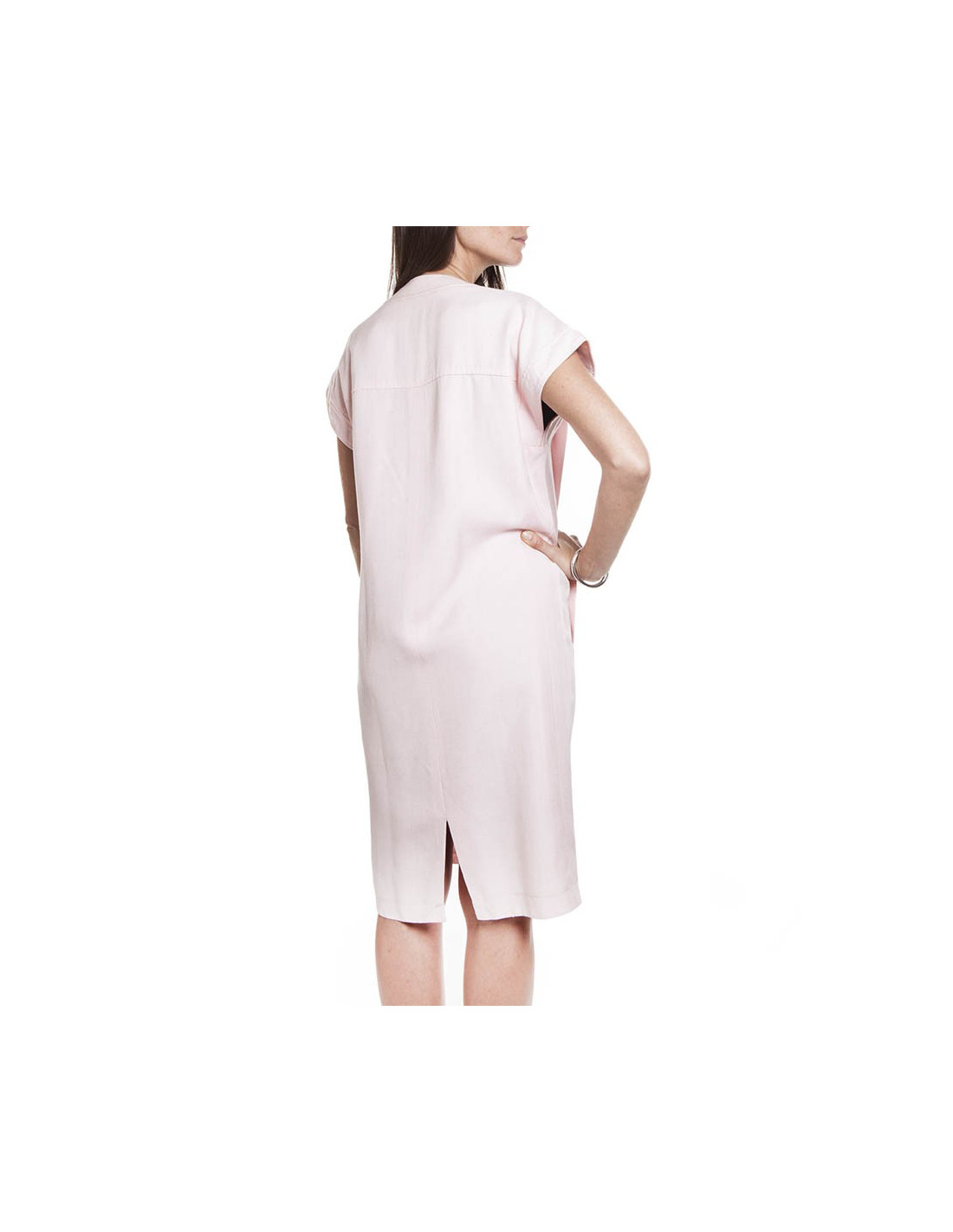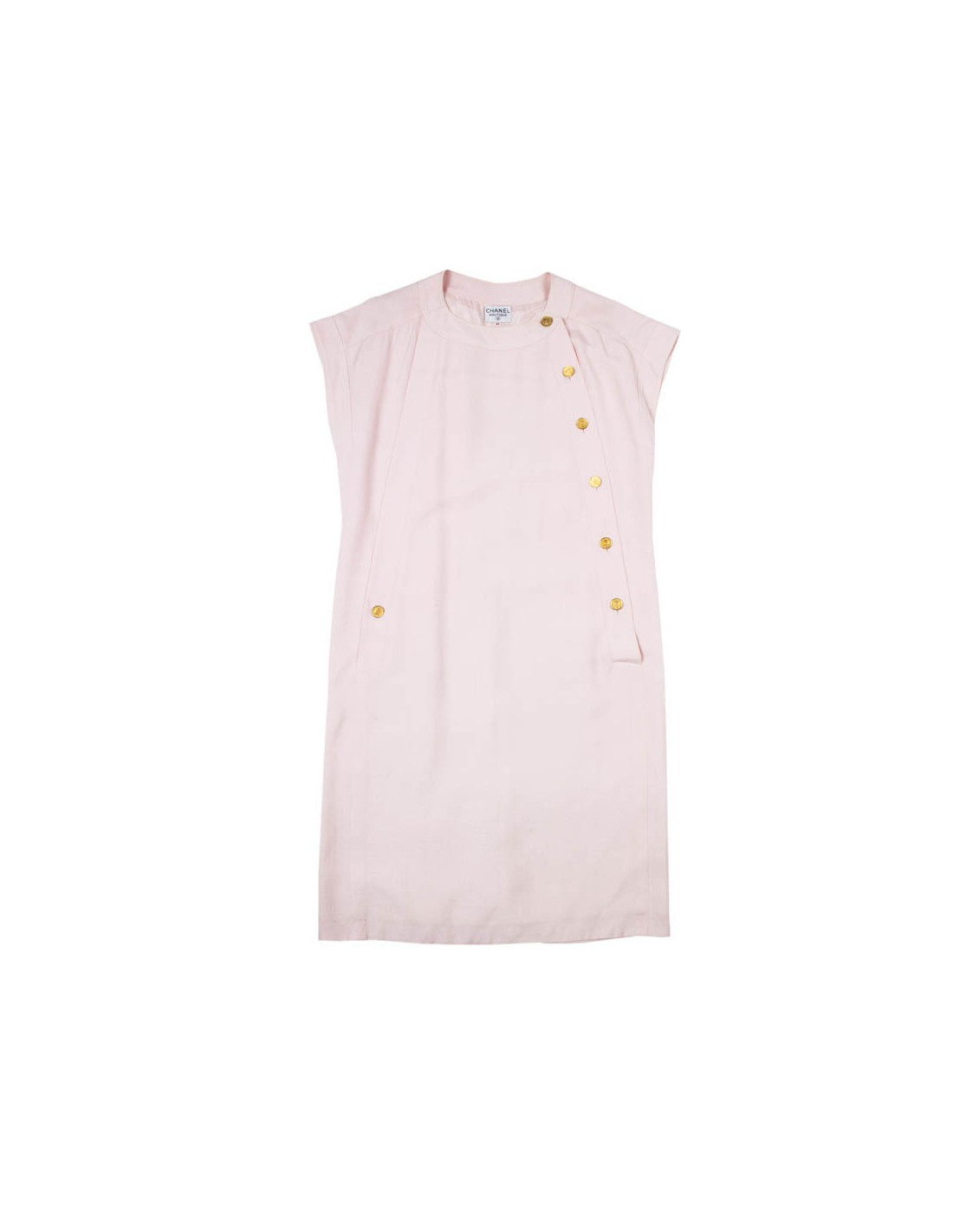 Très élégante robe CHANEL en coton rose qui se ferme à l'avant par 5 magnifiques boutons dorés à l'effigie de COCO CHANEL.