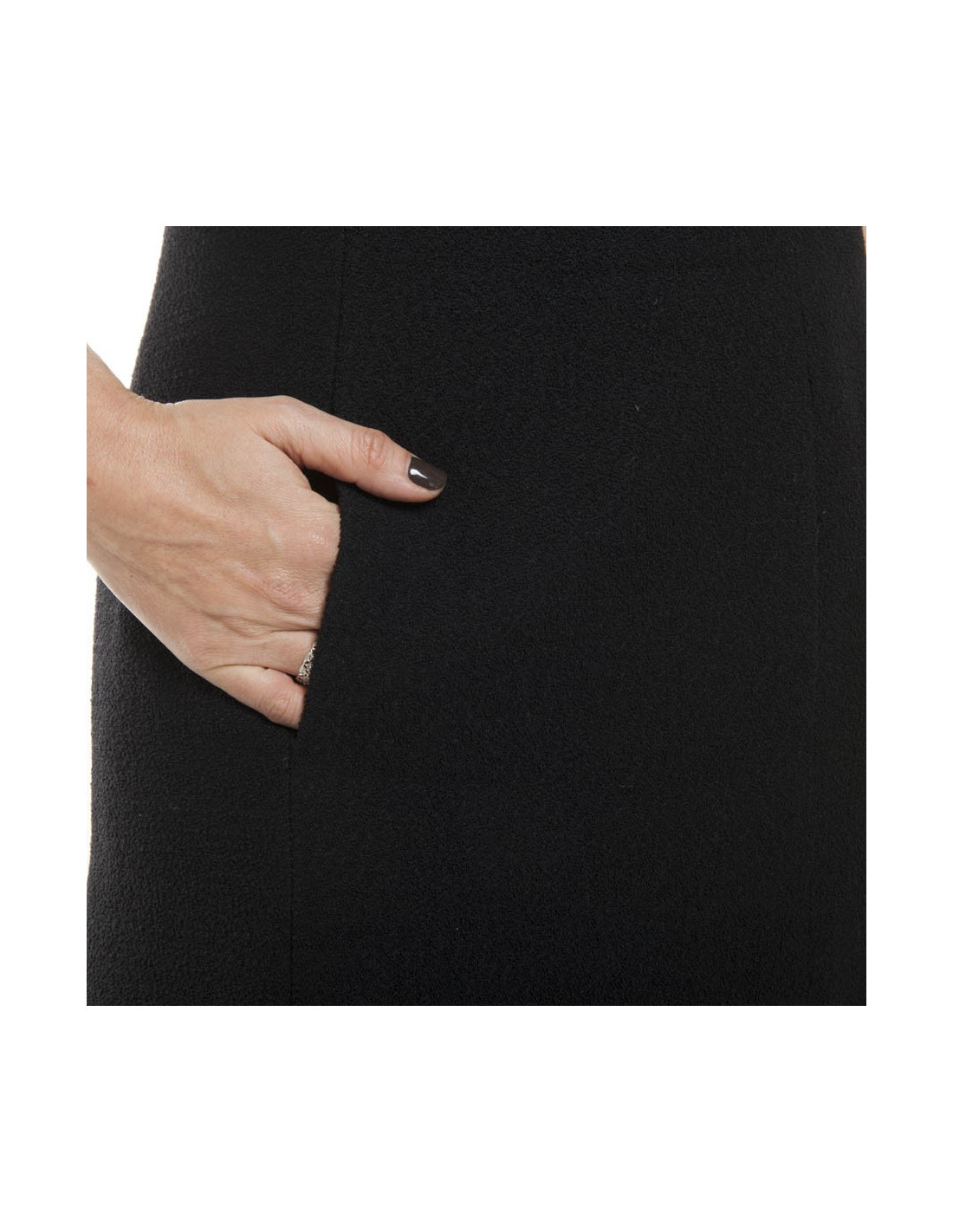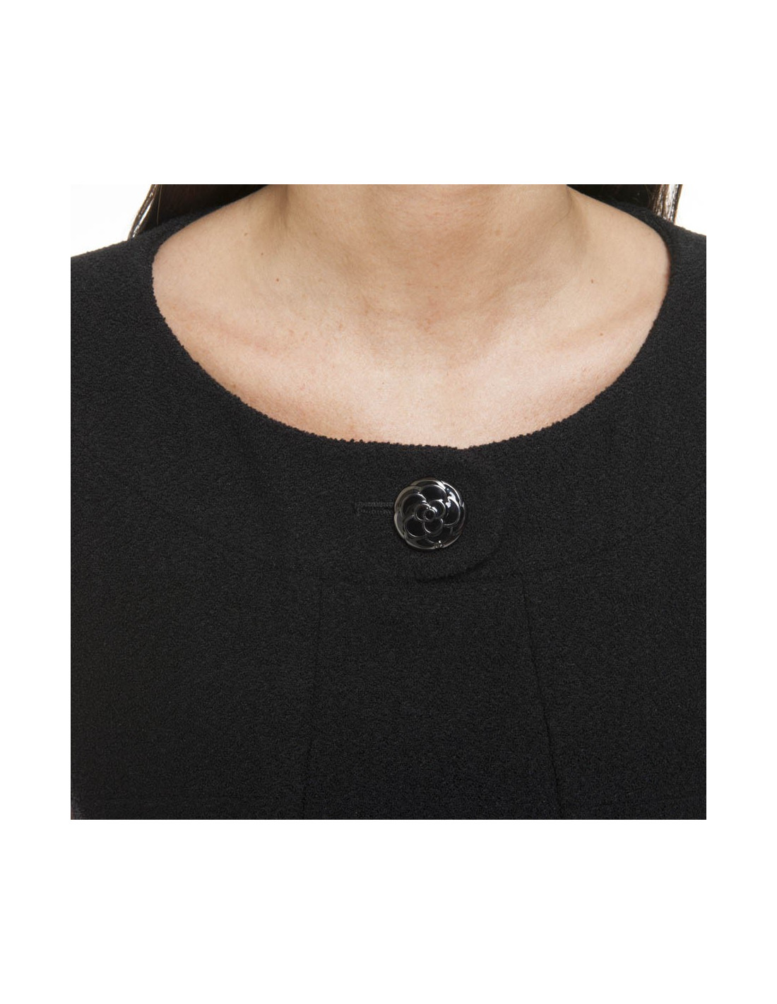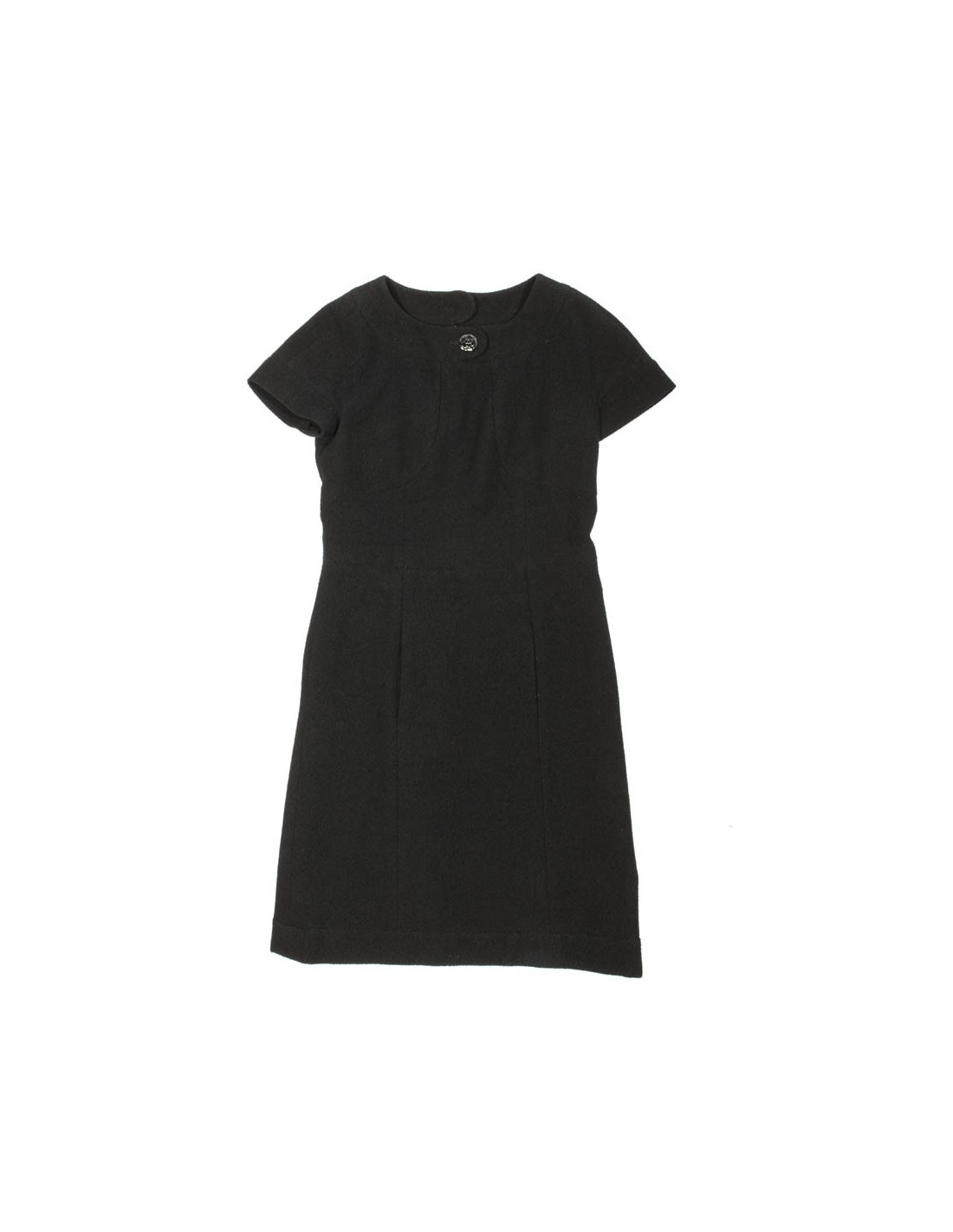 Robe Chanel en laine noire avec des découpes et 2 poches verticales à l'avant.