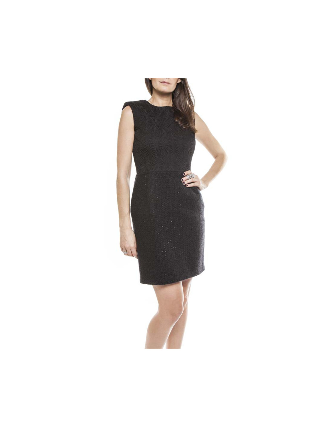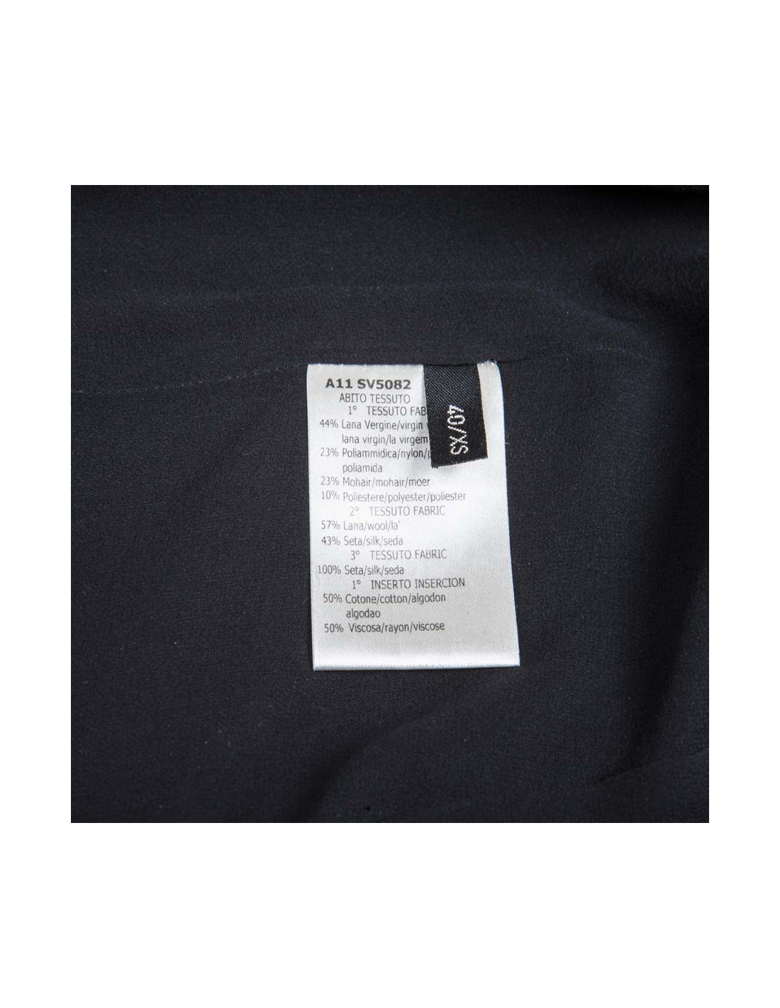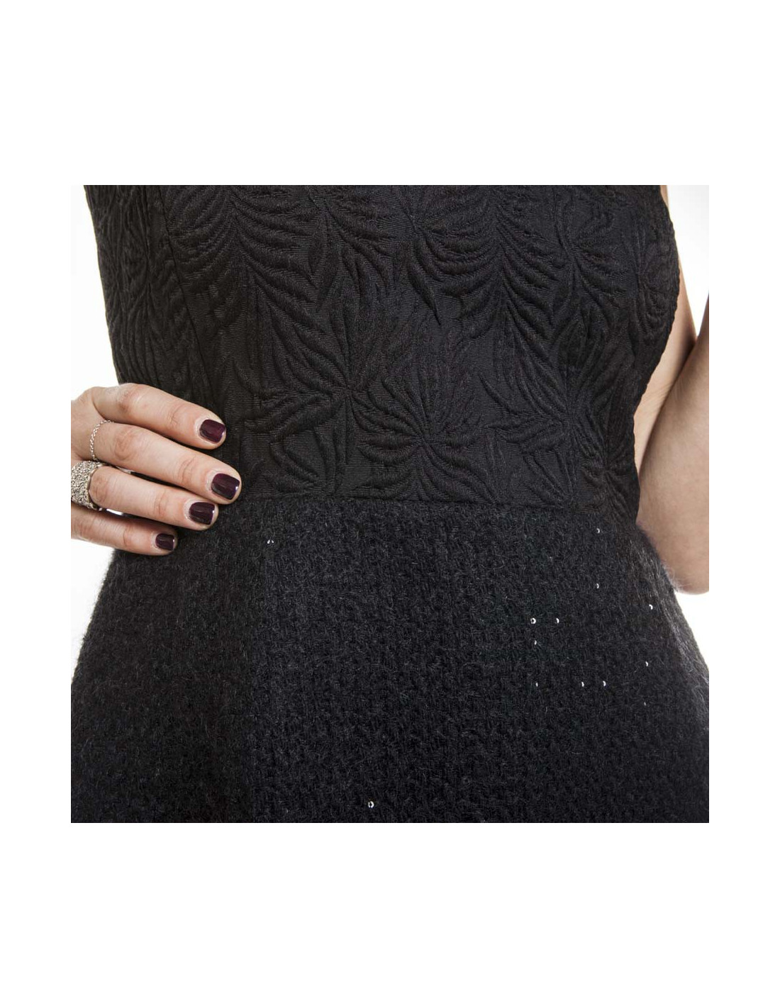 Le haut de la robe est en broché noir et à partir de la taille jusqu'en bas en laine lamée noire.
