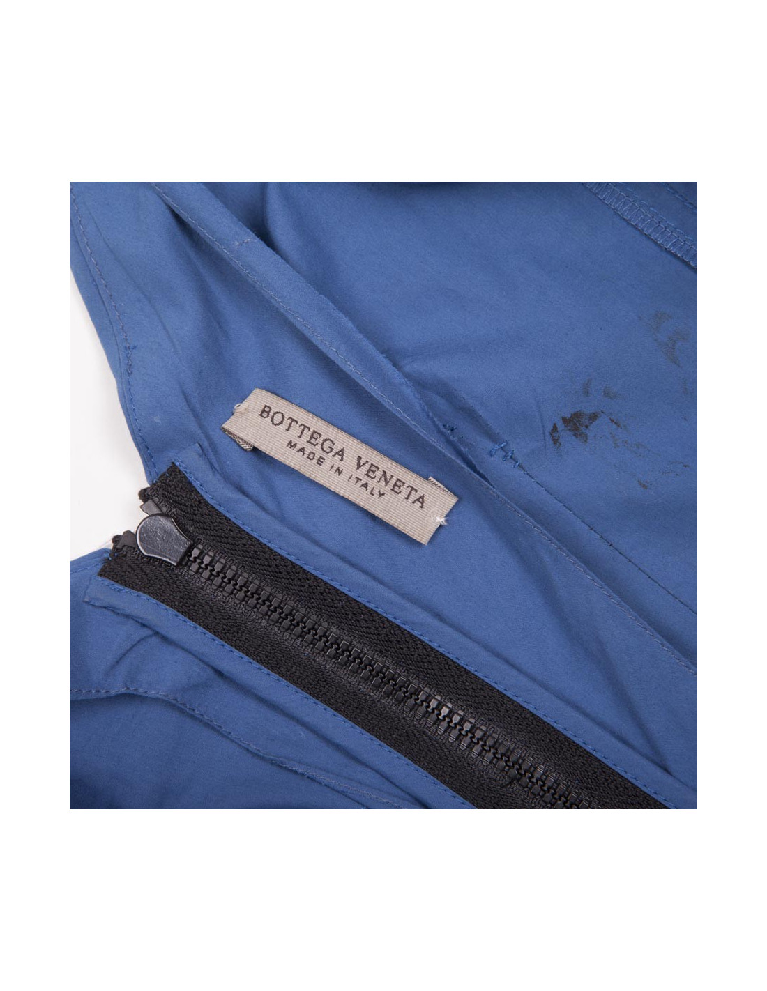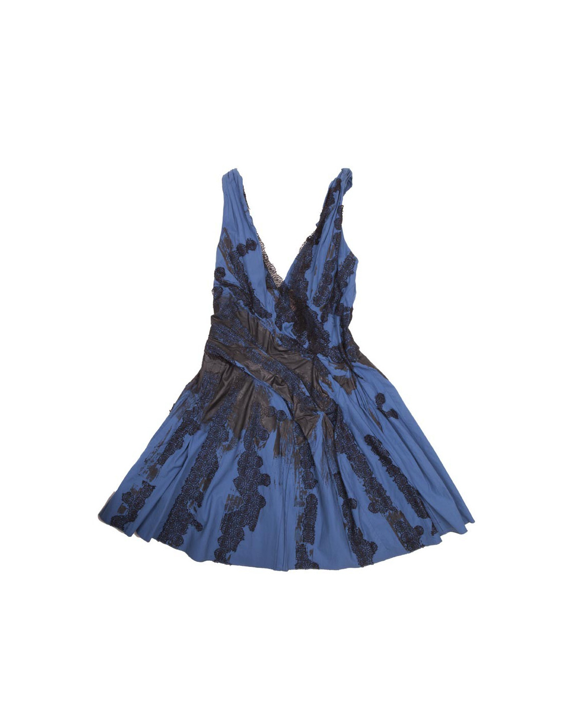 Robe courte BOTTEGA VENETA, taille 34 FR (absence d'étiquette de taille et de matière), en coton bleu sur le lequel est appliqué une dentelle noire et de la peinture noire satinée (voir photos). Fermeture éclair le long du dos (38 cm de longueur).