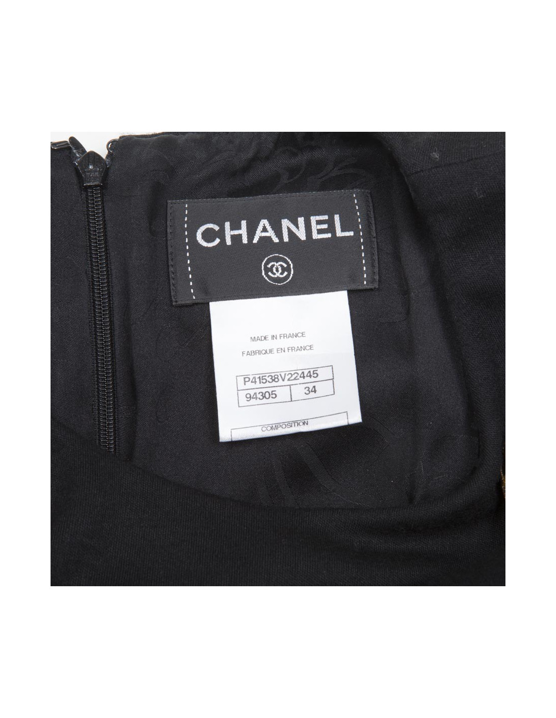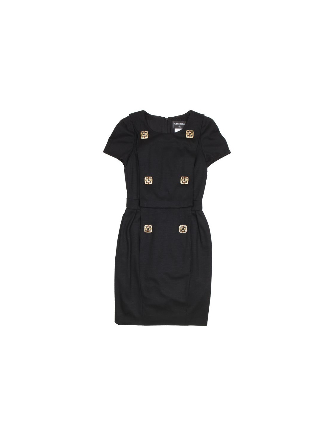Robe Chanel en jersey noir T 34 doublée de soie en très bon état. Le col est rond, un plastron orne le devant de la robe agrémenté par 4 boutons couture dorés or pâle avec des cabochons en résine topaze, marron et dorés, siglés aux 4 coins du "CC" .
