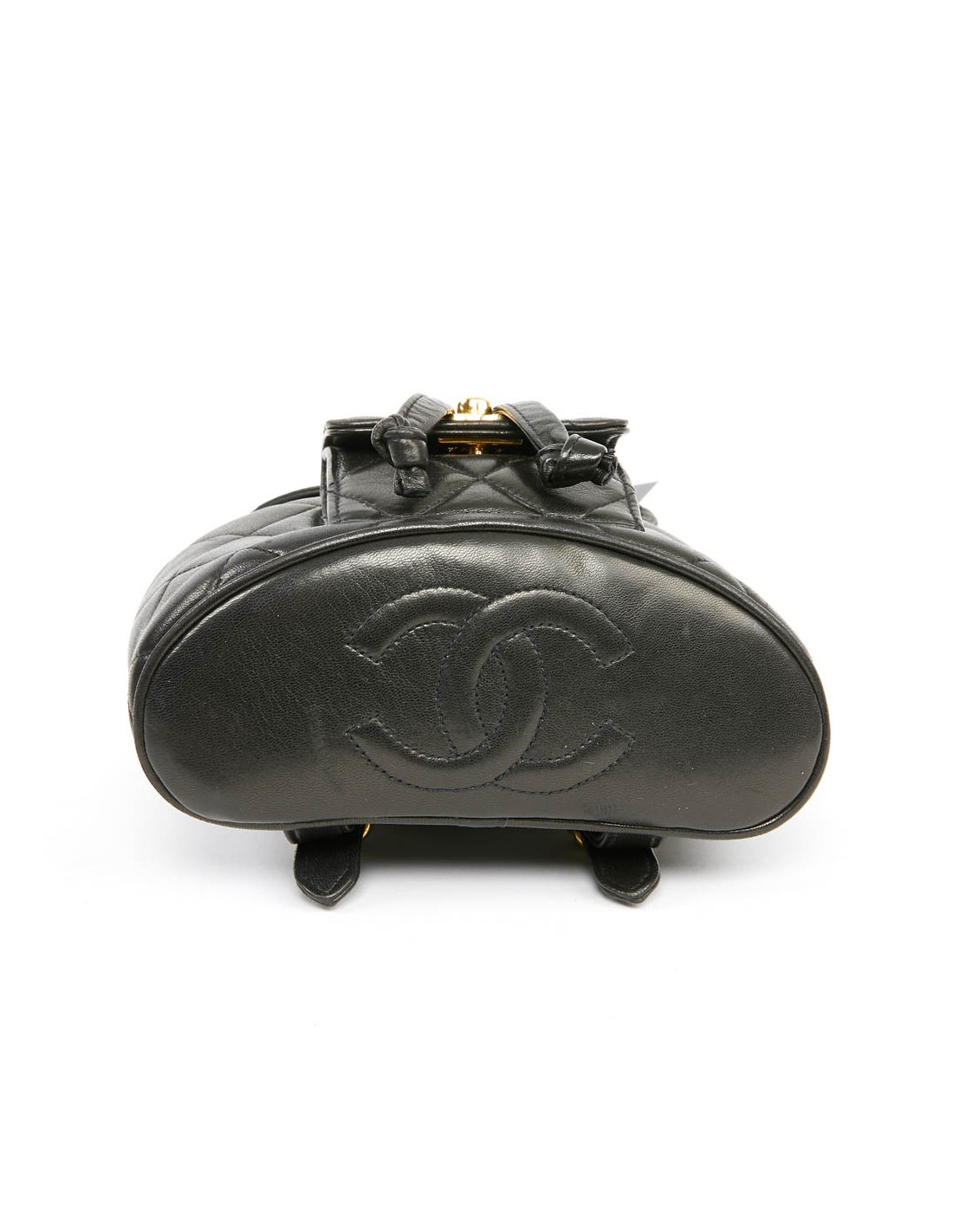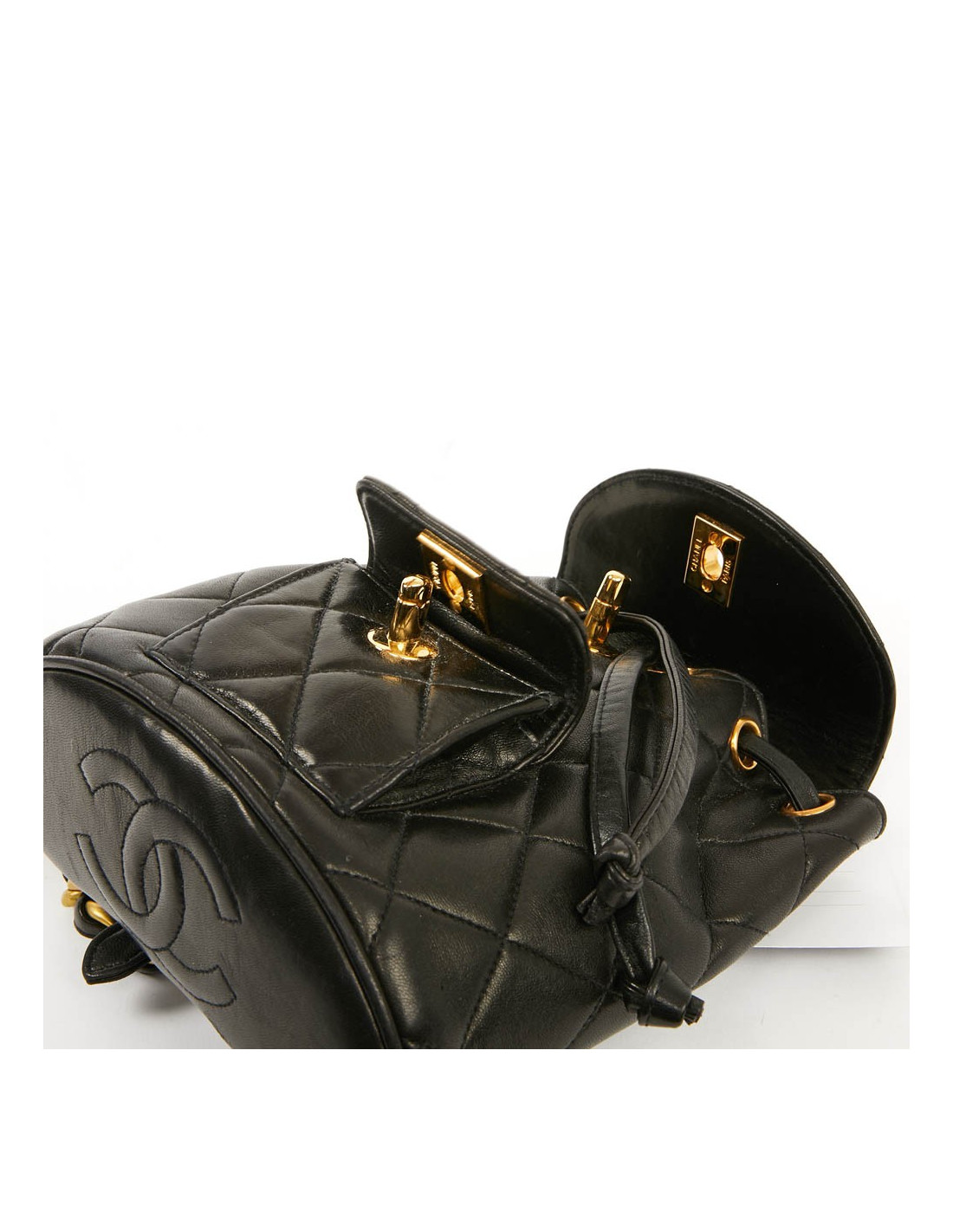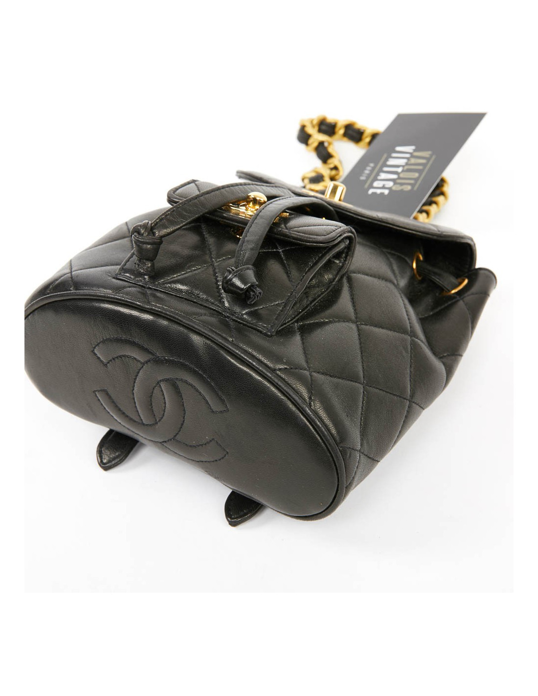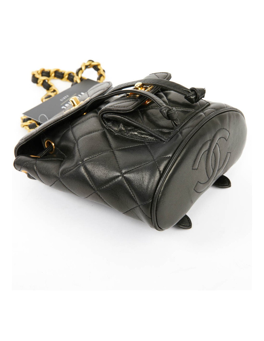 Mini sac à dos CHANEL cuir d'agneau noir. Il est matelassé avec une petite poche extérieure.