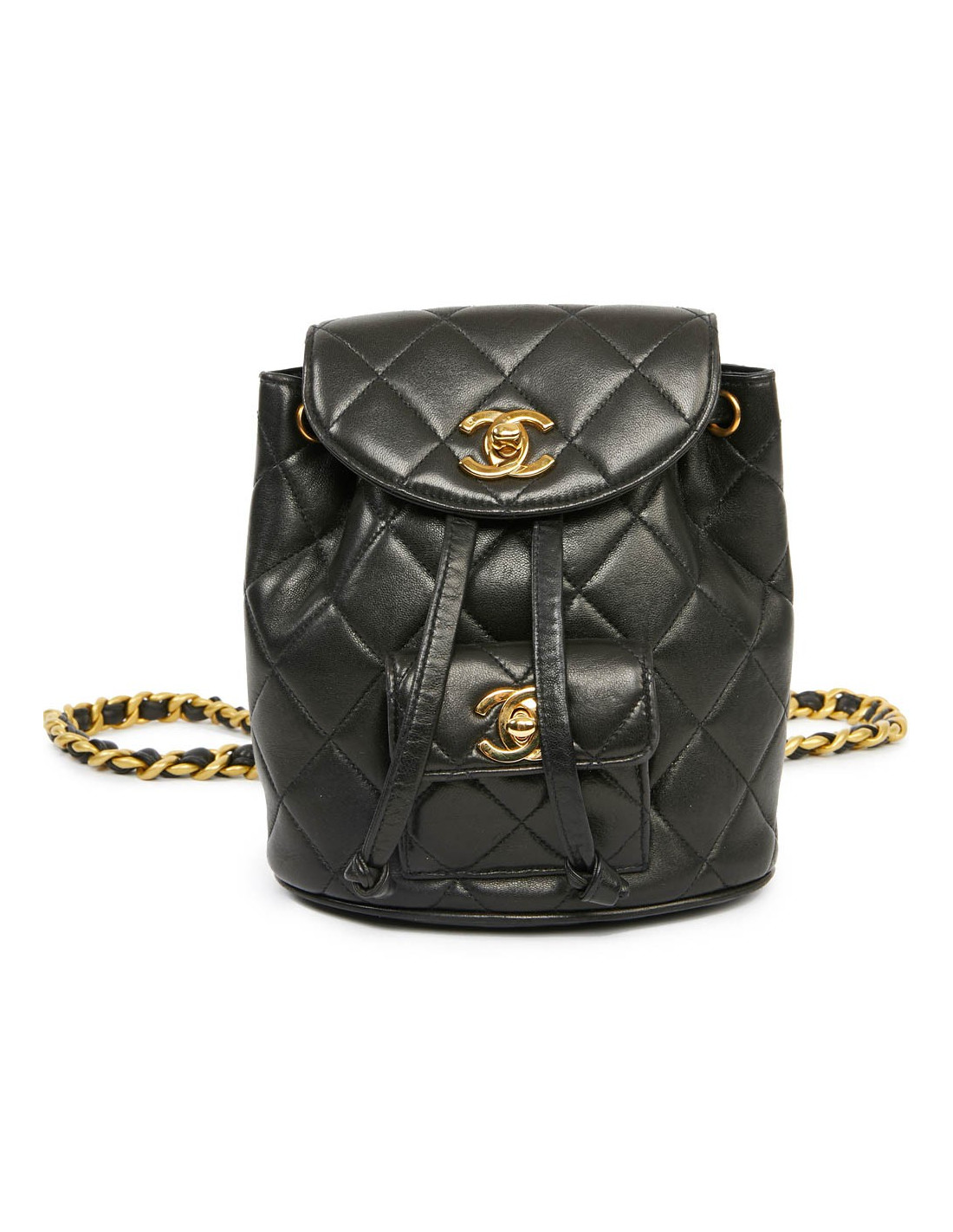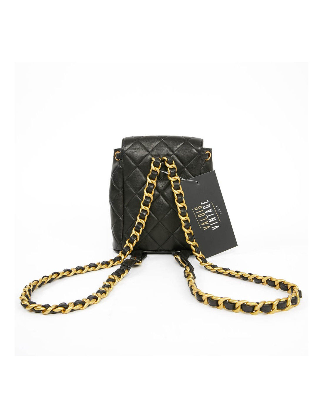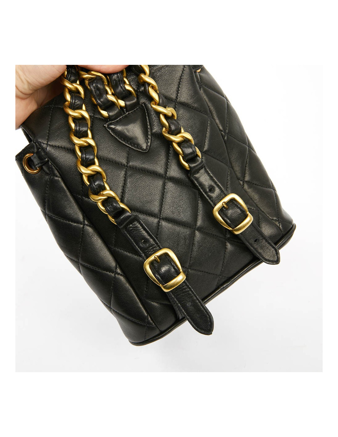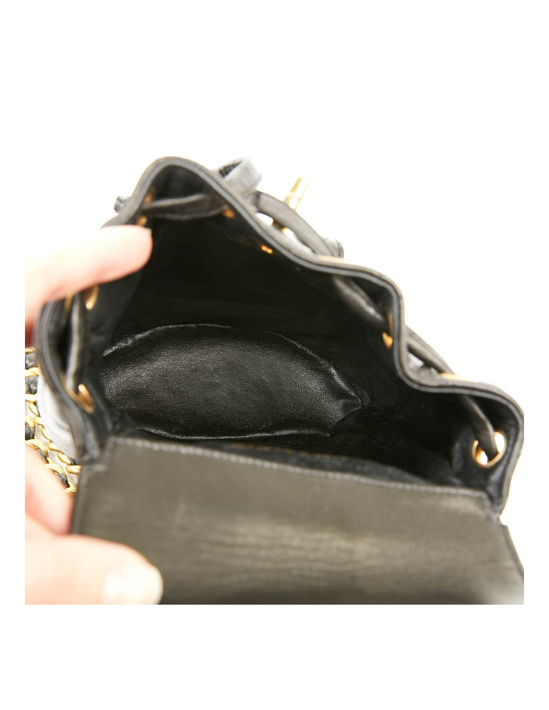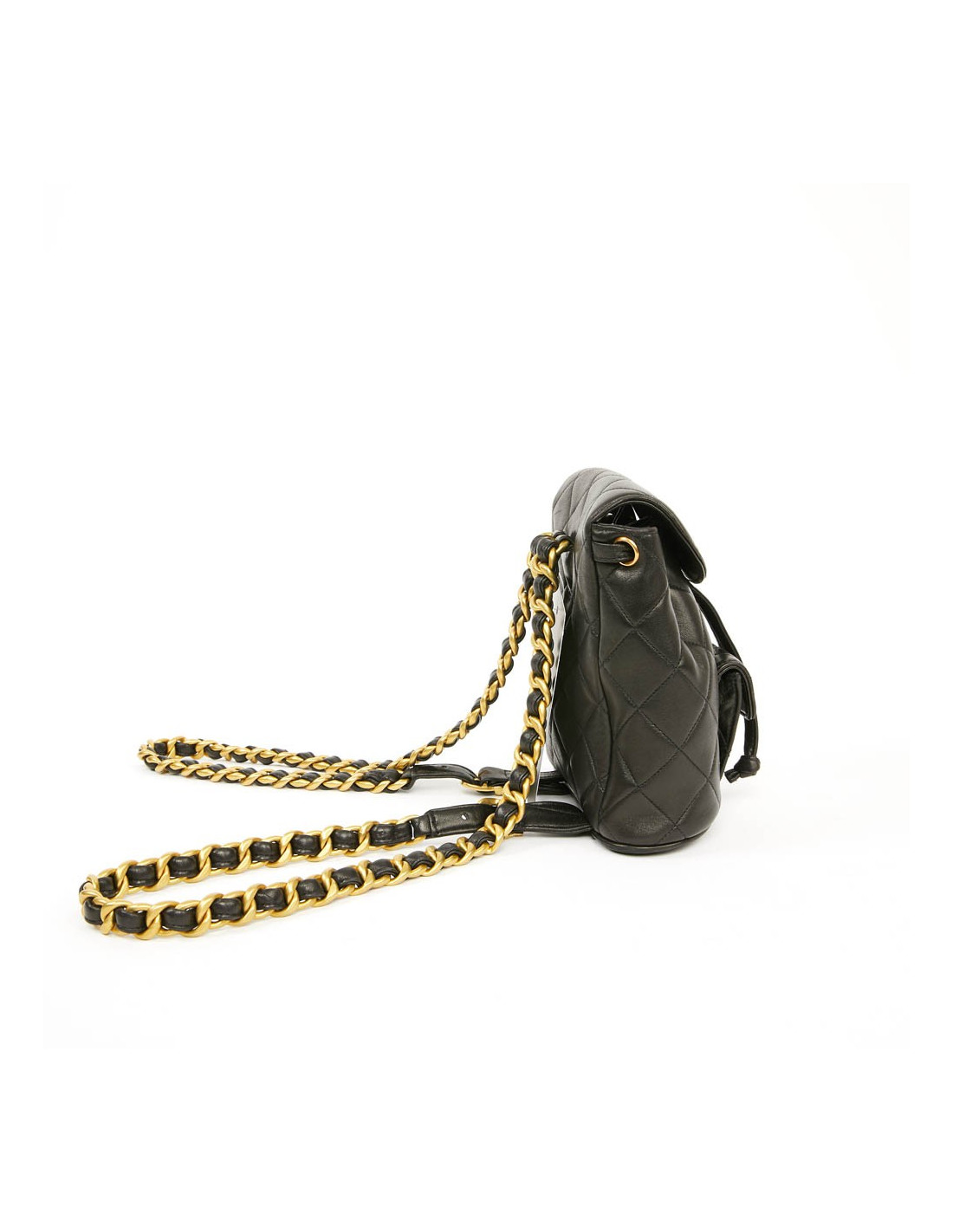 Mini sac à dos CHANEL cuir d'agneau noir. Il est matelassé avec une petite poche extérieure.