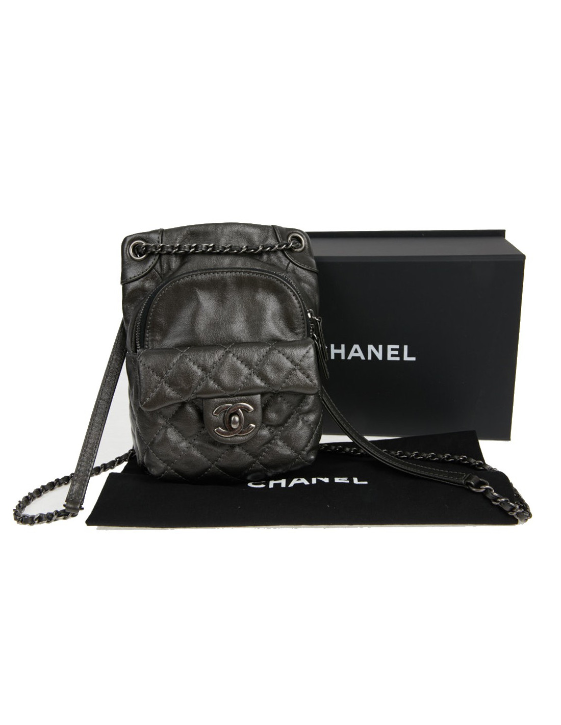 Mini sac à dos Chanel en cuir d’agneau de couleur gris anthracite. Il n’a jamais été porté. Il est doublé en cuir et toile noire. Modèle rare et trendy. Facile à porter même sur l’épaule.