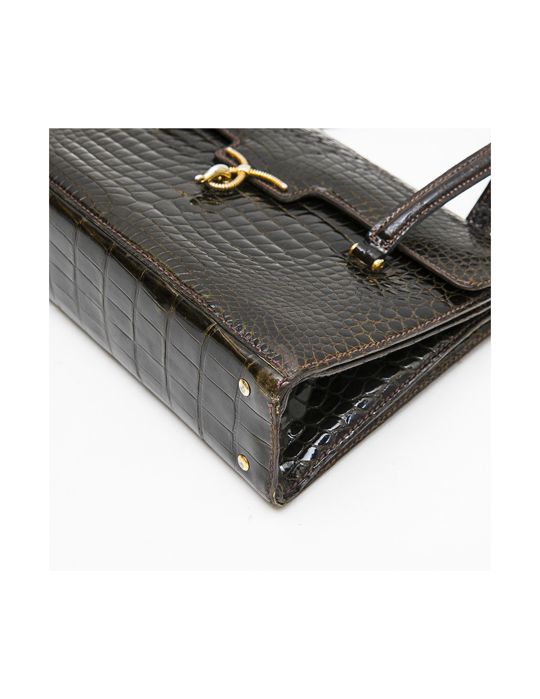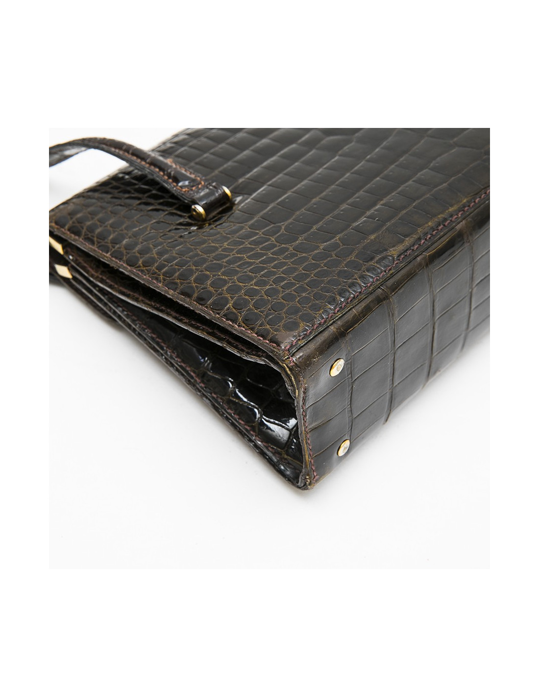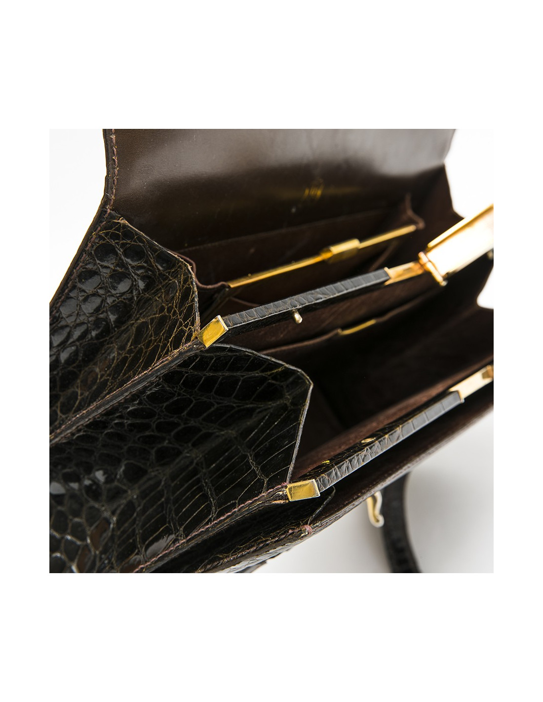 Collector. Sac 70's vintage en crocodile porosus marron, marque Grimaldi. Bijouterie dorée. L'intérieur est en cuir d'agneau lisse avec 2 soufflets. Le premier a 2 poches dont une fermée, la seconde a une poche ouverte.
