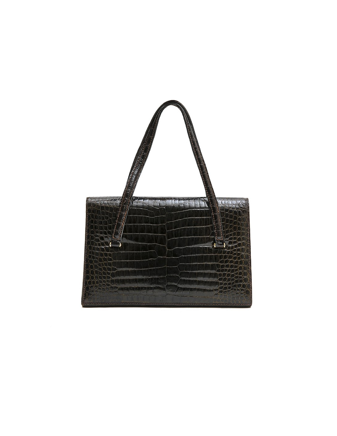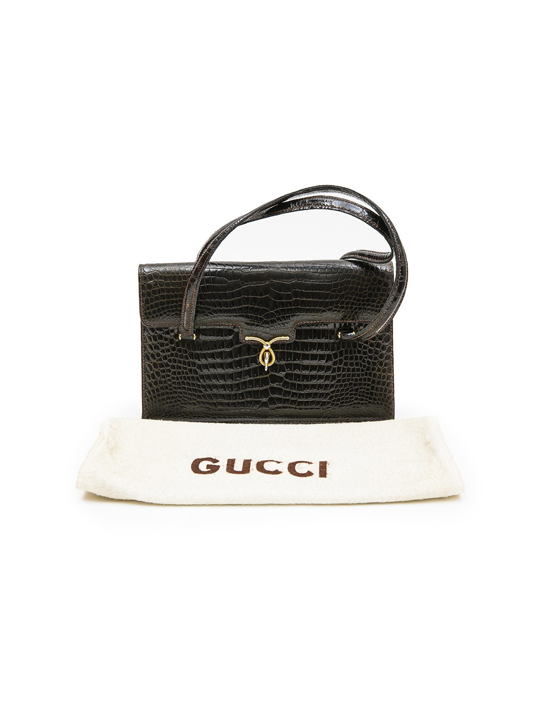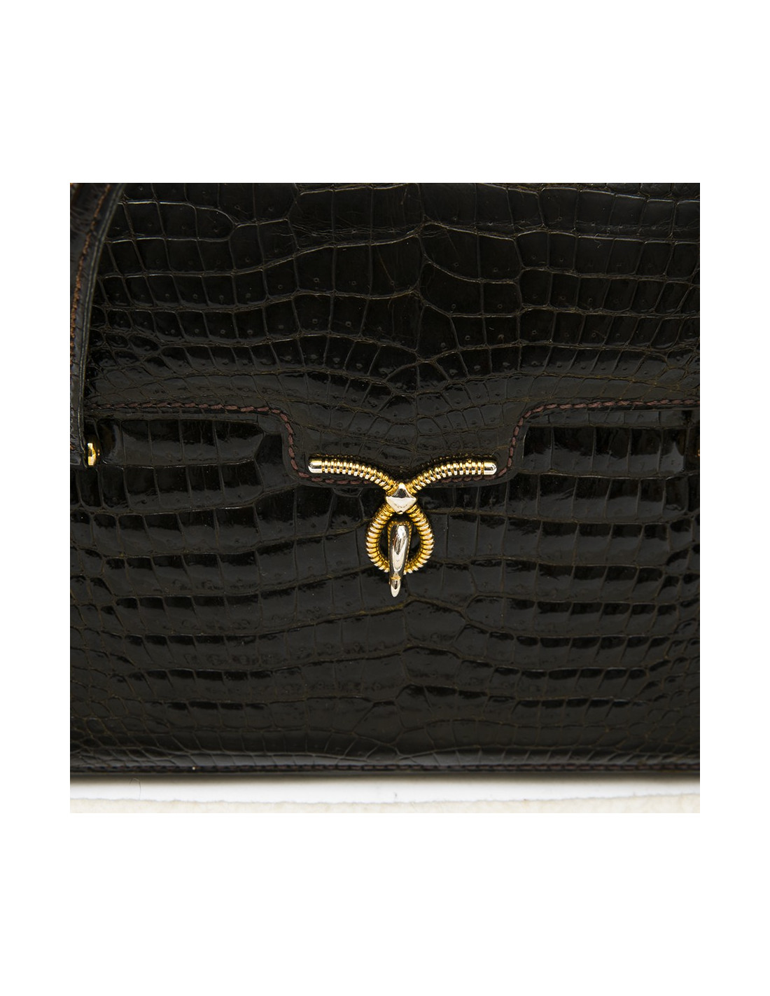 Collector. Sac 70's vintage en crocodile porosus marron, marque Grimaldi. Bijouterie dorée. L'intérieur est en cuir d'agneau lisse avec 2 soufflets. Le premier a 2 poches dont une fermée, la seconde a une poche ouverte.