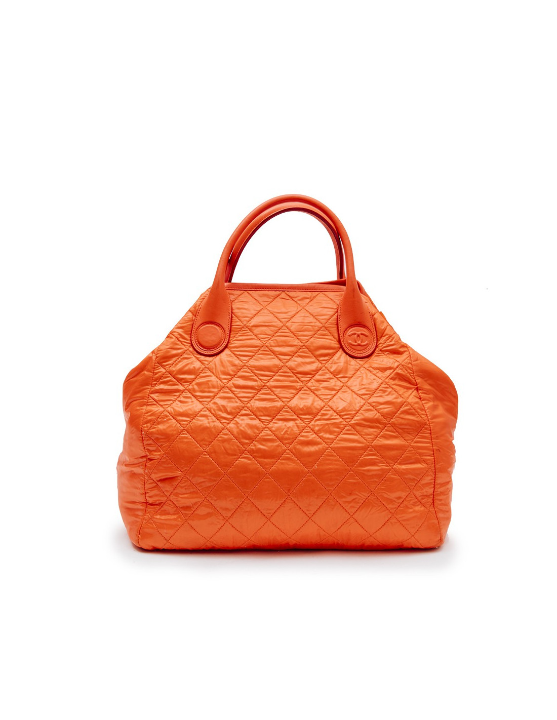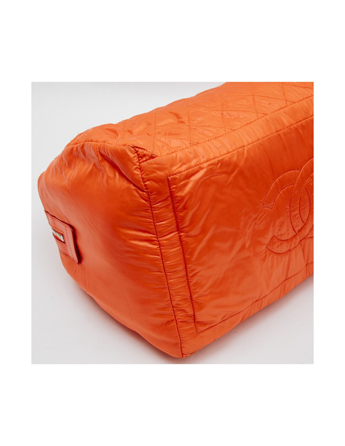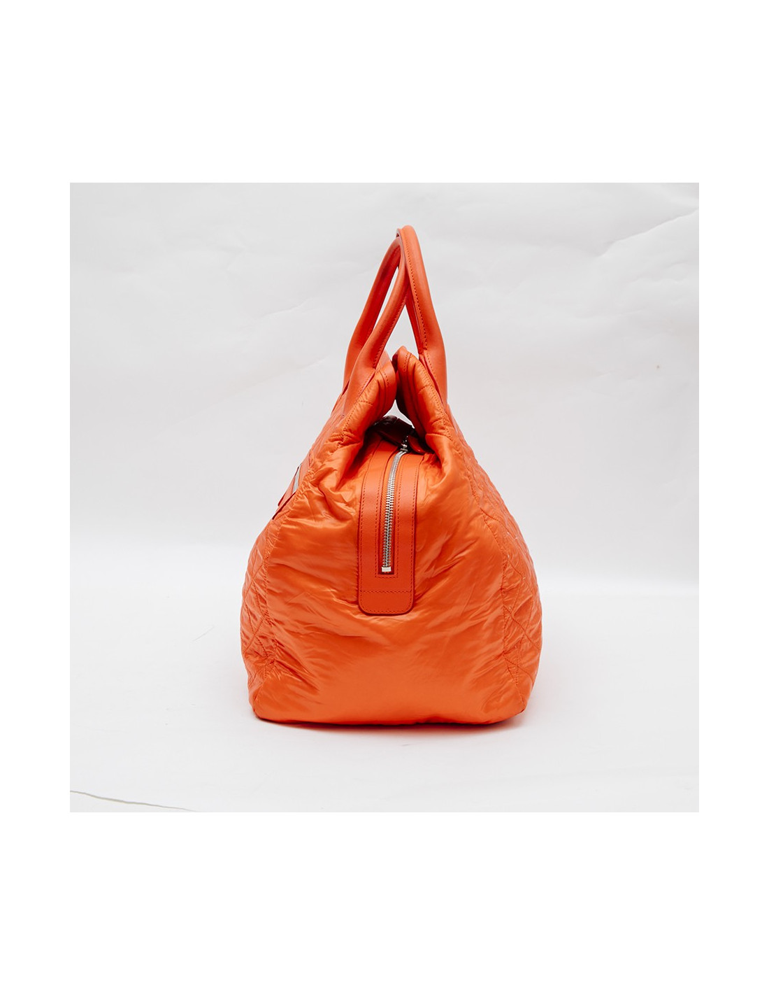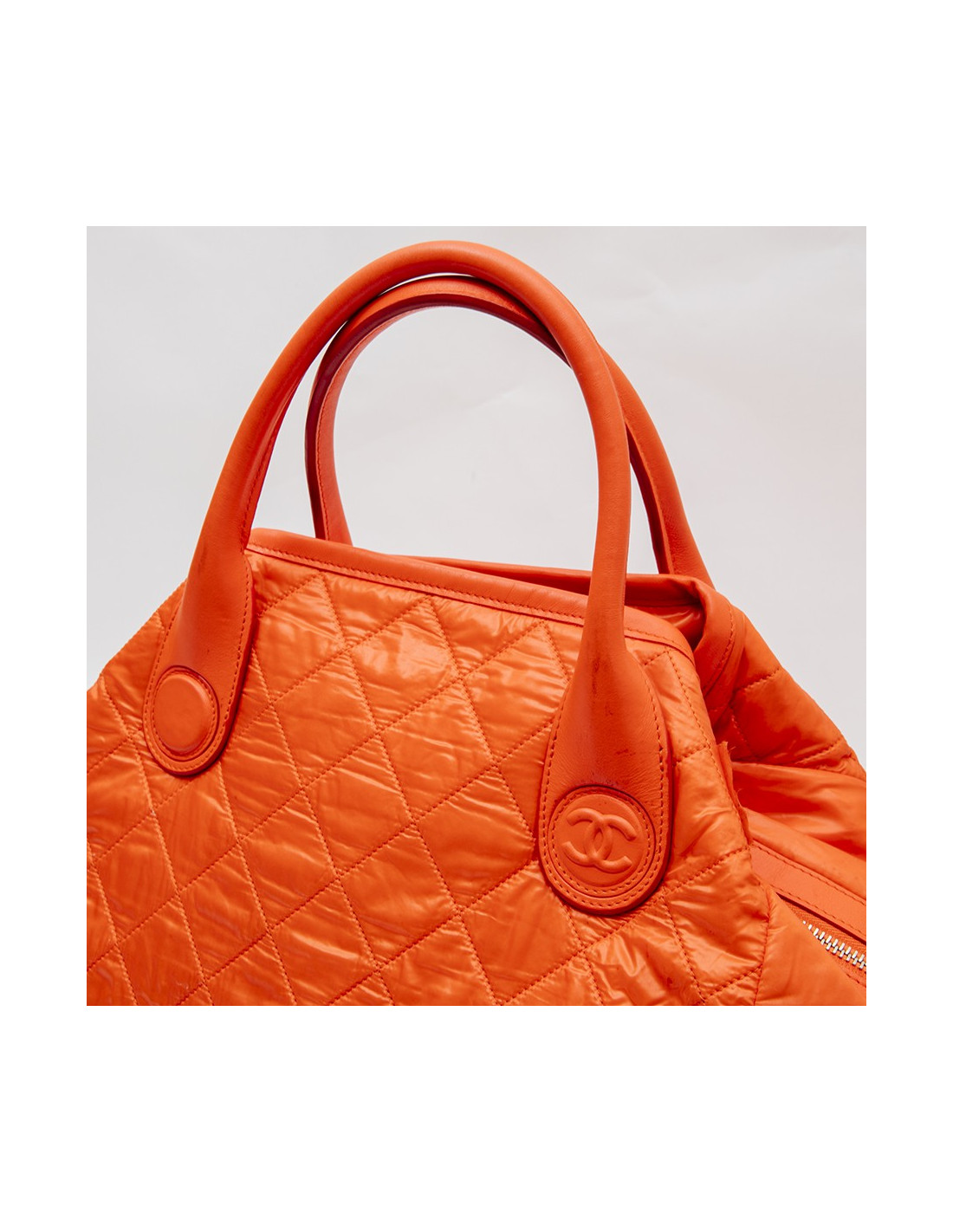D'une légèreté incomparable, lors de vos voyages. Sac "Cocoon" Chanel en matière imperméable orange. Sac de défilé sans hologramme ni carte. Printemps 2014. Collection Supermarché.