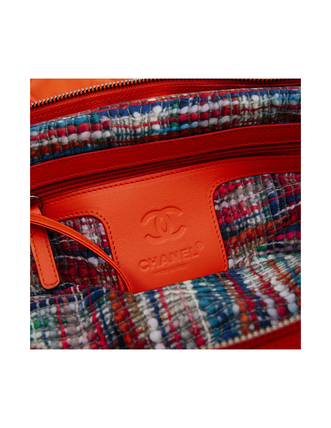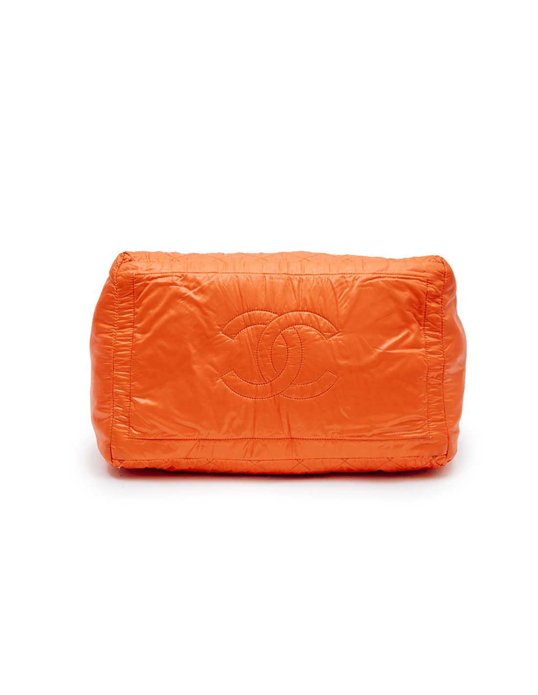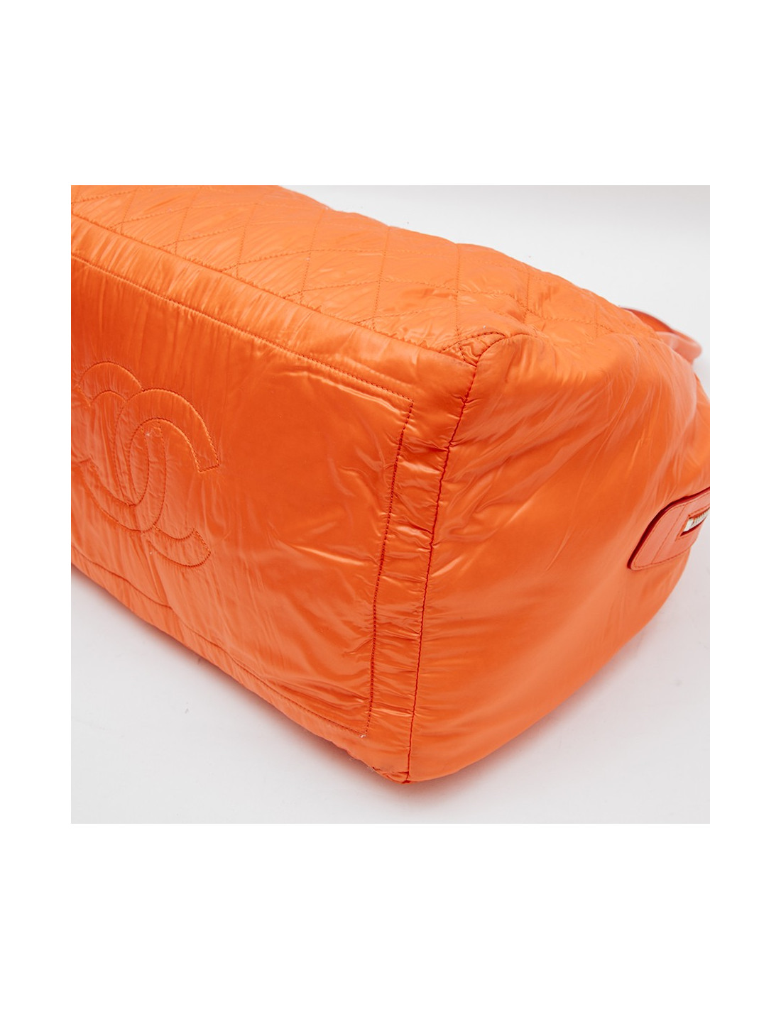 D'une légèreté incomparable, lors de vos voyages. Sac "Cocoon" Chanel en matière imperméable orange. Sac de défilé sans hologramme ni carte. Printemps 2014. Collection Supermarché.