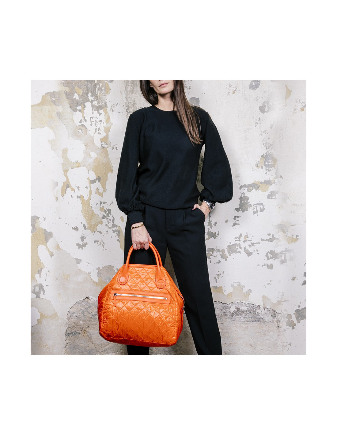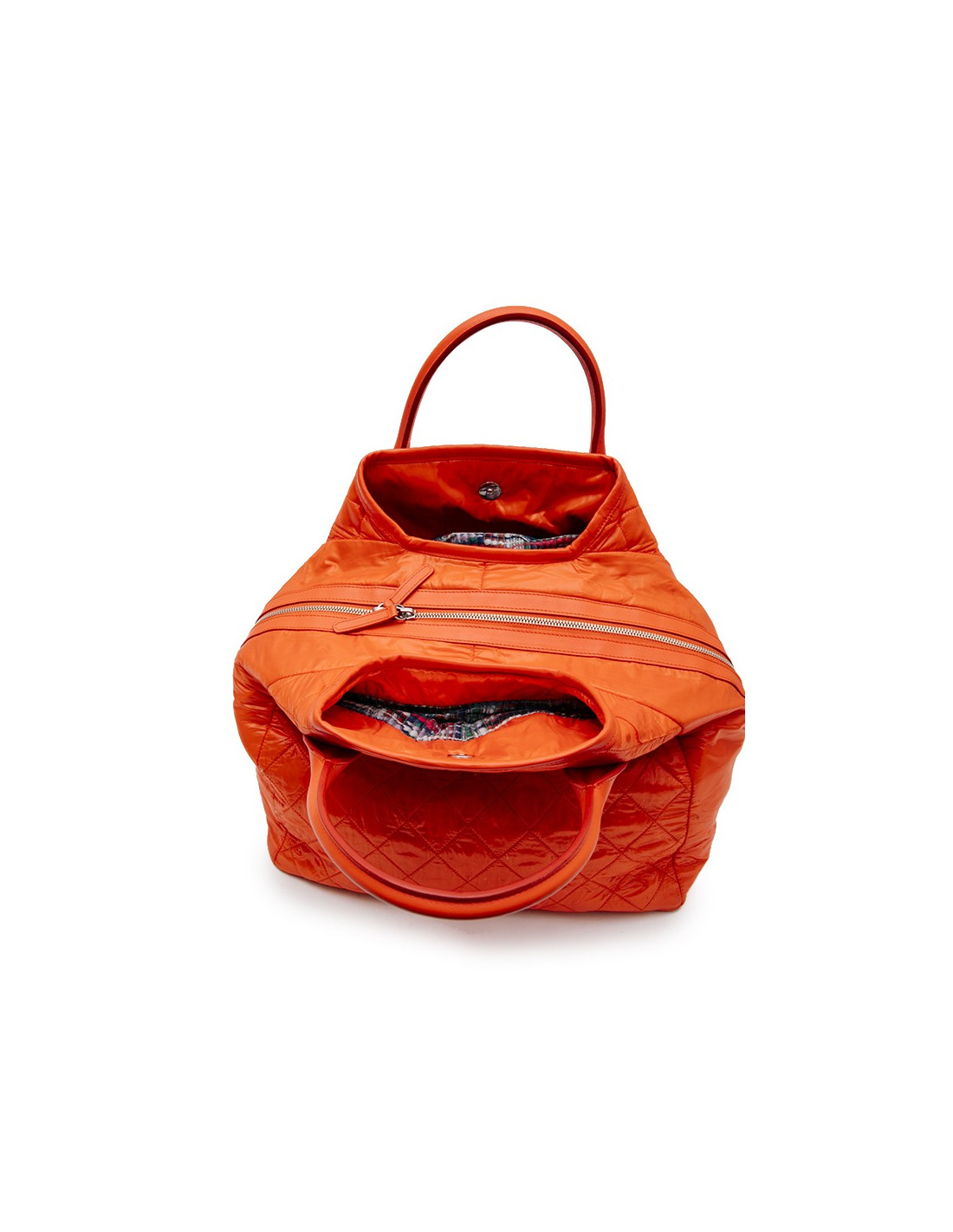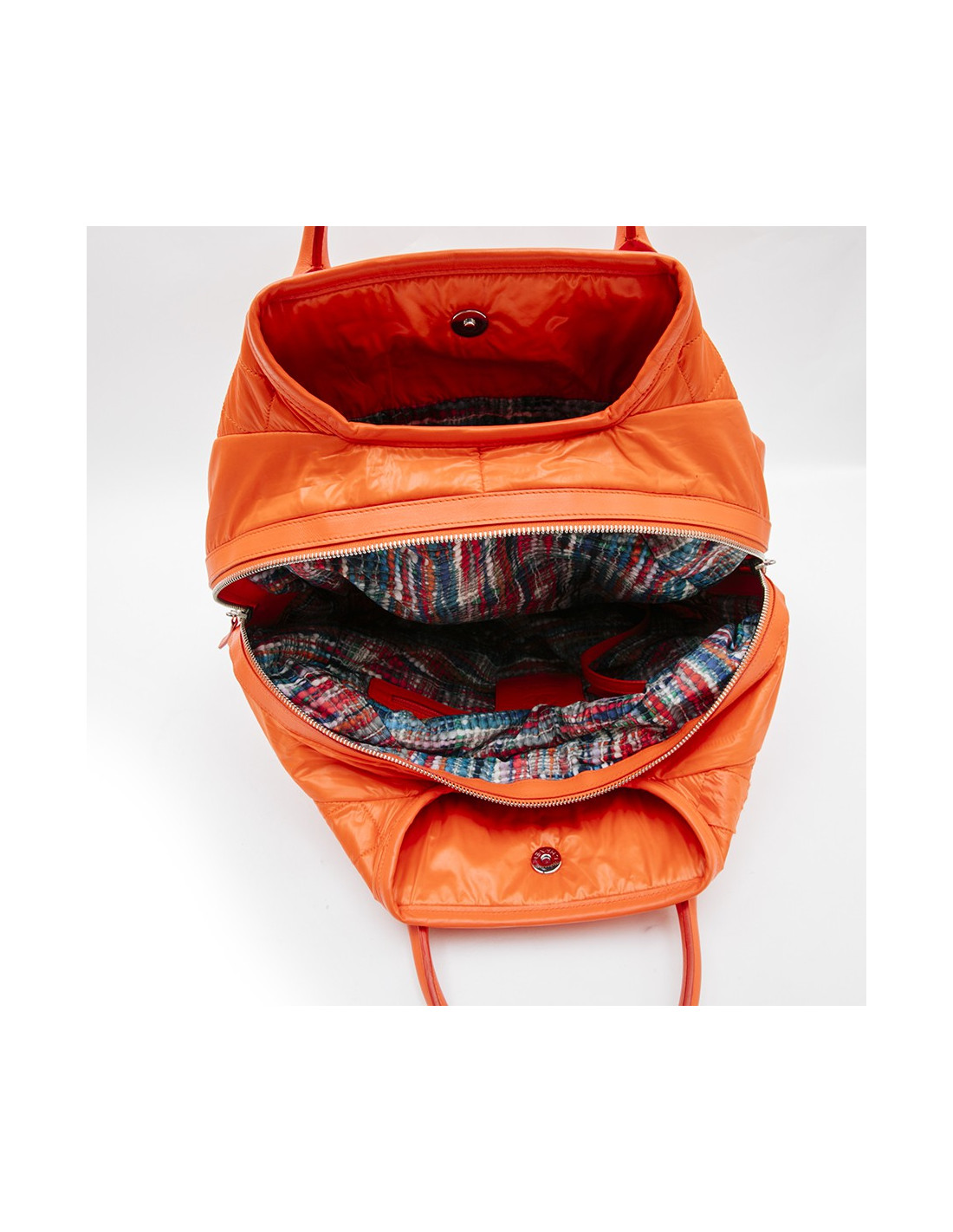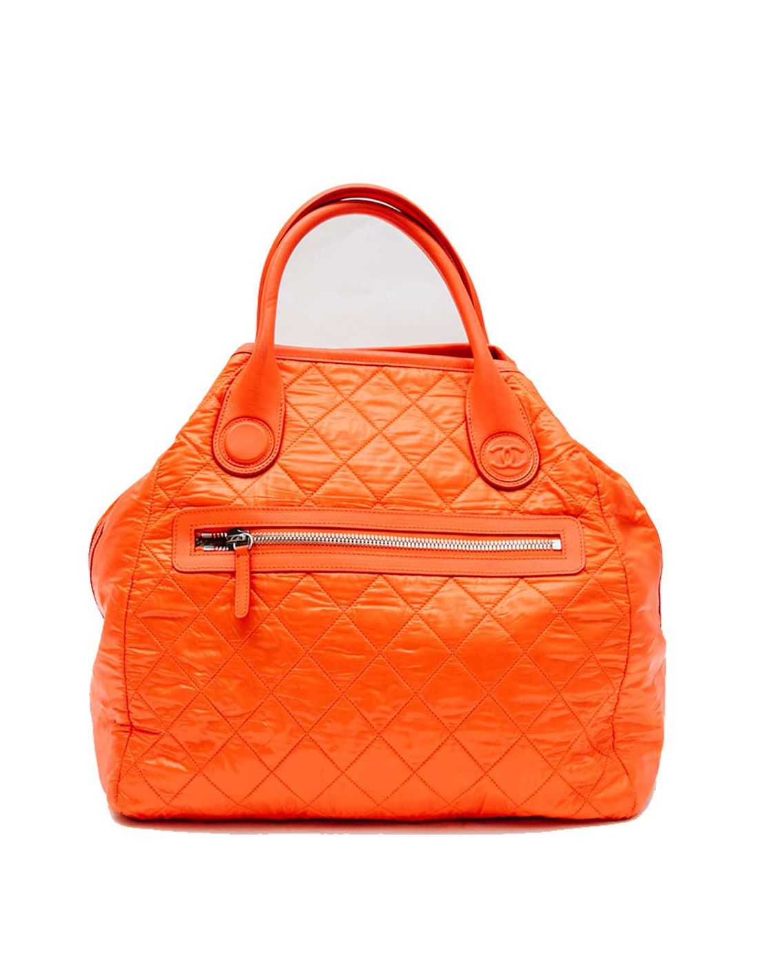 D'une légèreté incomparable, lors de vos voyages. Sac "Cocoon" Chanel en matière imperméable orange. Sac de défilé sans hologramme ni carte. Printemps 2014. Collection Supermarché.