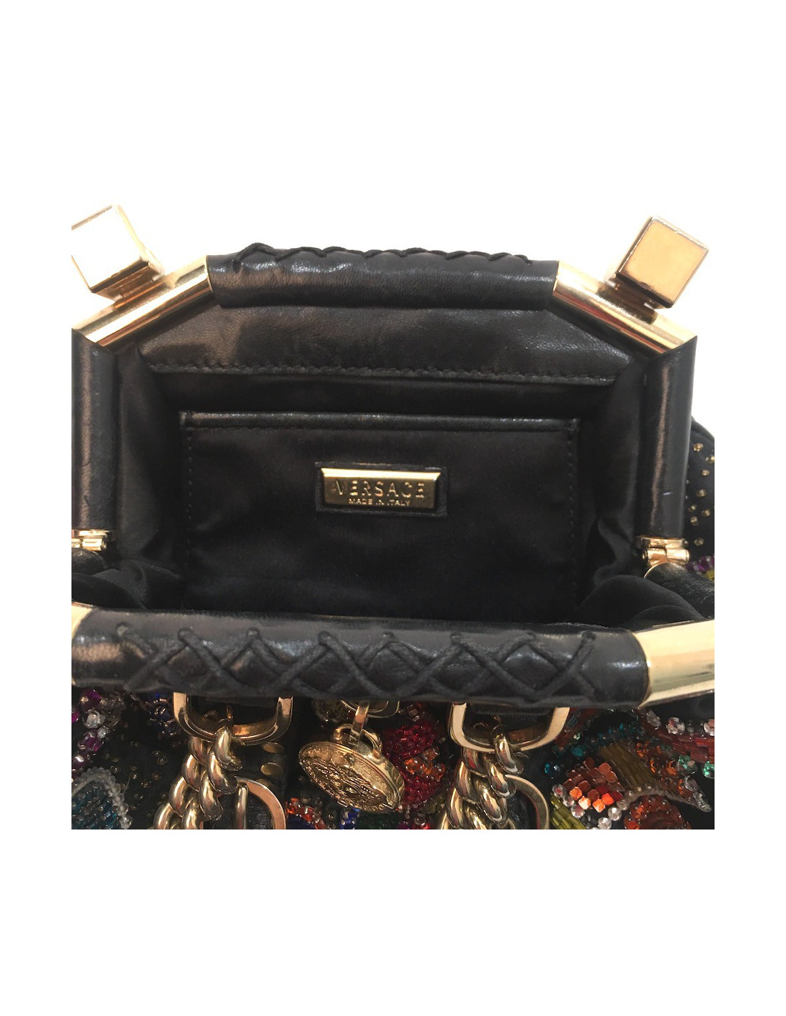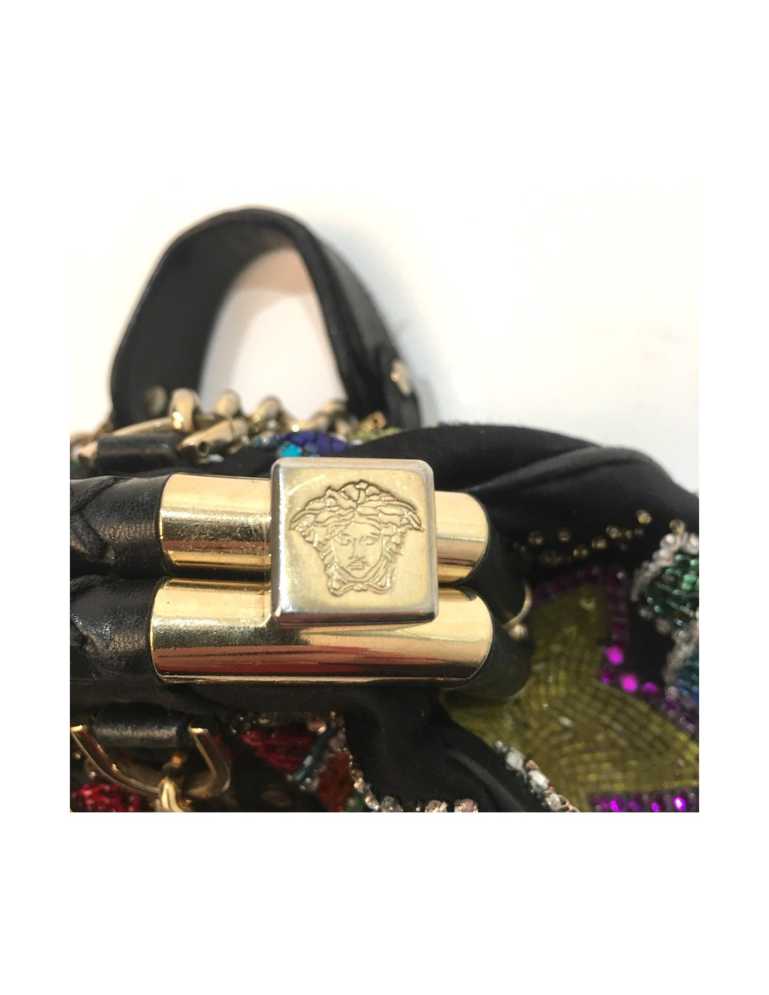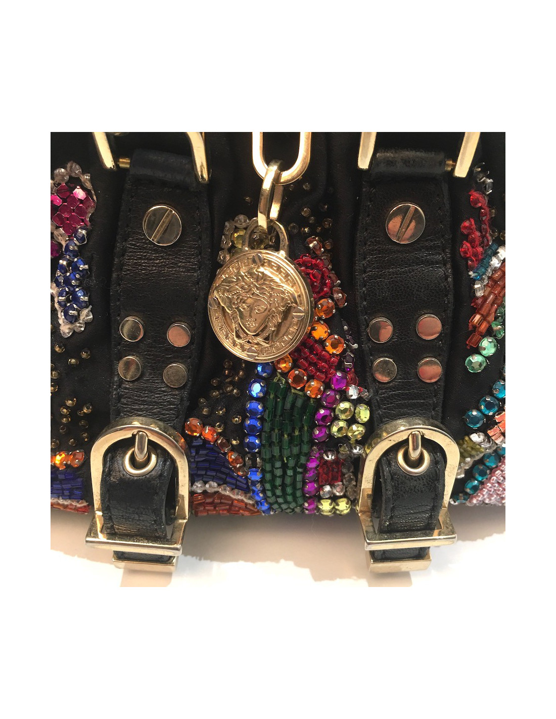 Petit sac Versace en satin orné de perles et strass multicolores. La bijouterie est dorée, ouverture par deux fermoirs à bascule. Les finitions sont en cuir. Un médaillon Medusa à l'effigie de la marque VERSACE sur le devant du sac. A l'intérieur un espace de rangement avec une petite poche plaquée. Il se porte à main. Il sera parfait pour accessoiriser votre tenue.