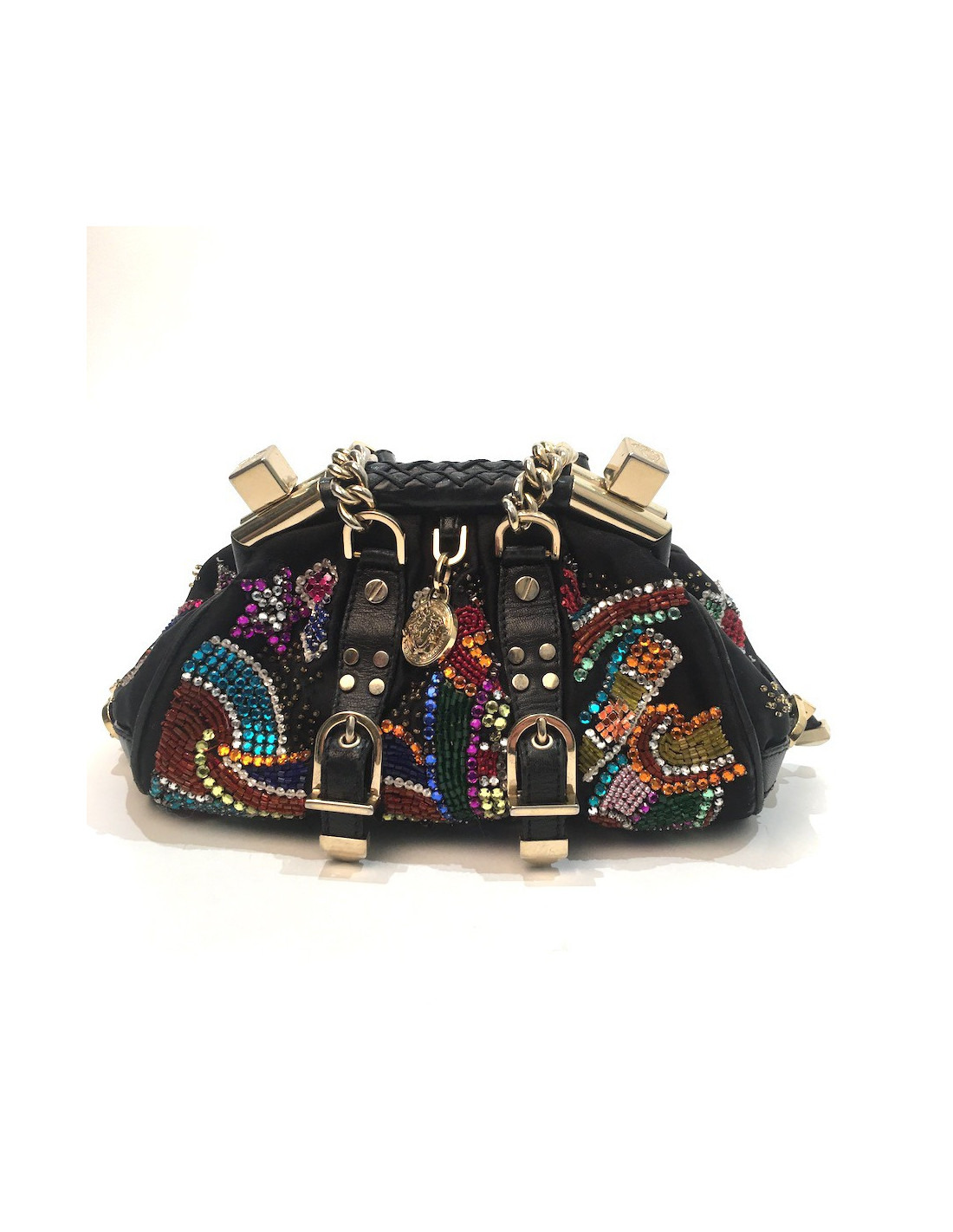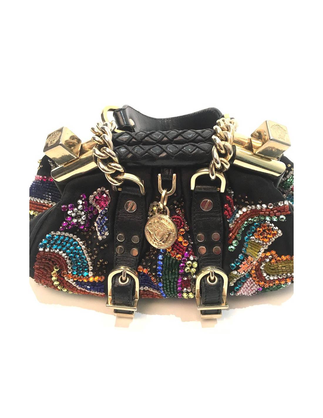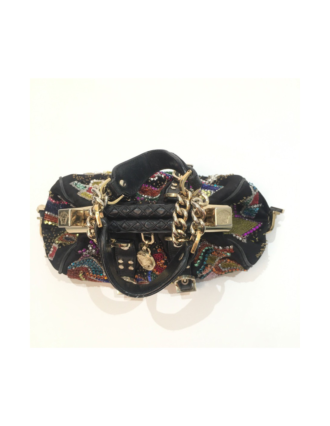 Petit sac Versace en satin orné de perles et strass multicolores. La bijouterie est dorée, ouverture par deux fermoirs à bascule. Les finitions sont en cuir. Un médaillon Medusa à l'effigie de la marque VERSACE sur le devant du sac. A l'intérieur un espace de rangement avec une petite poche plaquée. Il se porte à main. Il sera parfait pour accessoiriser votre tenue.