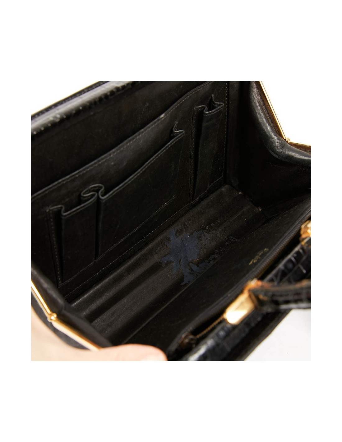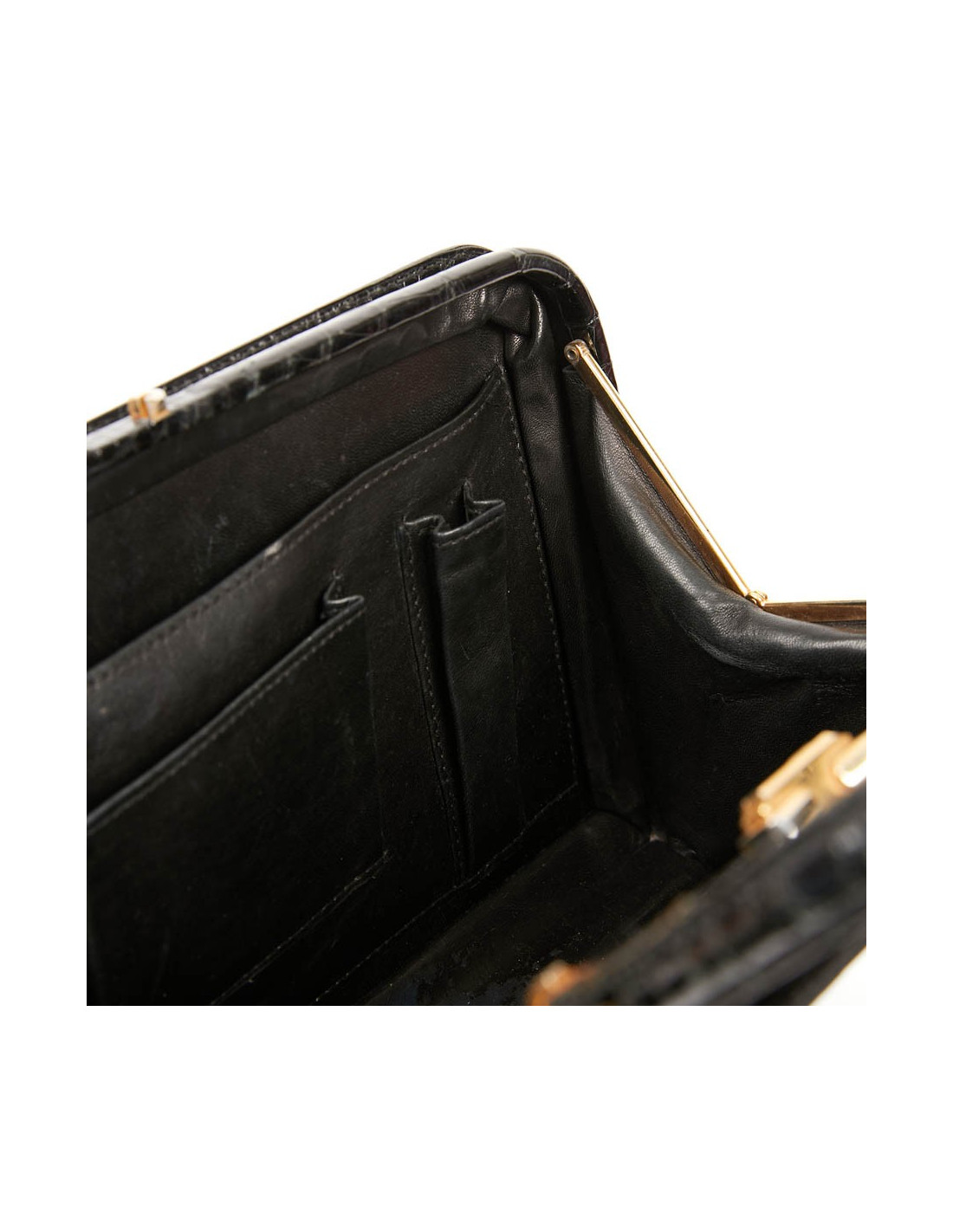 Ce sac vintage MORABITO est en crocodile noir. La bijouterie est en métal doré vieilli, fermeture par un fermoir pression. Il est en très bon état extérieur mais nous le mettons dans la catégorie "bon état" car il est un peu abimé à l'intérieur (voir photos). Il se porte main.