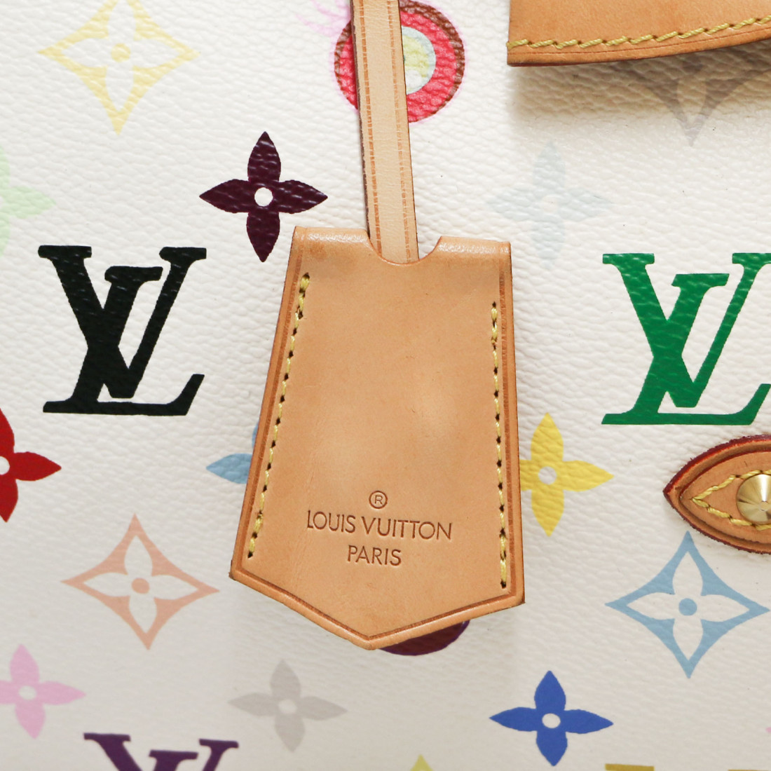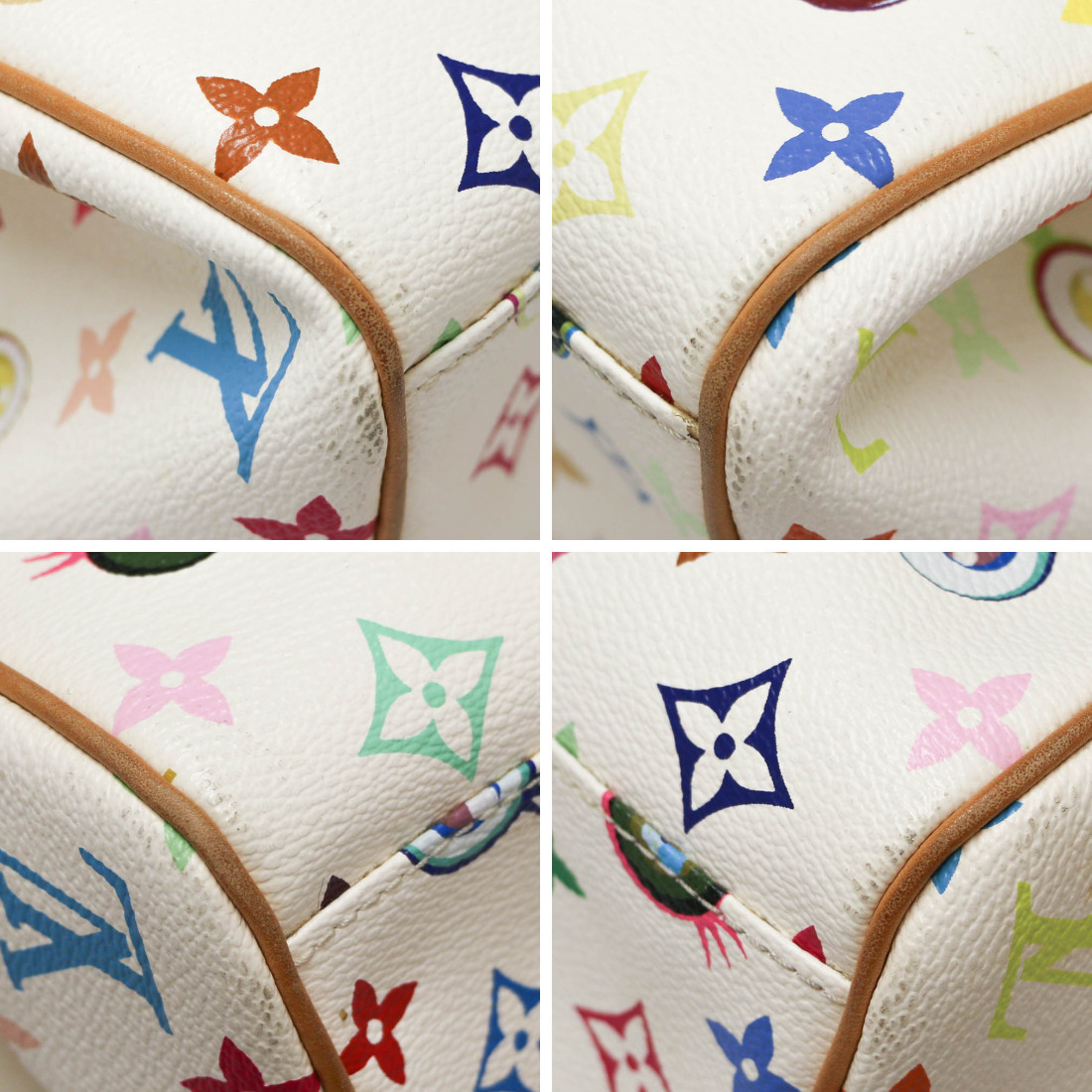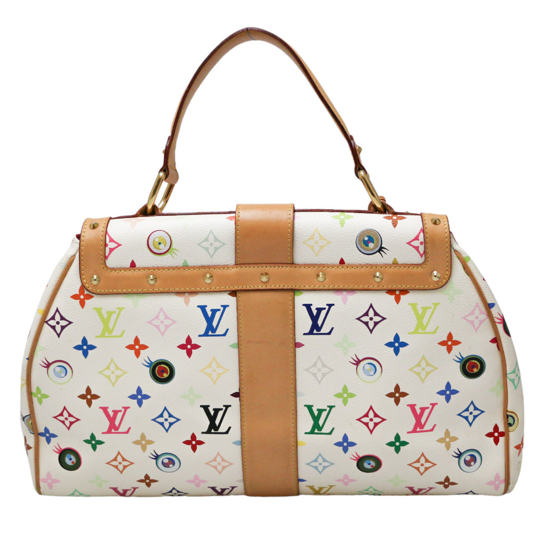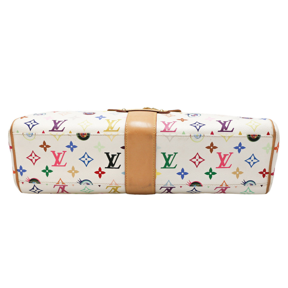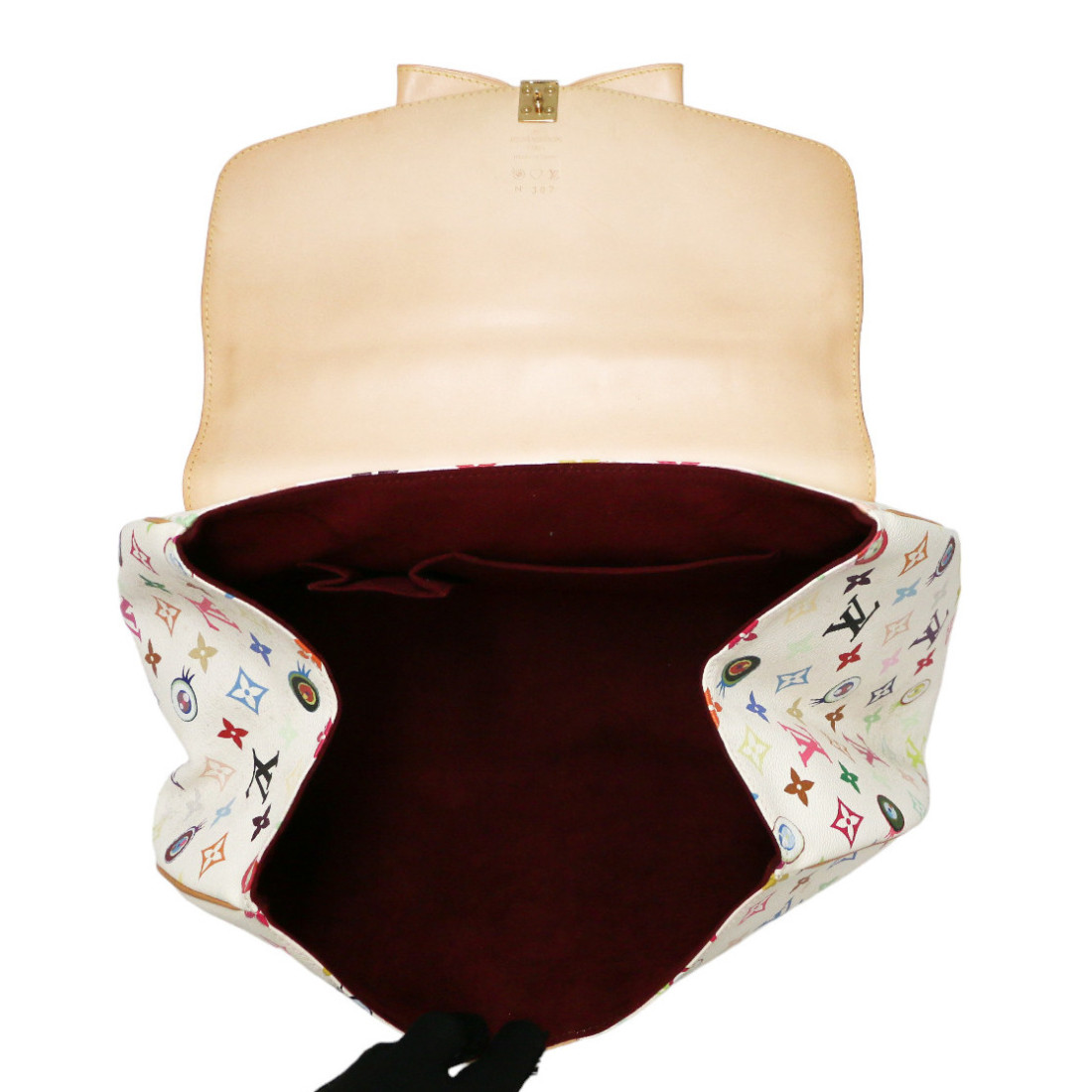 Détails : sac issu de la collaboration entre le directeur artistique Marc Jacobs avec l'artiste japonais Takashi Murakami. Ce sac de la collection Printemps été 2003 est numéroté 307 (sous le rabat). Fermoir à pression. Les pièces en cuir présentent quelques petites traces dûe au temps et elle se sont patinées. Présence de la tirette, clochette, clé (x2) et cadenas. Il se porte main.