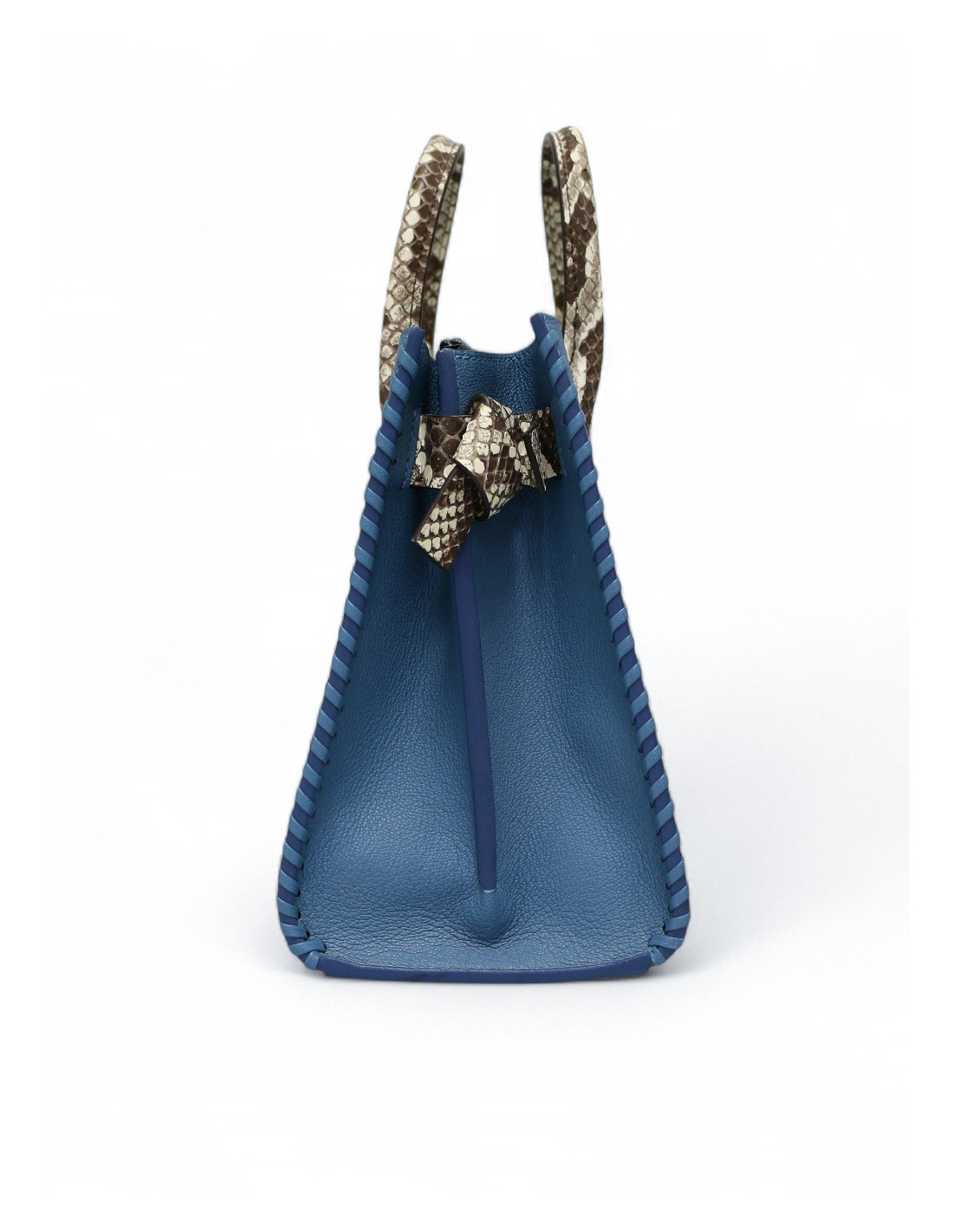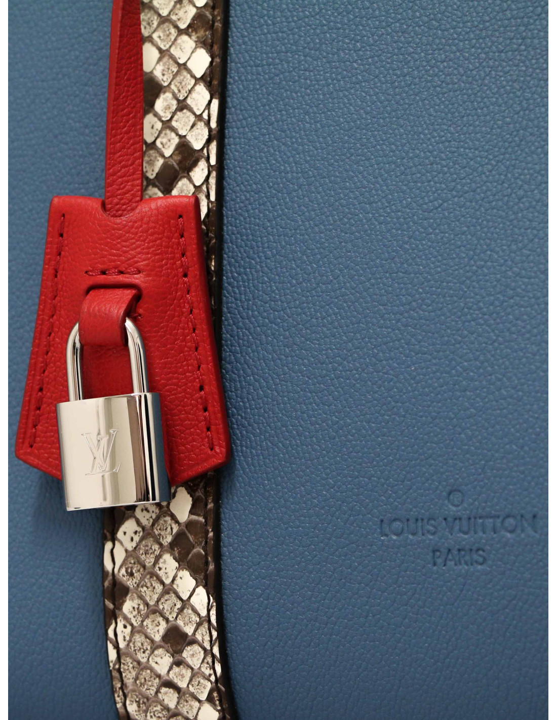 Détails : rare cabas Louis Vuitton bi-matière : en cuir bleu glacier rehaussé de détails en python beige et marron. Il est orné du V emblématique en métal à l'avant devant et a un porte-clefs rouge embossé du logo LV. Les côtés du sac ont une finition à lacets en cuir ton sur ton entrelacés. Trois compartiments intérieur dont une poche zippée.