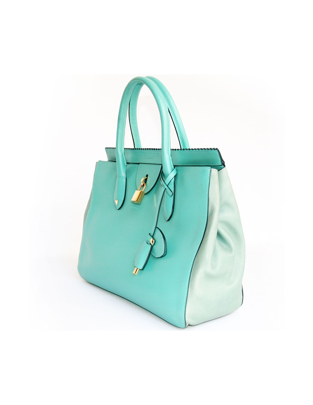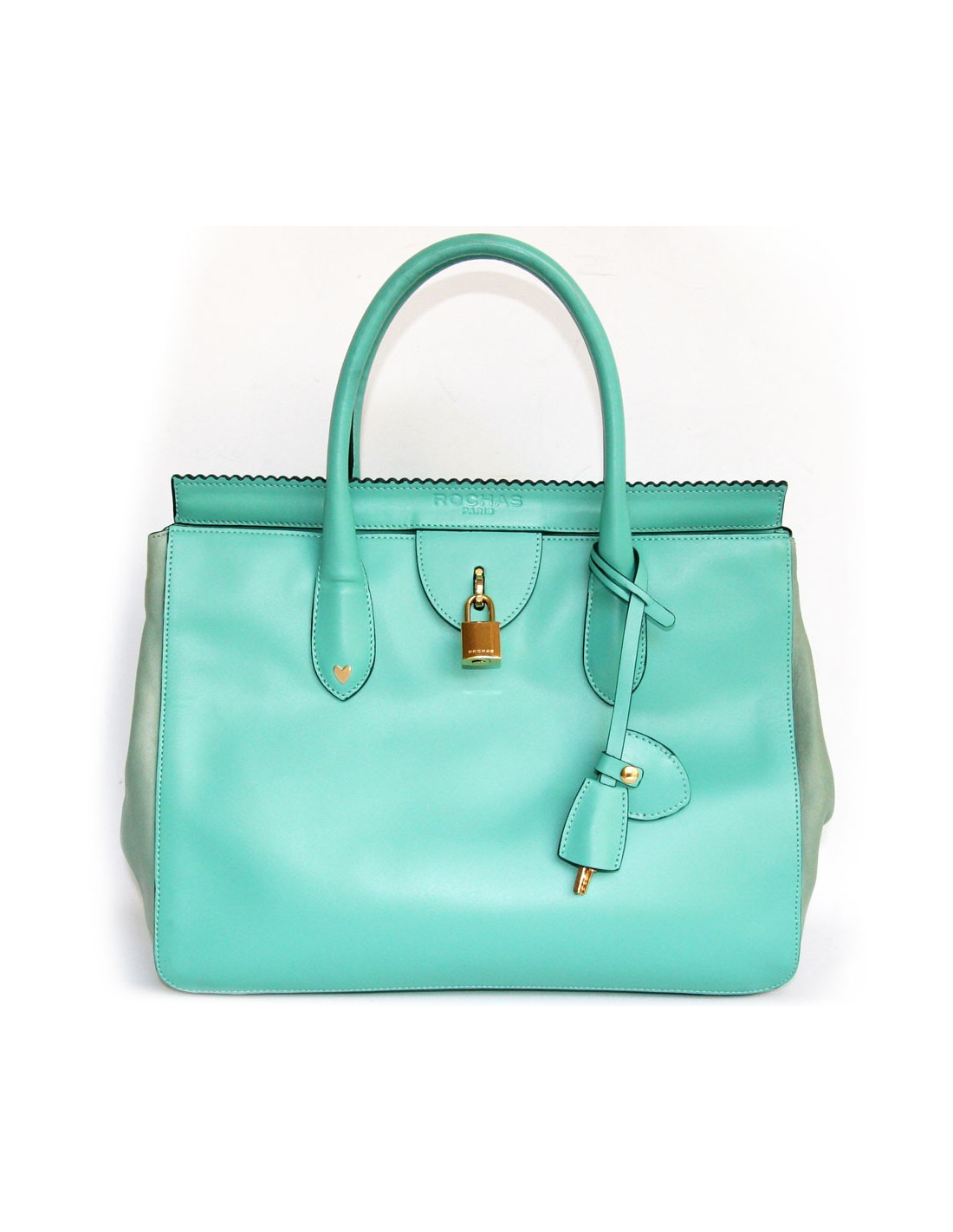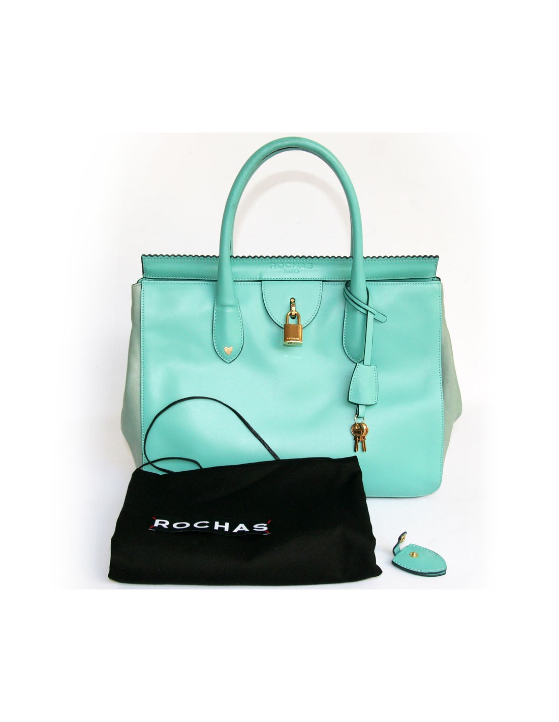 Très joli sac ROCHAS en cuir turquoise. Il se porte à la main ainsi qu'à l'épaule grace à ses deux anses. L'intérieur est en cuir de veau beige avec deux grandes poches dont une zippée. Il se ferme à l'aide d'un cadenas. Deux clefs sont fournies avec un cache en cuir. En bon état. Une légère trace de stylo sous le sac. Légères usures du cuir à l'arrière de celui ci.