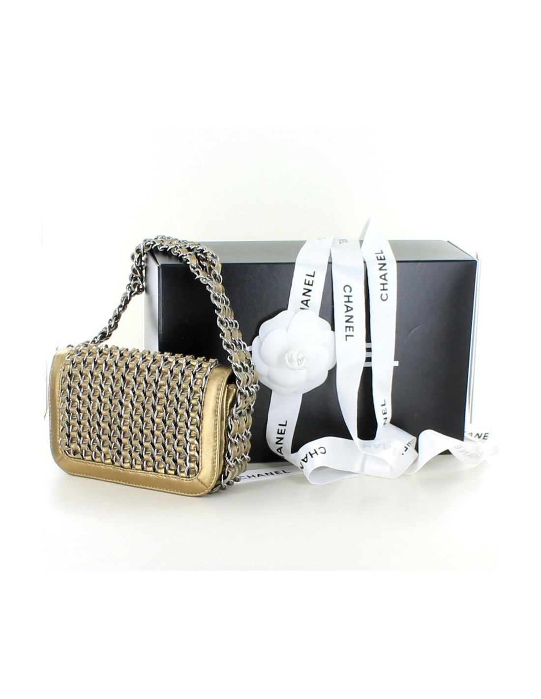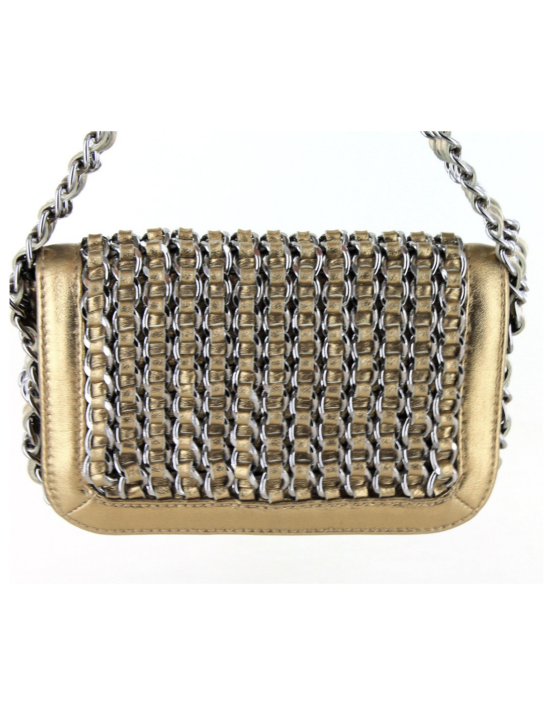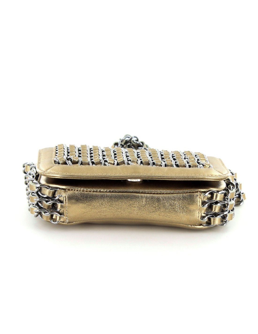 Collector ! Ce petit sac bijou CHANEL est en cuir lamé bronze doré. Sur le rabat il y a des chaines sur lesquelles sont entrelacées des rubans de cuir. La bijouterie est en argent palladié. Il se porte au bras ou à la main par une bandoulière regroupant trois chaines entrelacées par des rubans de cuir. L'intérieur est en toile monogramme avec une poche plate. Il est en très bon état, aucune usure.