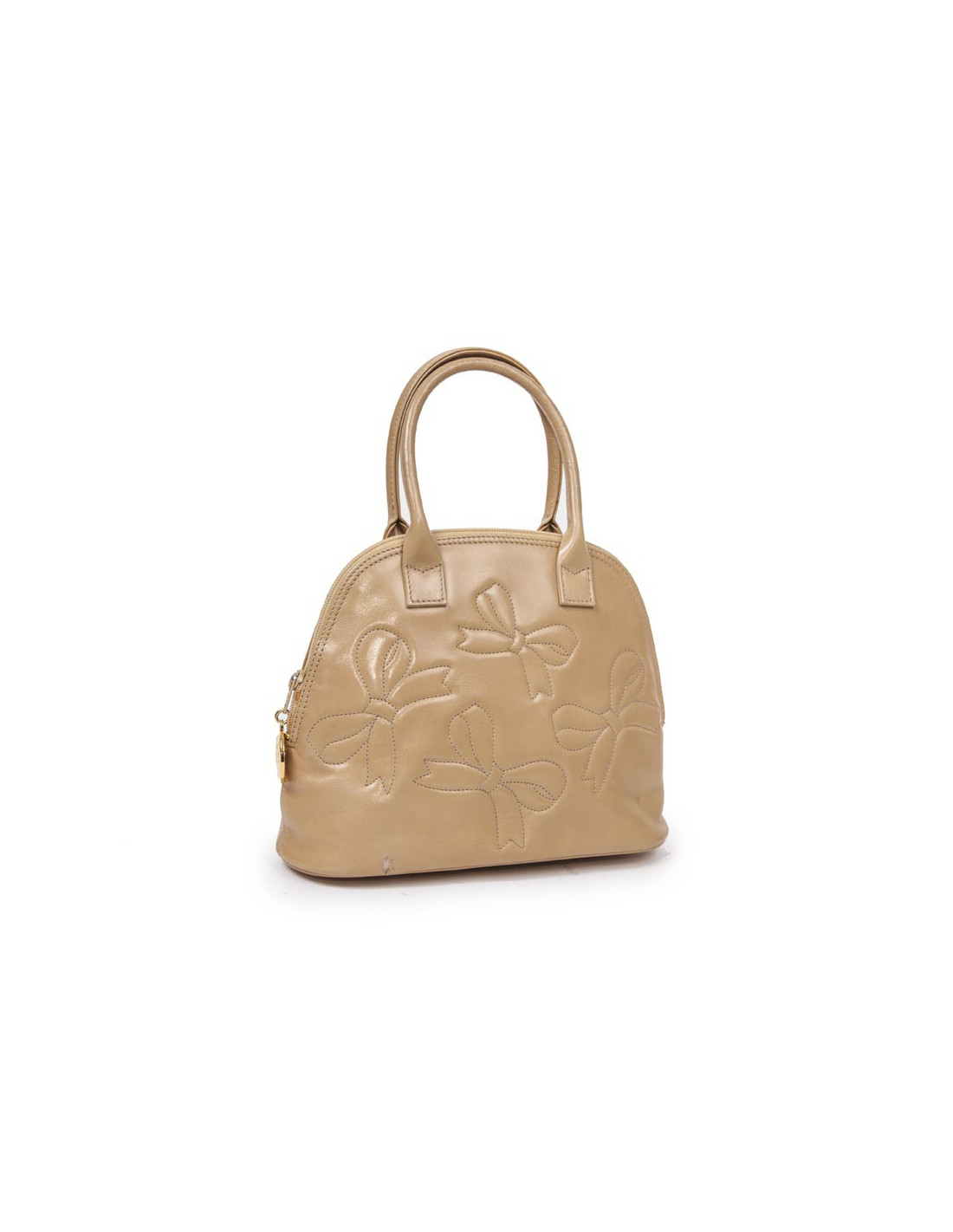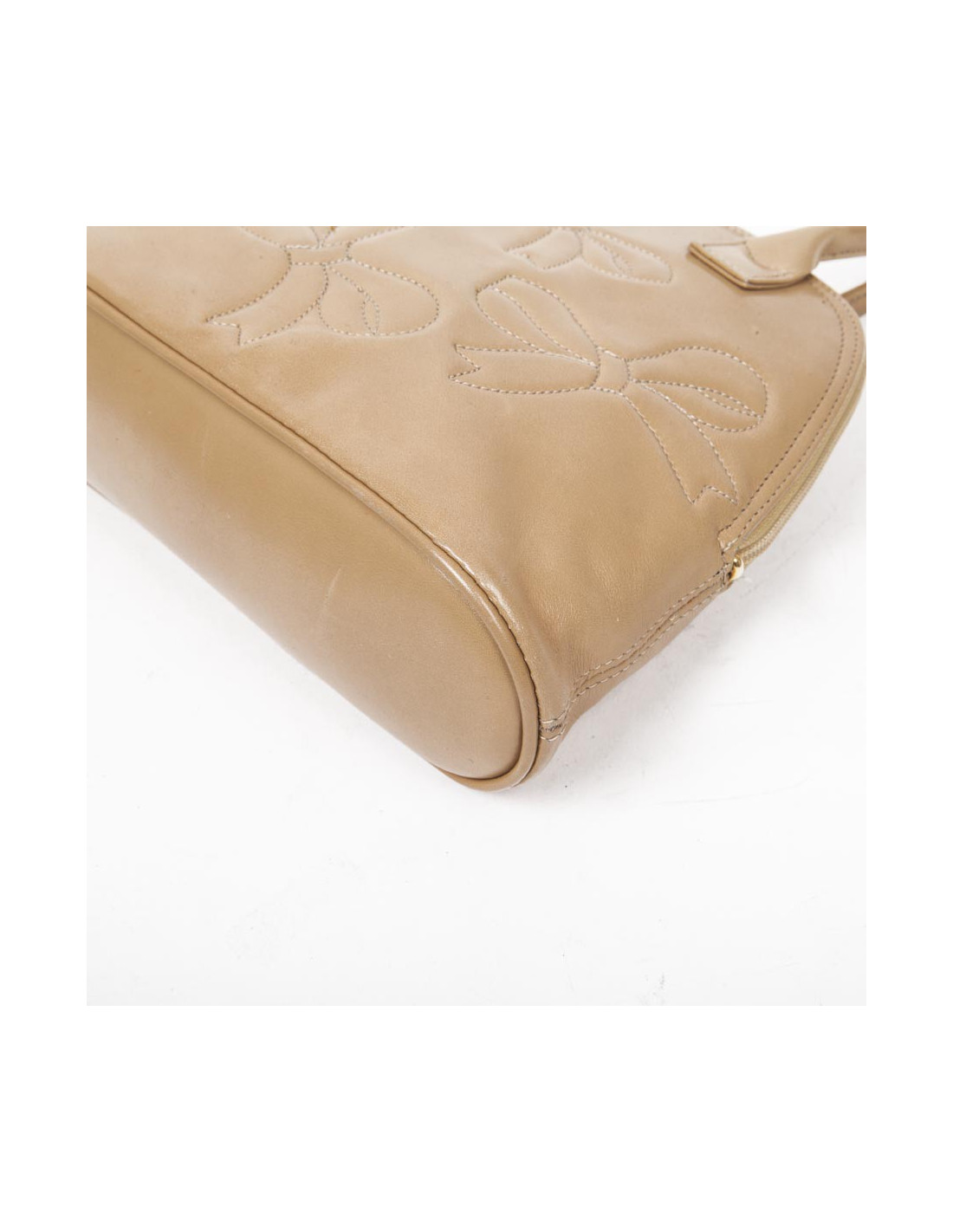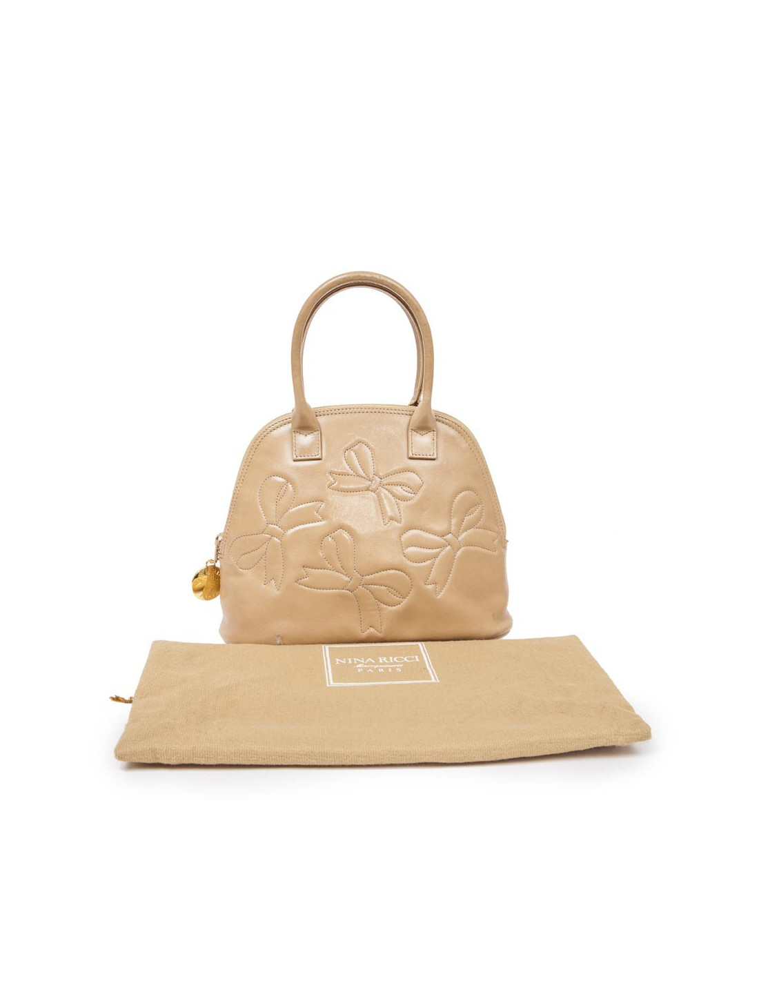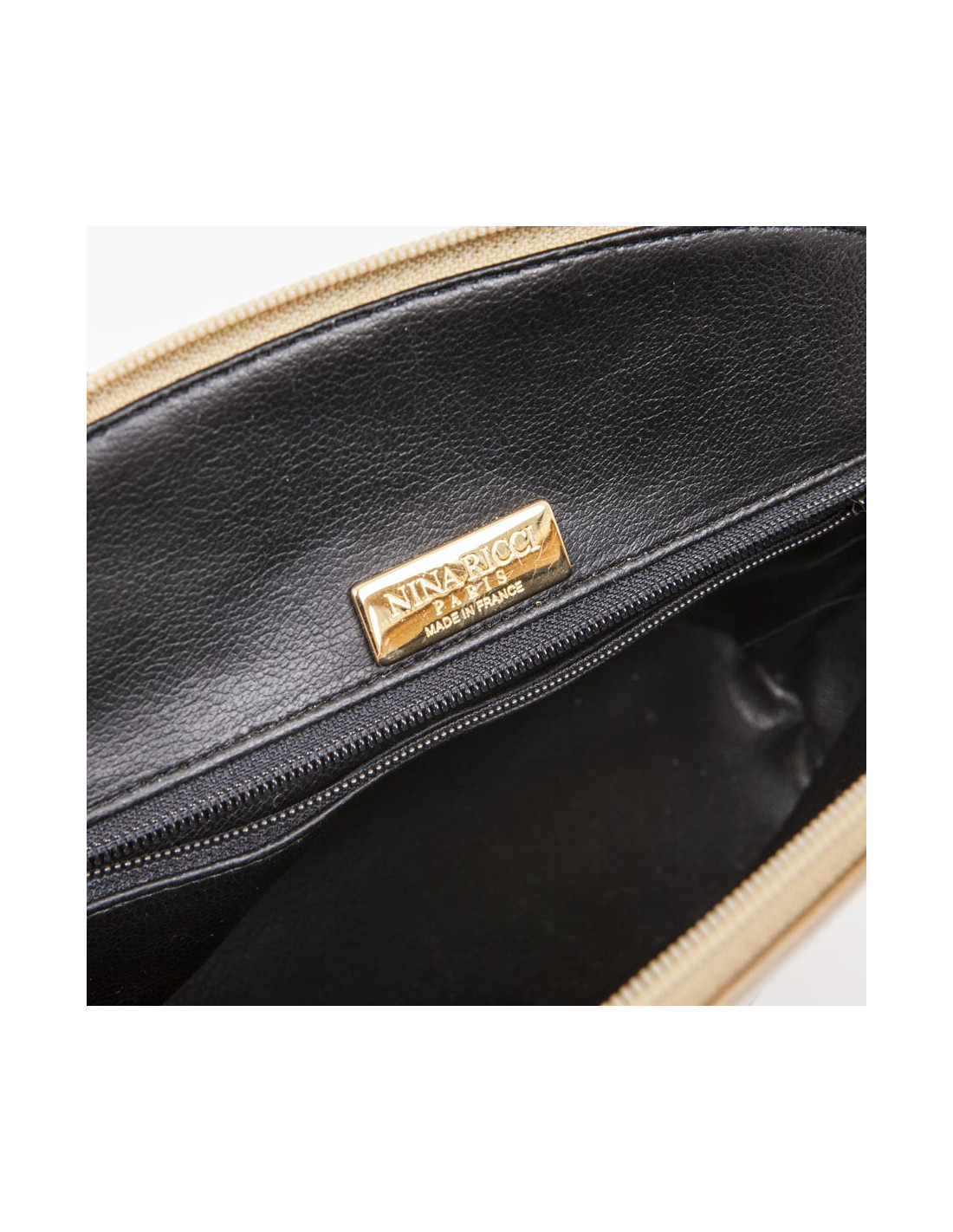Petit sac en cuir d'agneau lisse de la maison Nina Ricci, de couleur gold avec broderies de noeuds. Garniture dorée. Se ferme par une fermeture éclair. Intérieur en cuir noir avec une poche zippée.