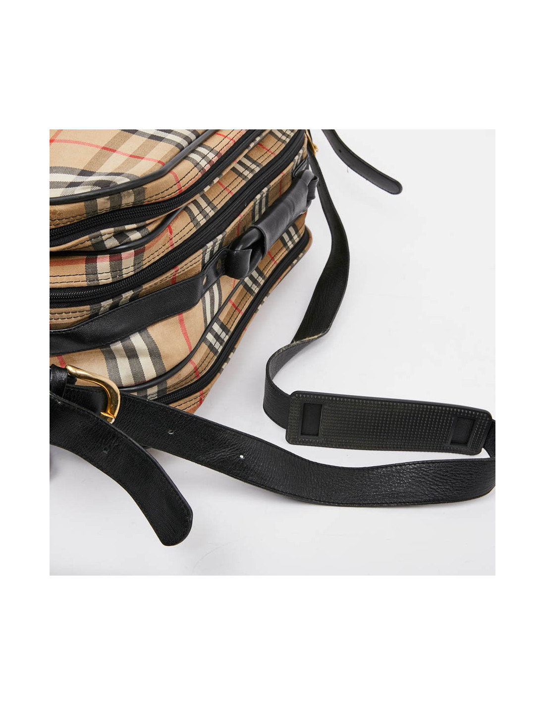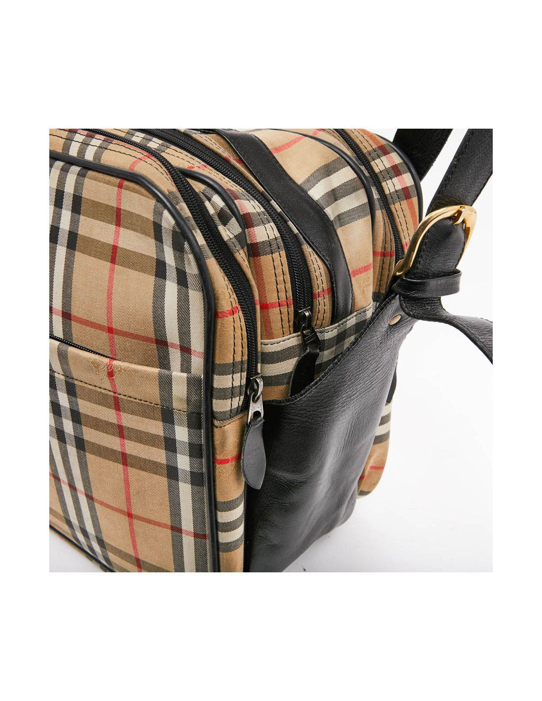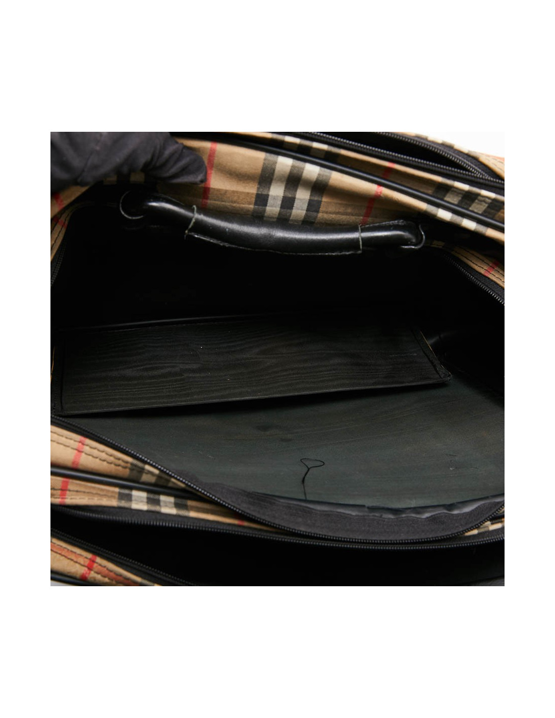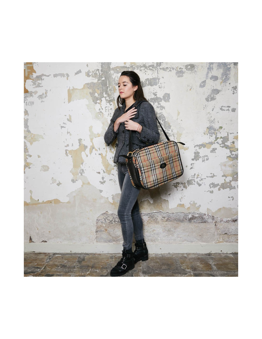 Ce sac de weekend BURBERRY peut servir également comme porte-documents et ordinateur. Il est en toile tartan monogramme beige. Très pratique avec ses 3 grandes poches de rangement, et une plus petite également zippée. L'intérieur est en cuir et toile noir. Il se porte à la main ou à l'épaule avec sa bandoulière amovible ajustable. Il est en bon état d'usage. La toile est légèrement noircie par endroits.
