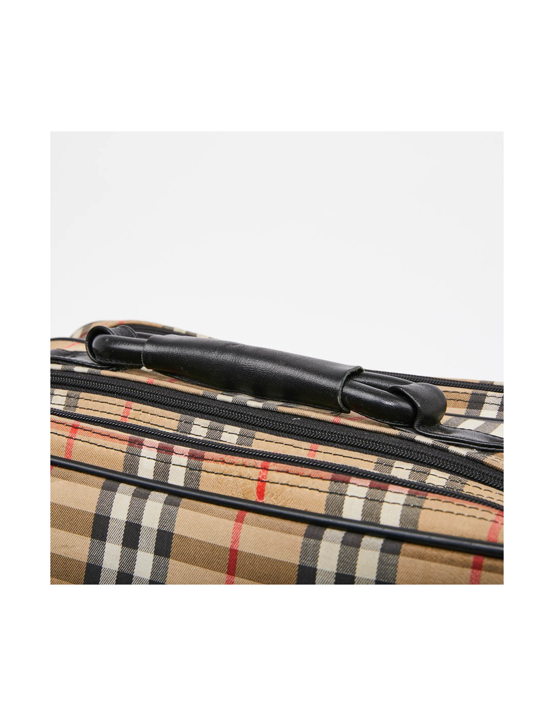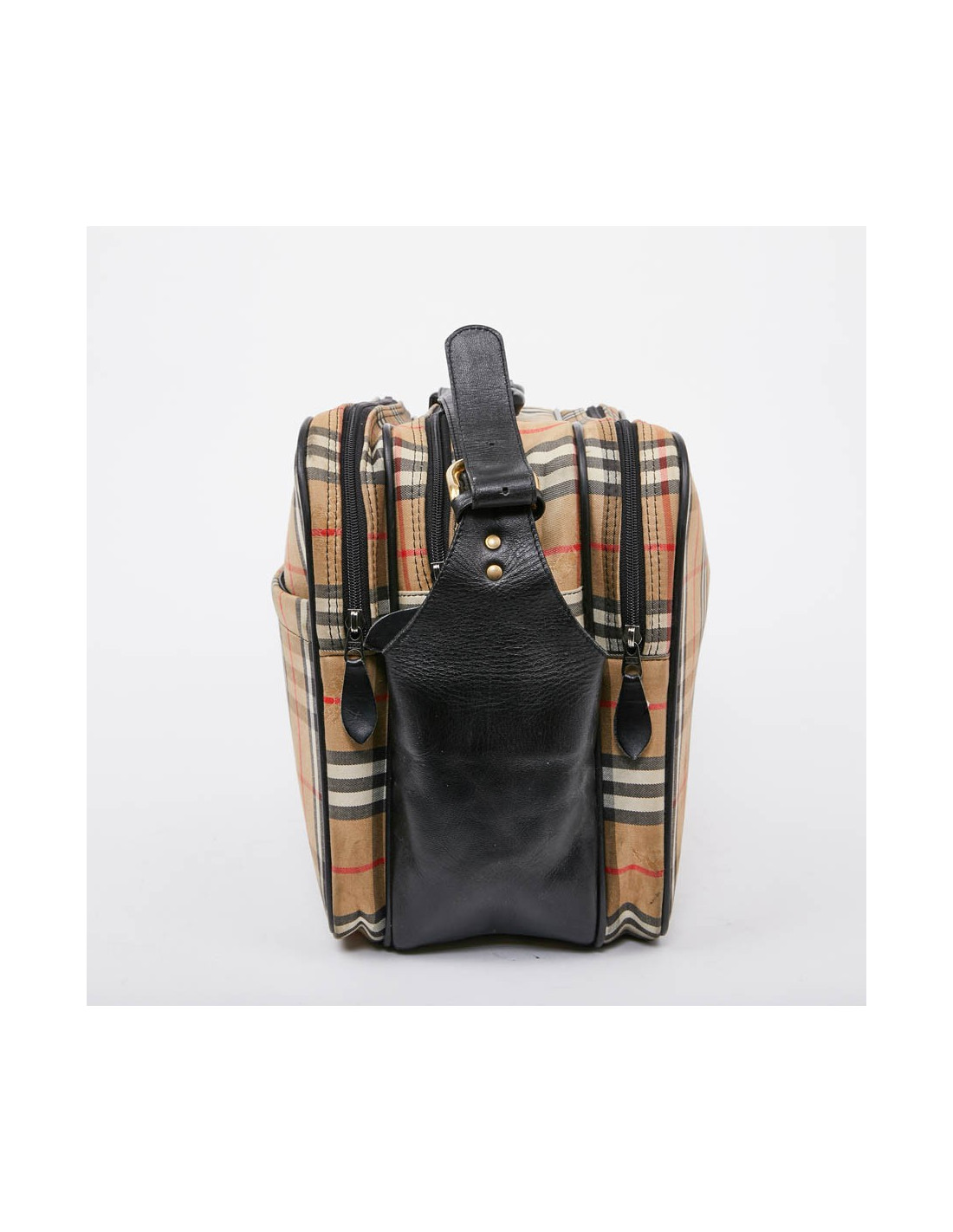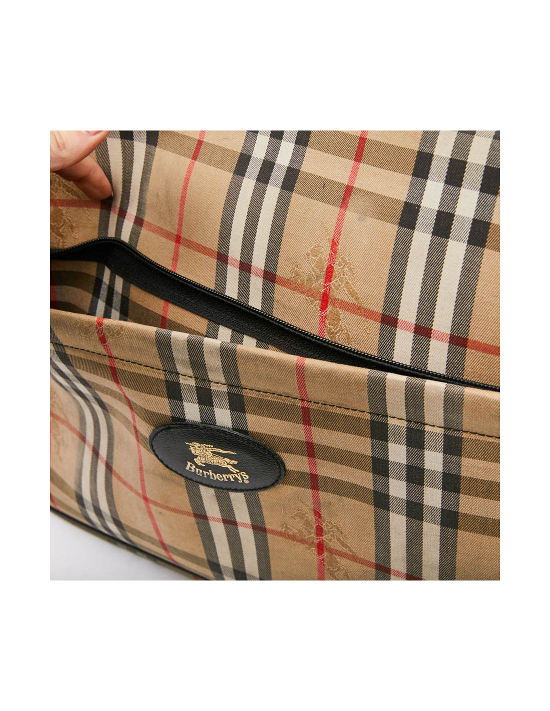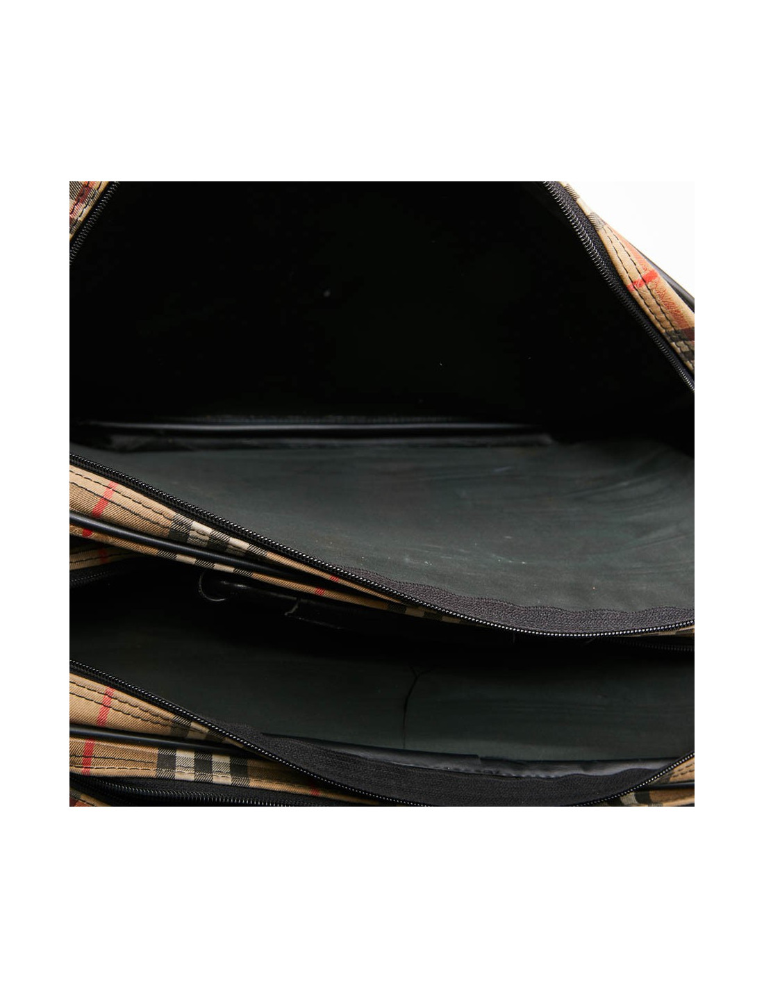 Ce sac de weekend BURBERRY peut servir également comme porte-documents et ordinateur. Il est en toile tartan monogramme beige. Très pratique avec ses 3 grandes poches de rangement, et une plus petite également zippée. L'intérieur est en cuir et toile noir. Il se porte à la main ou à l'épaule avec sa bandoulière amovible ajustable. Il est en bon état d'usage. La toile est légèrement noircie par endroits.