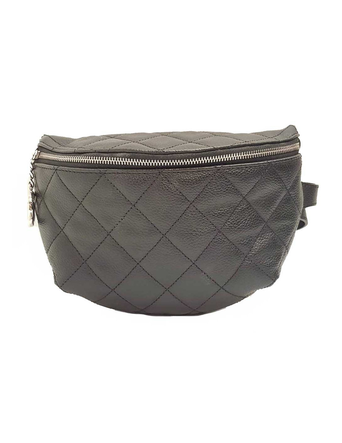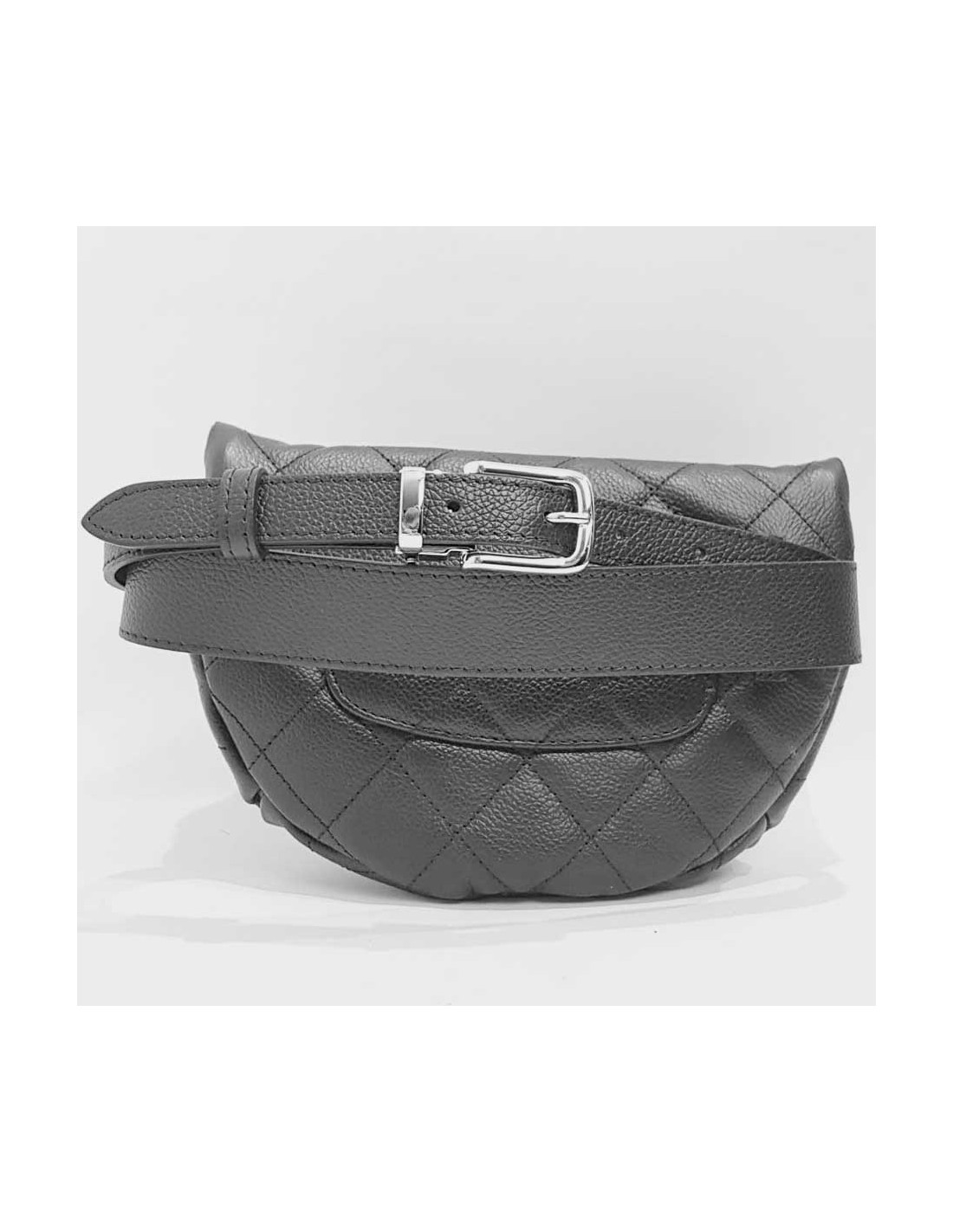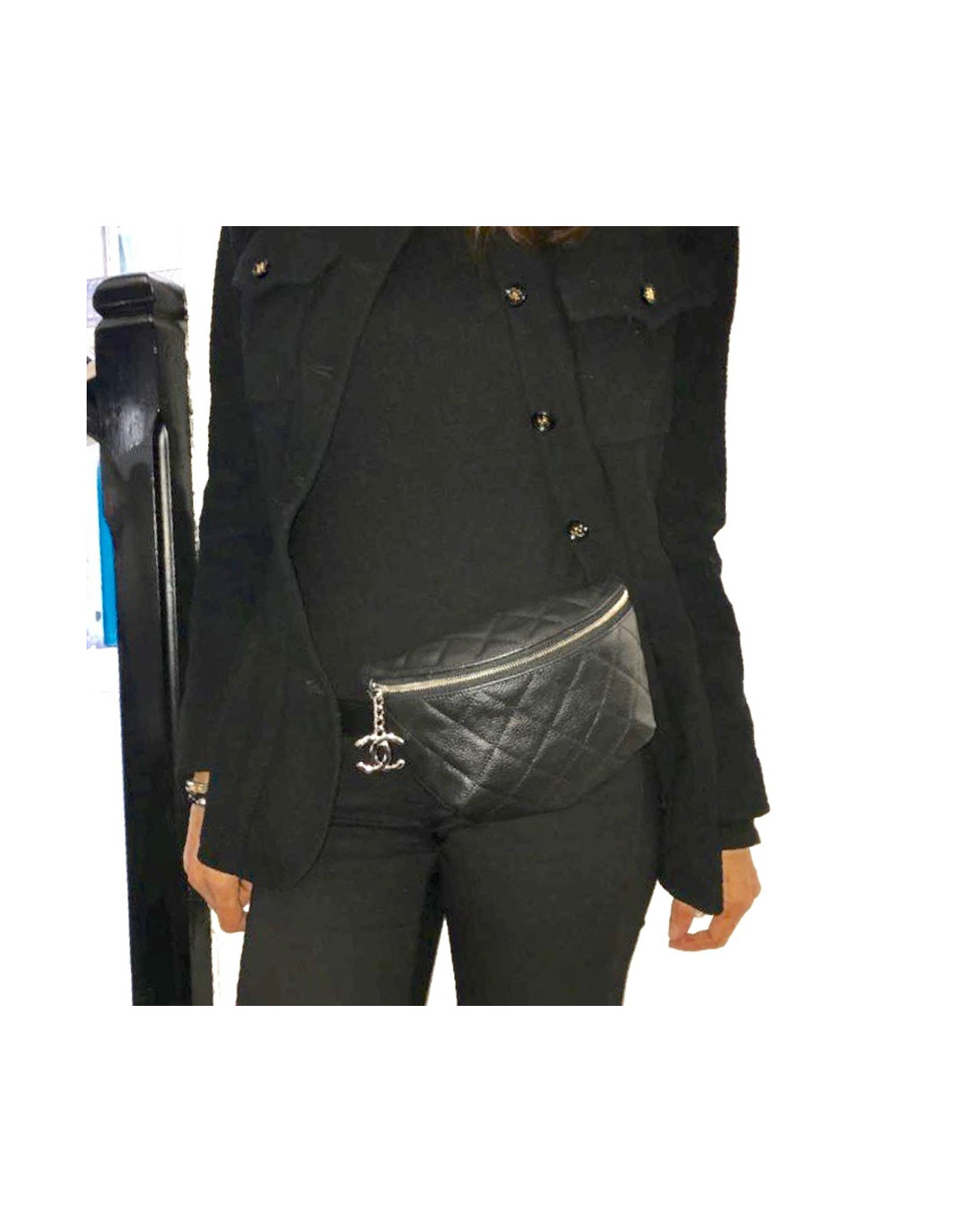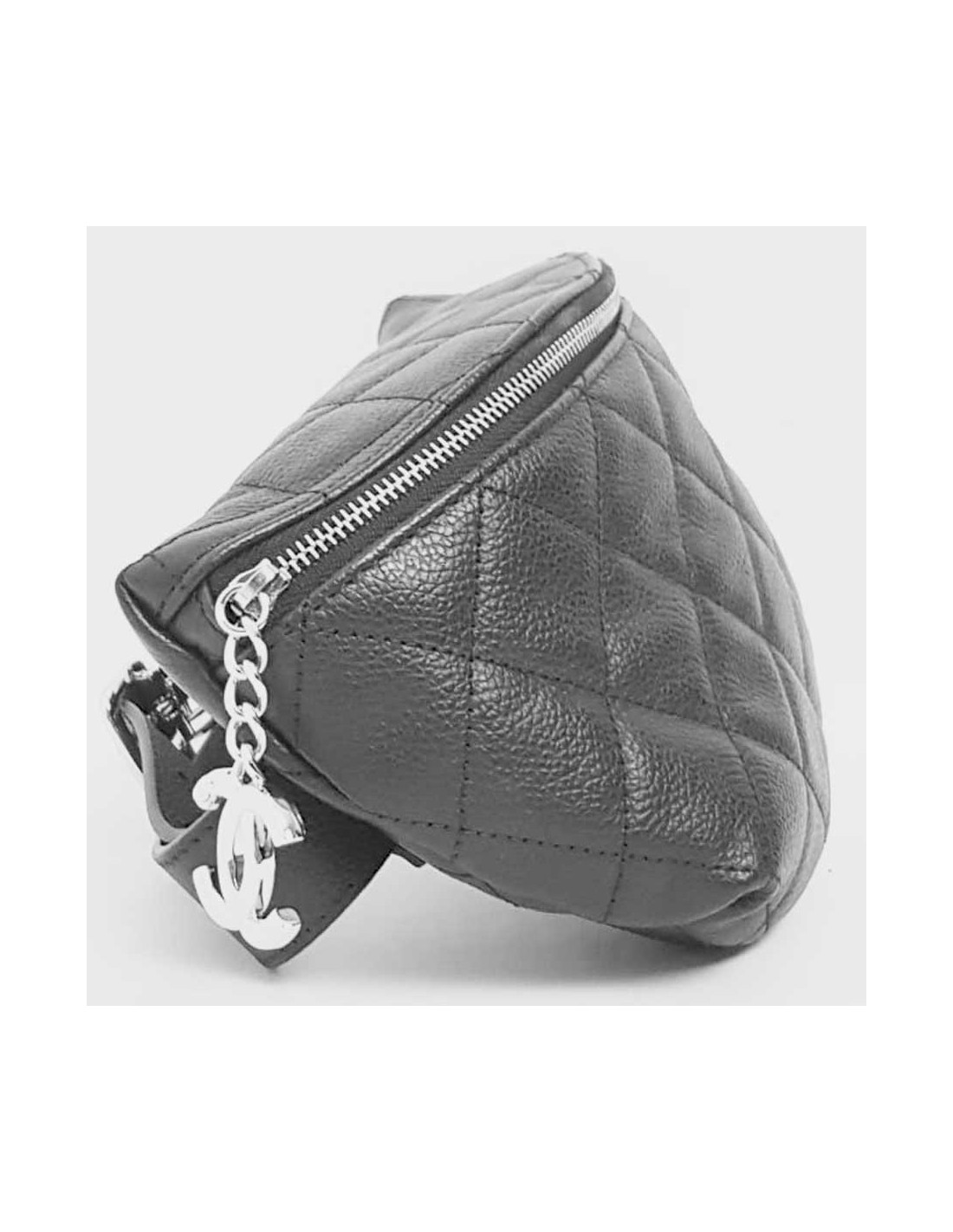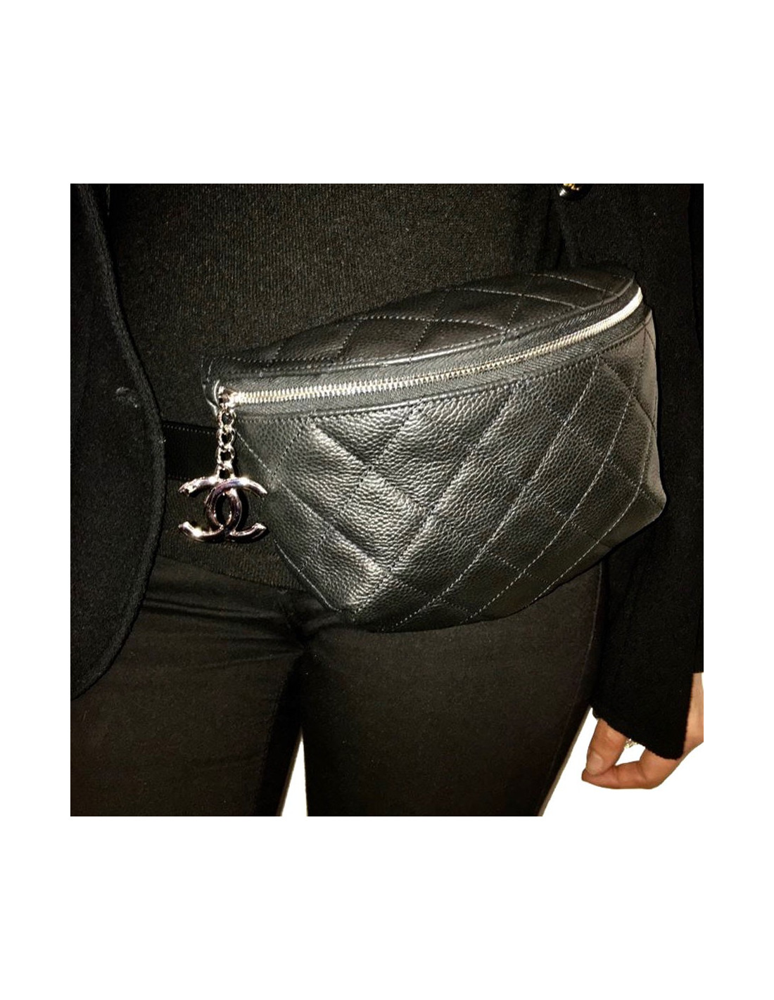 Cette ceinture banane est en cuir caviar noir. la bijouterie est en argent palladié. Elle se ferme par une fermeture éclair. L'intérieur est en tissu noir, une petite poche plaquée. Elle est en parfait état.