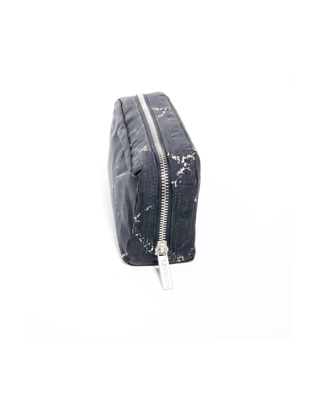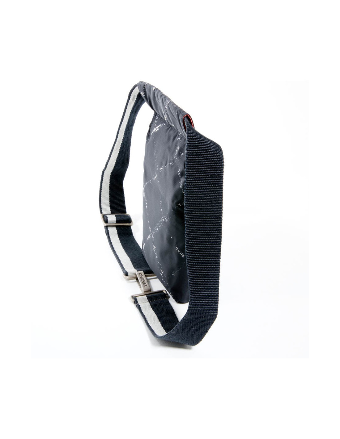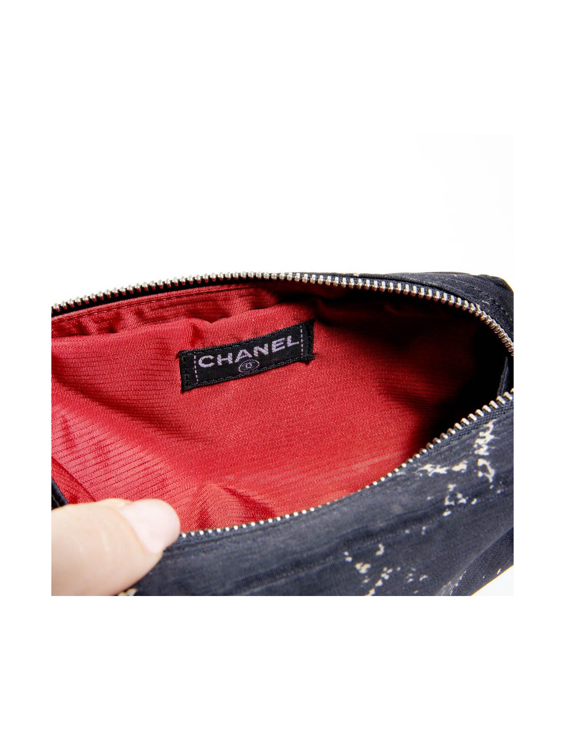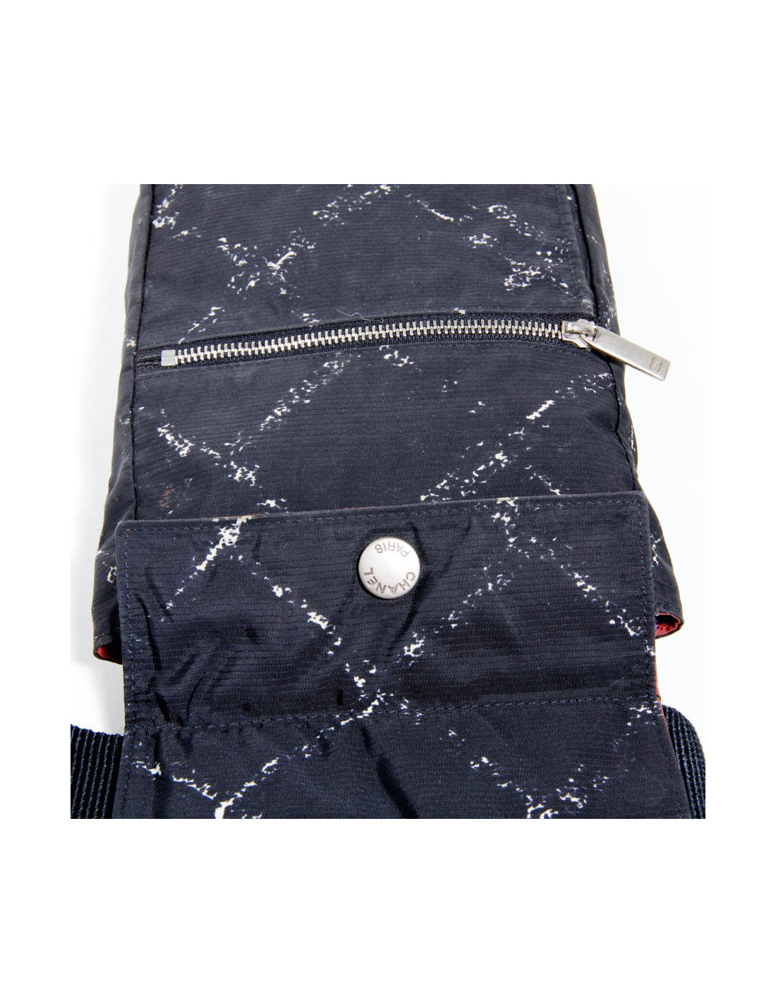 Ceinture Chanel agrémentée d'un longue pochette et de son porte-monnaie en toile. Elle a son hologramme. Elle est en très bon état extérieur, mais a des traces sous le rabat, ayant déjà été portée. Se ferme par un bouton pression argent. Le porte-monnaie se ferme par un zip.