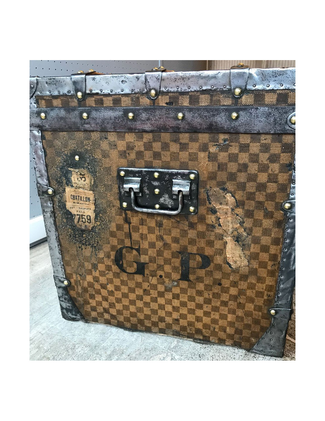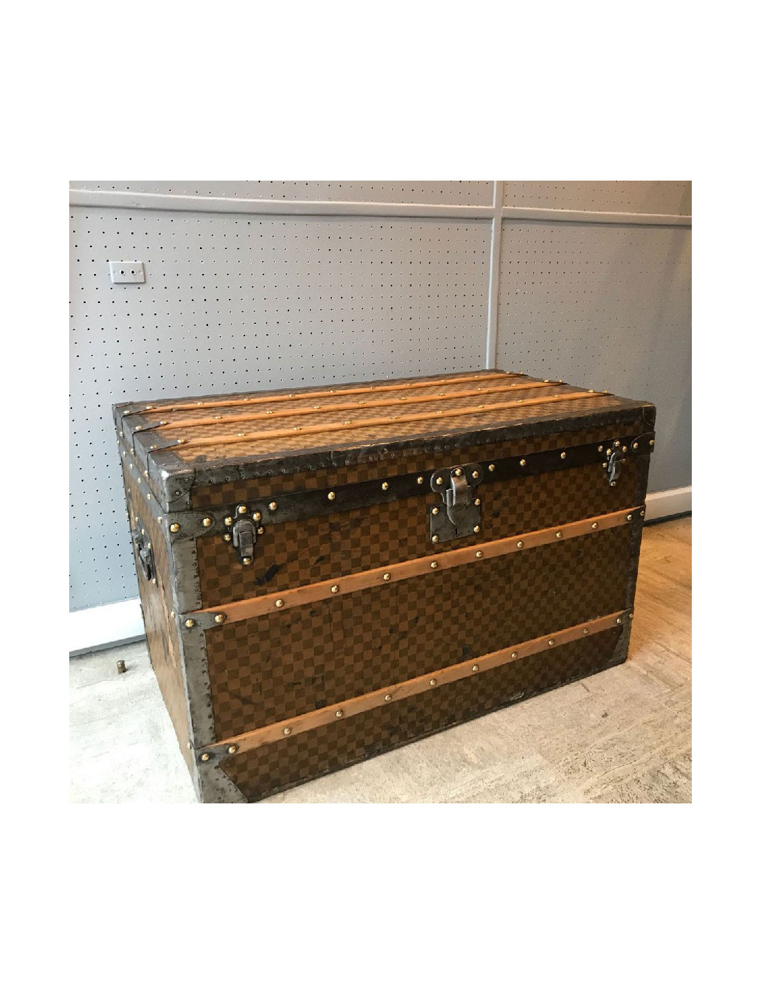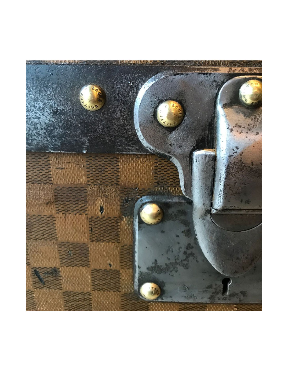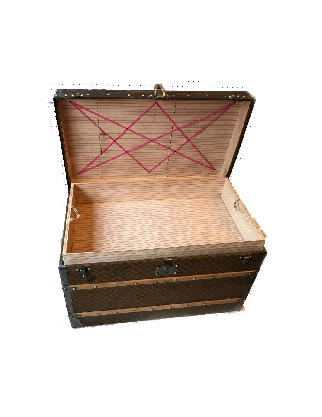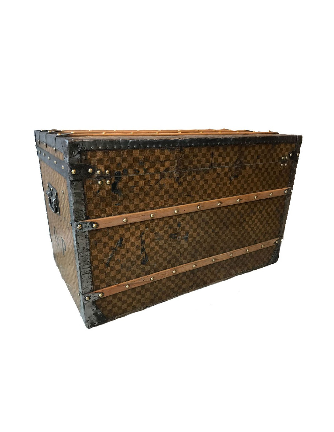 Malle Louis Vuitton vintage en toile damier datant de l’exposition universelle, très probablement fabriquée au 18eme siècle. La toile damier est la première toile créée par Louis Vuitton, avant le légendaire LV.