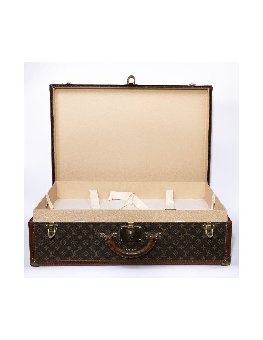 Cette magnifique malle (valise rigide) LOUIS VUITTON est en toile monogram. C'est le modèle Bisten 70. L' accastillage est en métal doré. La doublure est en toile. La poignée arrondie est en cuir. L'intérieur est composé d'un double compartiment de rangement avec sangles de maintien. Pour fermer la malle une Serrure "S" ( avec deux clés) est renforcée de deux loquets complémentaires. Les bordures de la malle sont en cuir Monogram renforcées de rivets et angles en métal doré. La valise porte les initiales "CB" sous la serrure. Le porte-étiquette d'adresse est présent . Elle est en bon état d'usage (marques et griffures d'usure sur la toile, et métallerie vieillie par le temps, intérieur parfait).