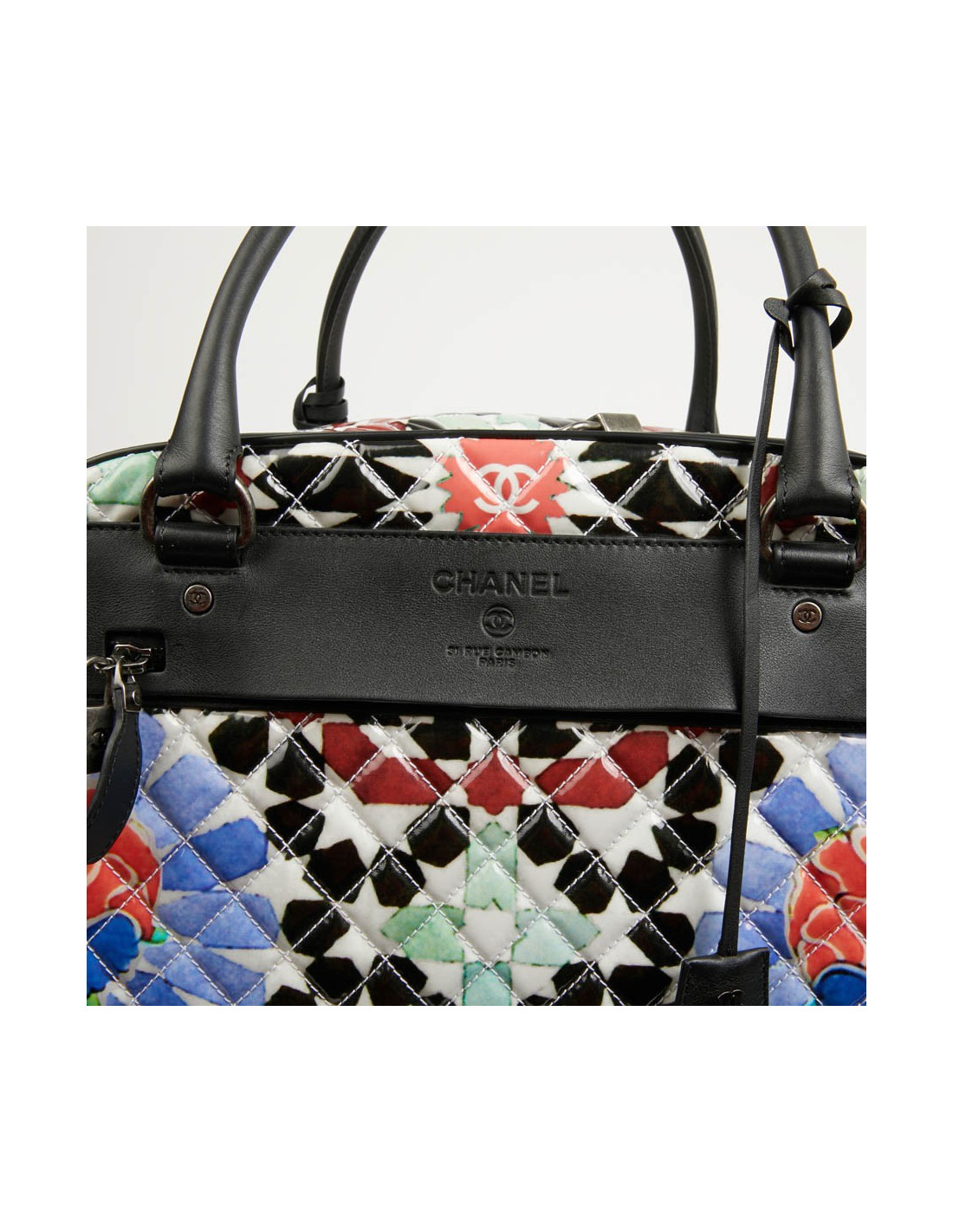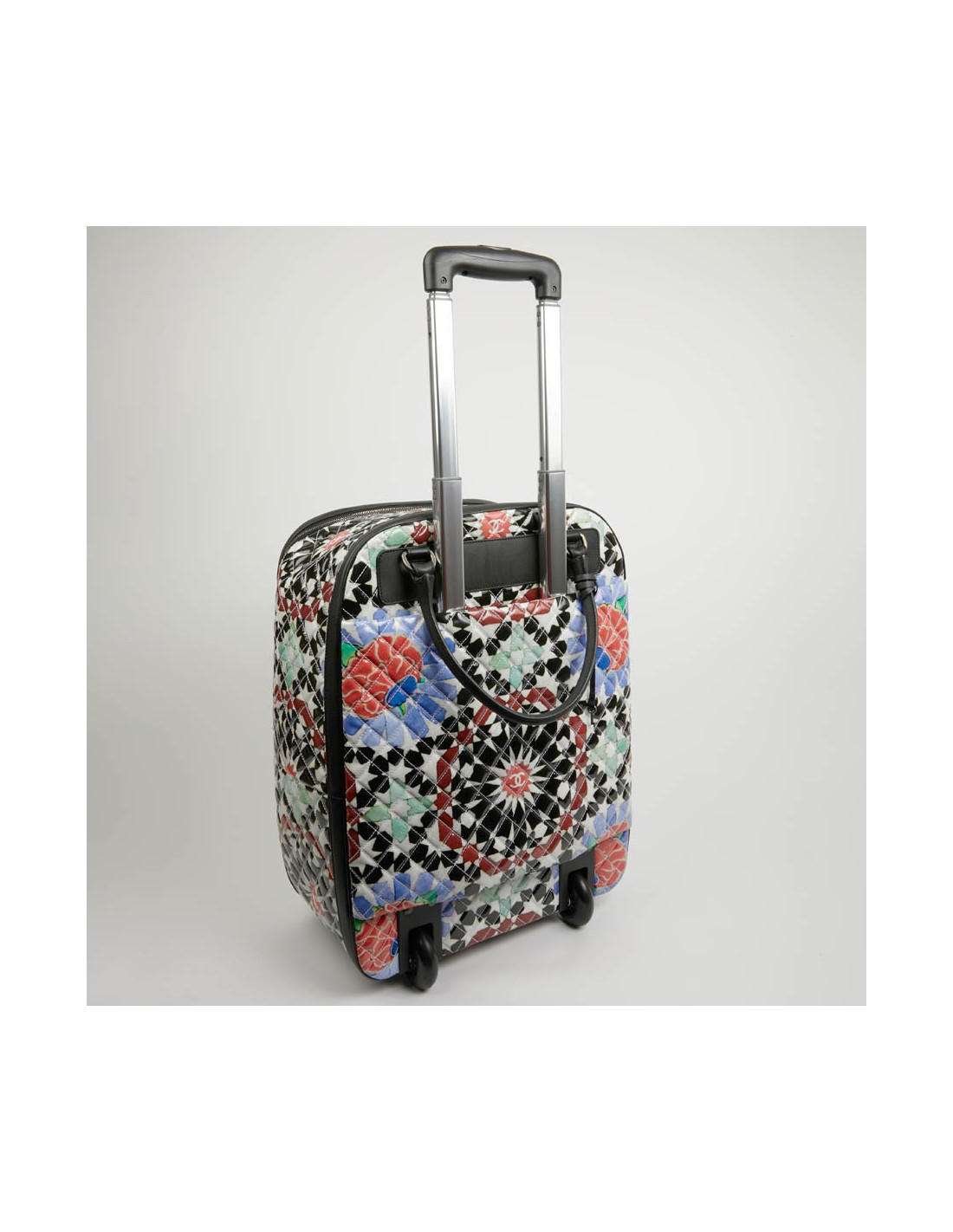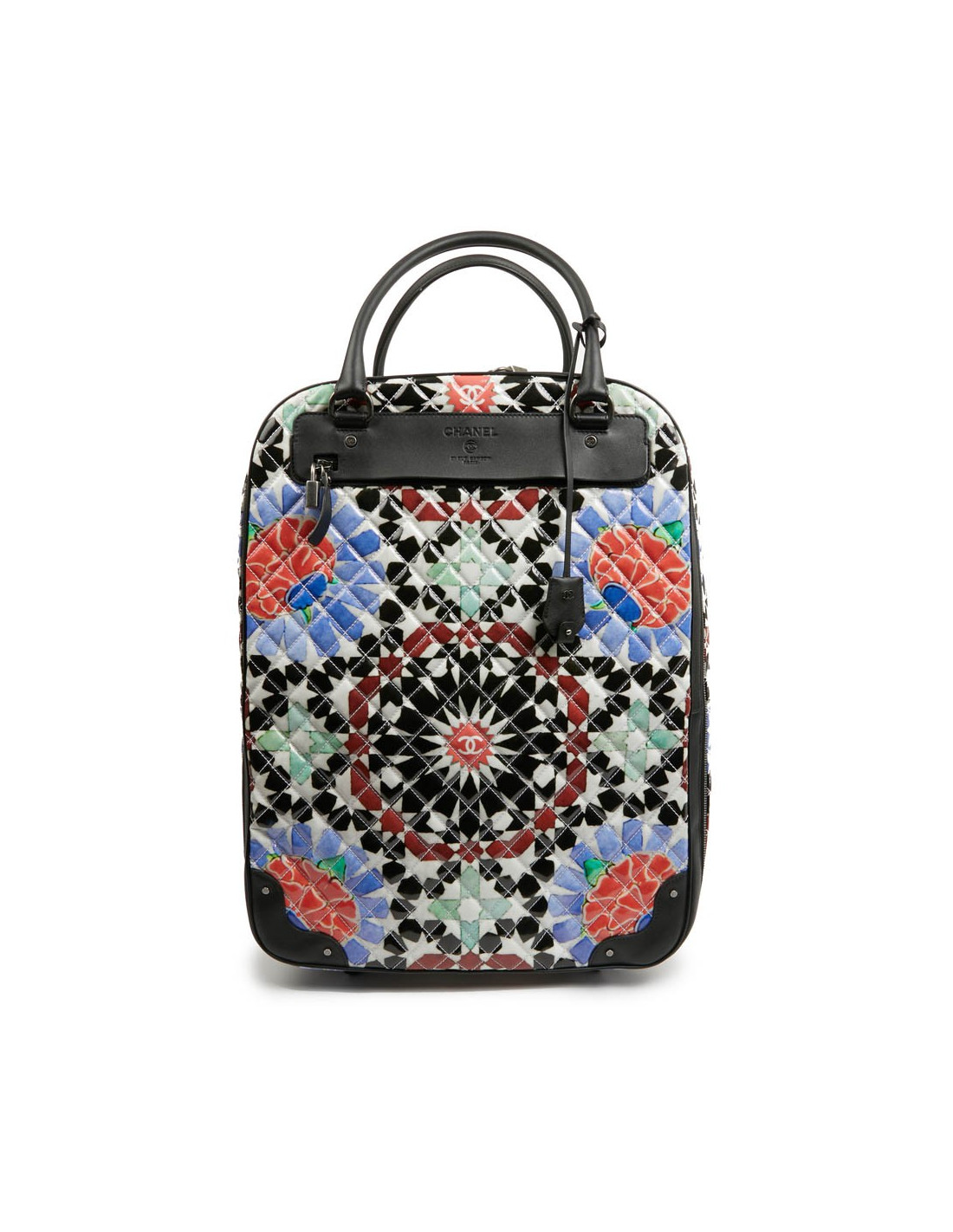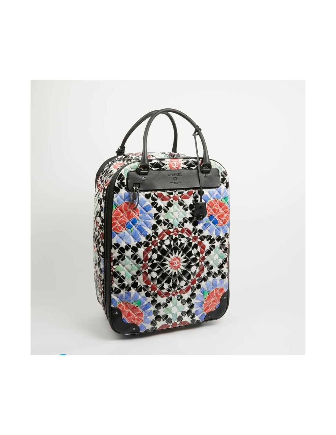 Bagage à main CHANEL en PVC verni multicolore : blanc, noir, rouge, bleu et vert. La bijouterie est en métal ruthénium. Elle a son cadenas, clés et clefs, avec une doublure noire, une grande poche zippée. Il y a à l'extérieur une poche sous le rabat marqué Chanel. Les finitions sont en cuir de veau noir. Valise montée sur deux roulettes. Elle est gravée "31 rue Cambon Paris", ce qui signifie qu'elle a été exclusivement vendue rue Cambon, la Maison mère. Légère et pratique avec sa poignée télescopique, ce sac sera parfait lors de vos déplacements. Les motifs nous rappellent les mosaïques d'orient, un clin d'oeil à la Collection Paris-Dubaî dont le sac est issu.
