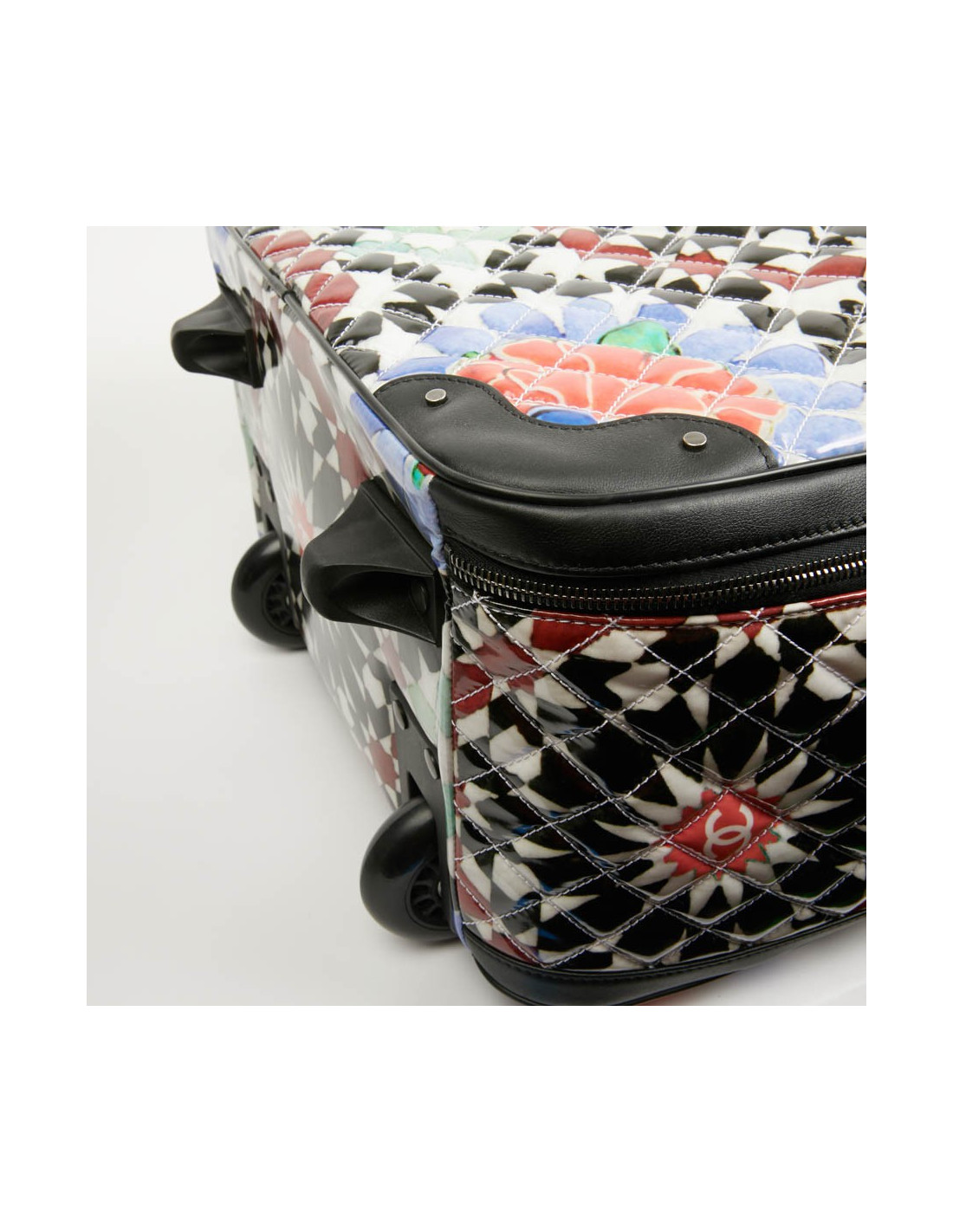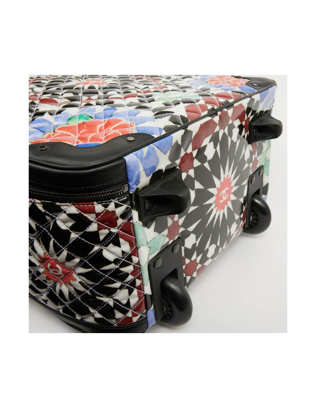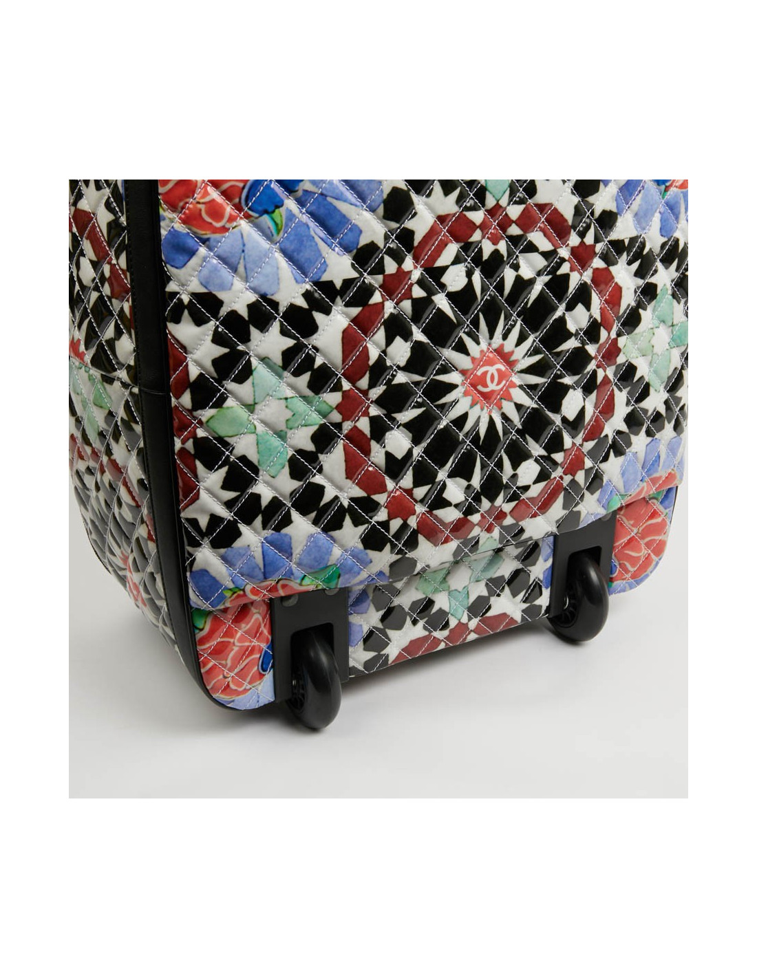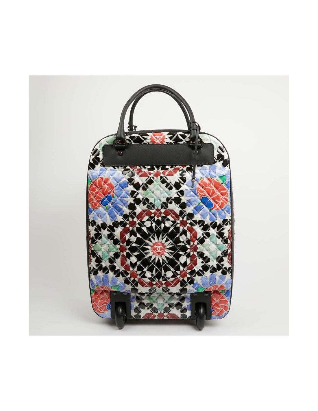 Bagage à main CHANEL en PVC verni multicolore : blanc, noir, rouge, bleu et vert. La bijouterie est en métal ruthénium. Elle a son cadenas, clés et clefs, avec une doublure noire, une grande poche zippée. Il y a à l'extérieur une poche sous le rabat marqué Chanel. Les finitions sont en cuir de veau noir. Valise montée sur deux roulettes. Elle est gravée "31 rue Cambon Paris", ce qui signifie qu'elle a été exclusivement vendue rue Cambon, la Maison mère. Légère et pratique avec sa poignée télescopique, ce sac sera parfait lors de vos déplacements. Les motifs nous rappellent les mosaïques d'orient, un clin d'oeil à la Collection Paris-Dubaî dont le sac est issu.