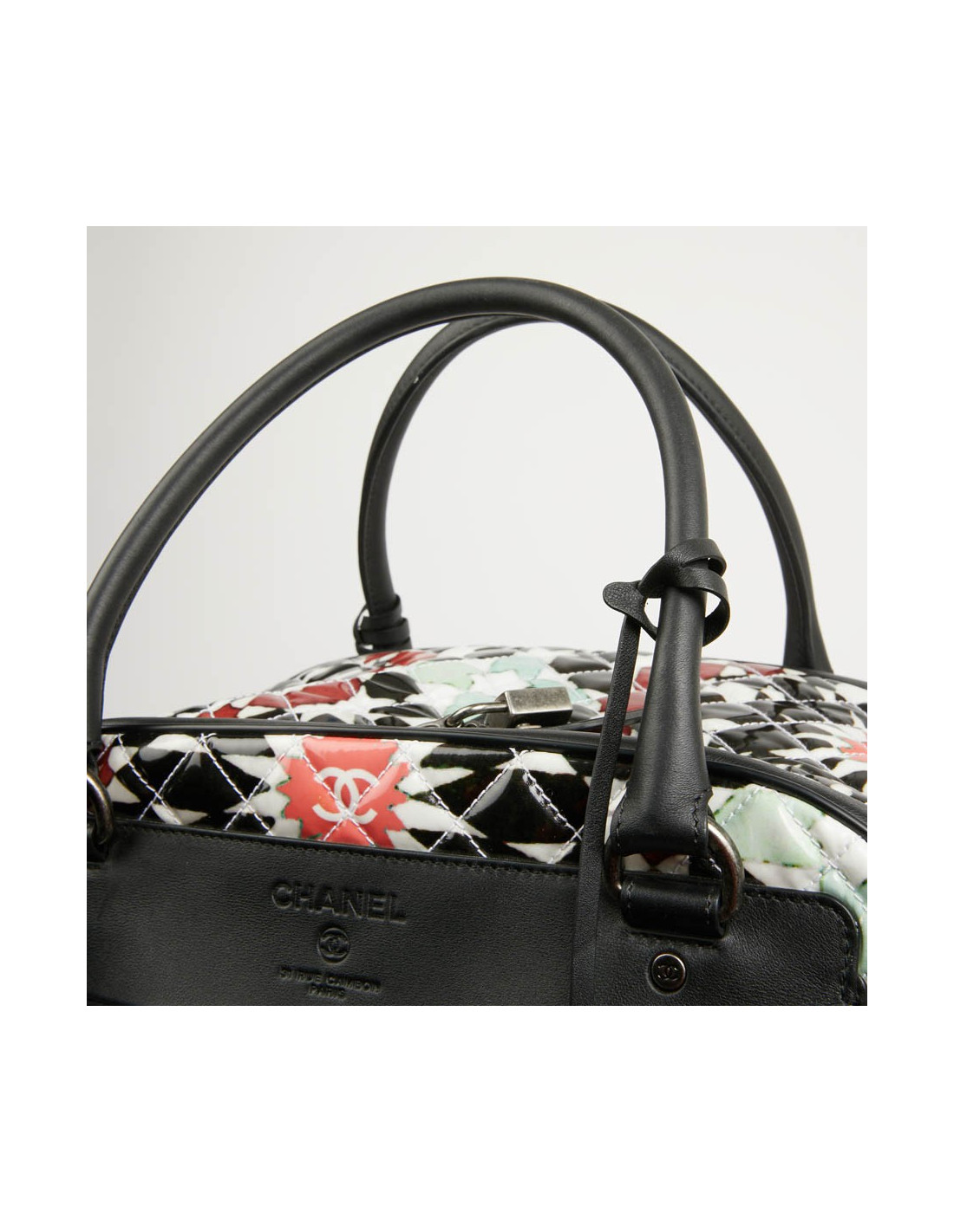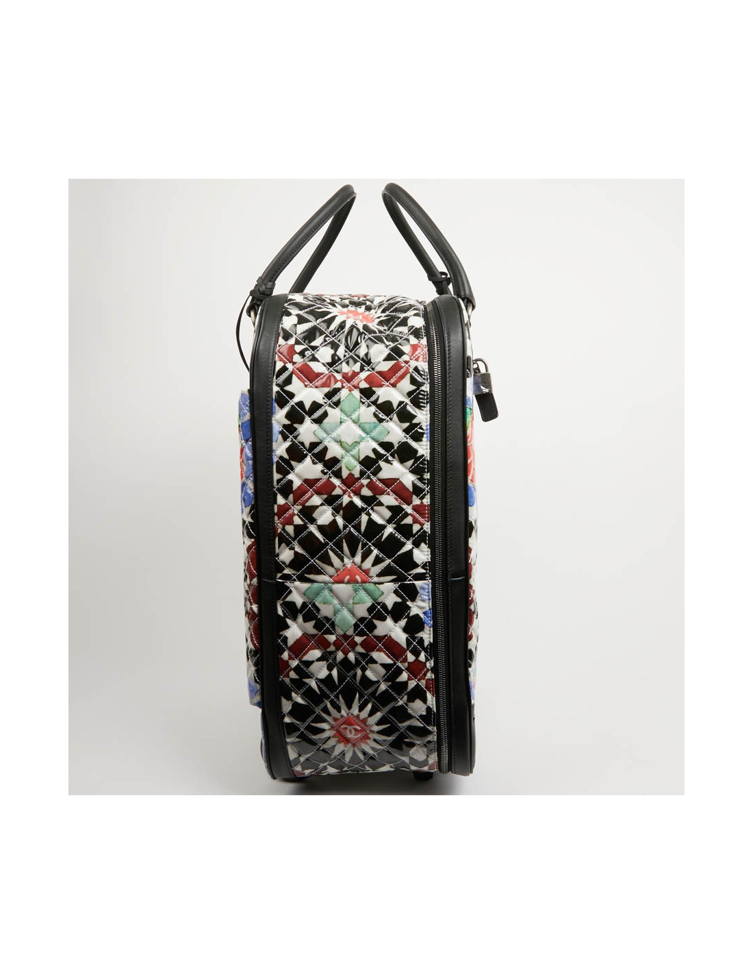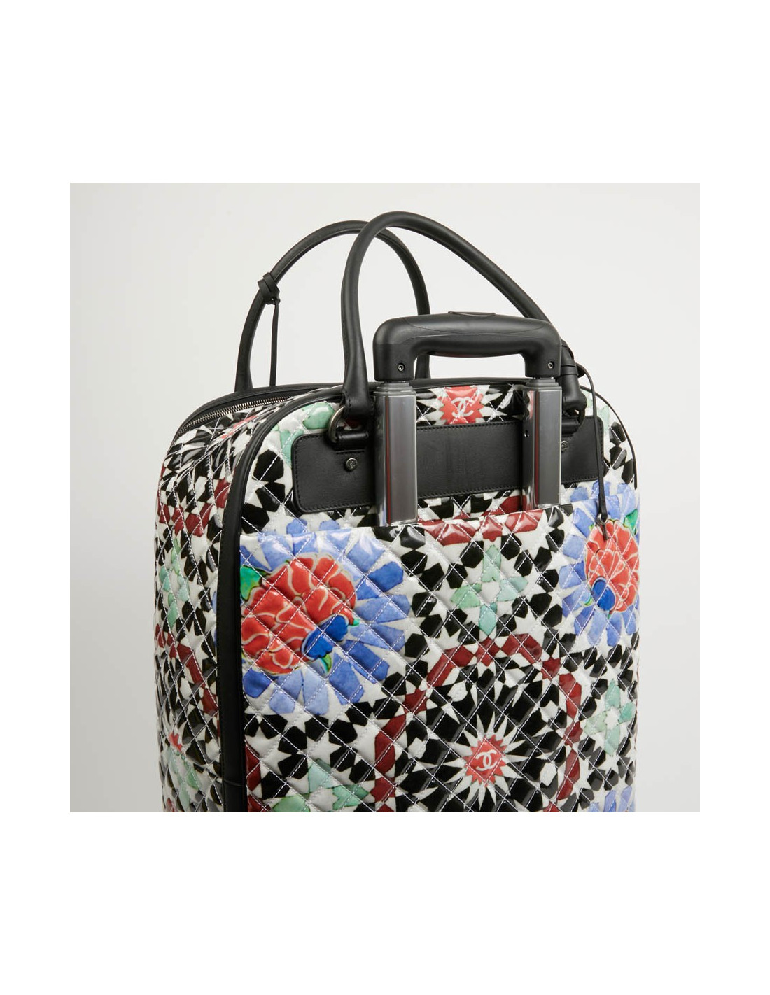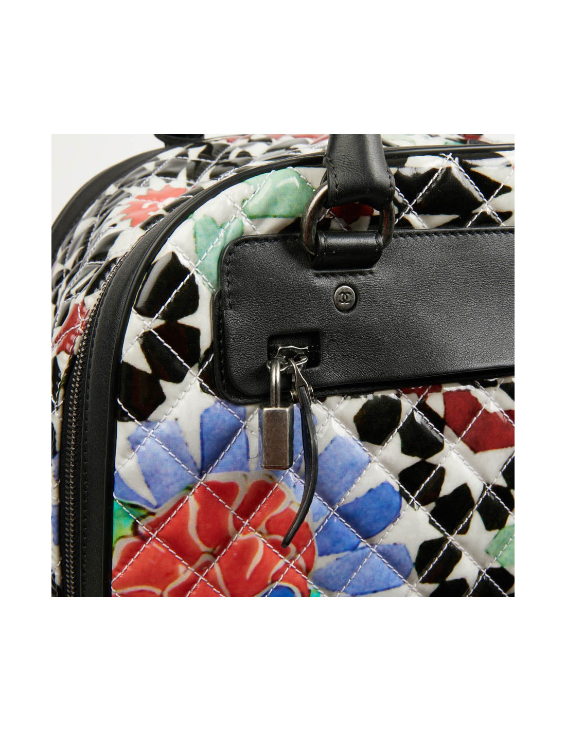 Bagage à main CHANEL en PVC verni multicolore : blanc, noir, rouge, bleu et vert. La bijouterie est en métal ruthénium. Elle a son cadenas, clés et clefs, avec une doublure noire, une grande poche zippée. Il y a à l'extérieur une poche sous le rabat marqué Chanel. Les finitions sont en cuir de veau noir. Valise montée sur deux roulettes. Elle est gravée "31 rue Cambon Paris", ce qui signifie qu'elle a été exclusivement vendue rue Cambon, la Maison mère. Légère et pratique avec sa poignée télescopique, ce sac sera parfait lors de vos déplacements. Les motifs nous rappellent les mosaïques d'orient, un clin d'oeil à la Collection Paris-Dubaî dont le sac est issu.