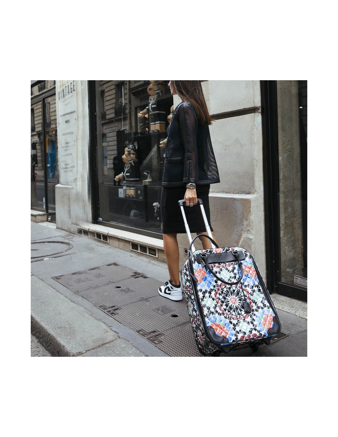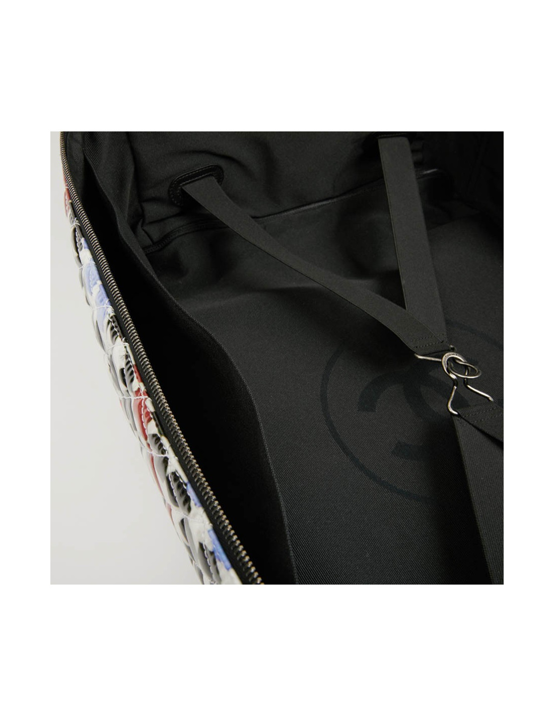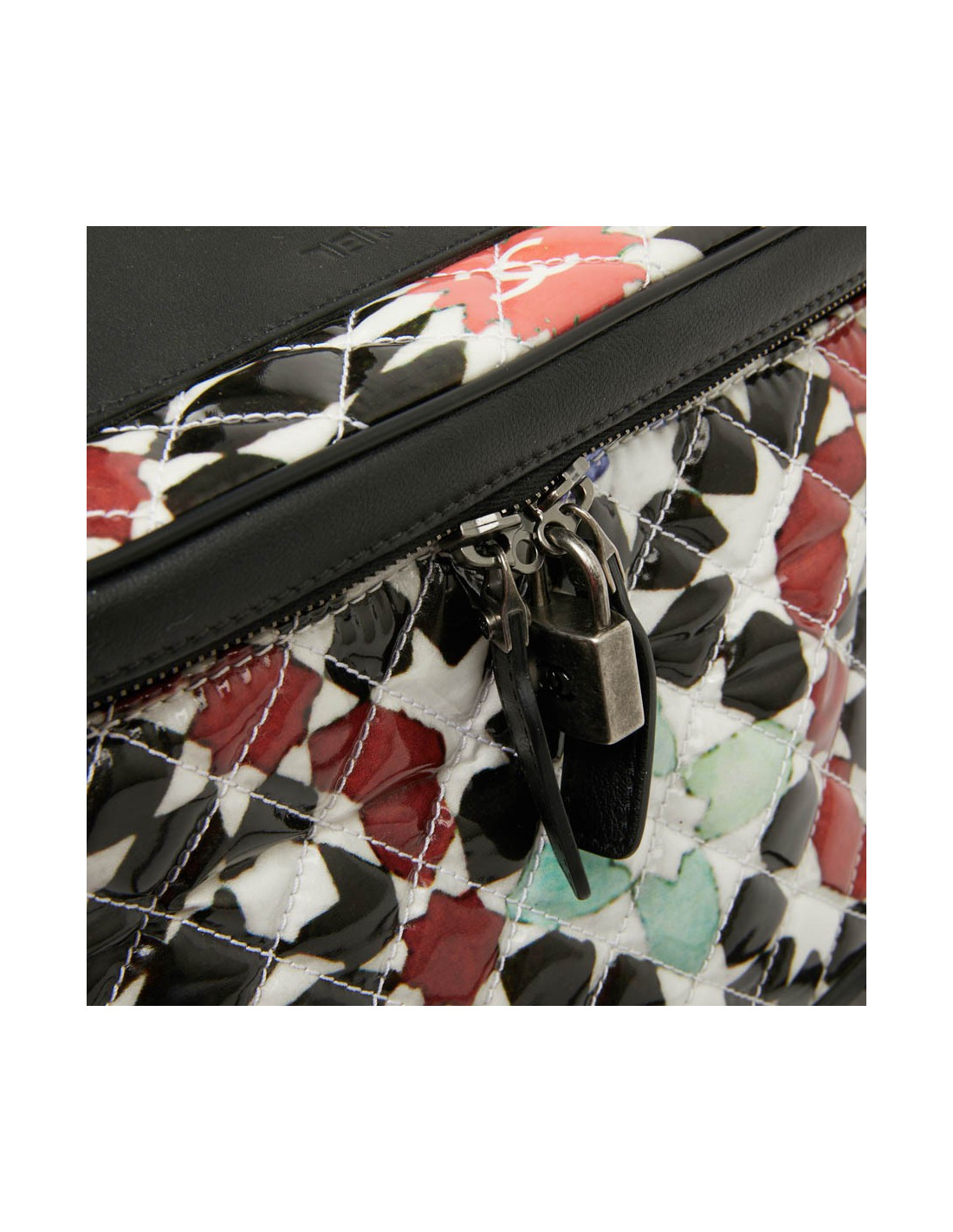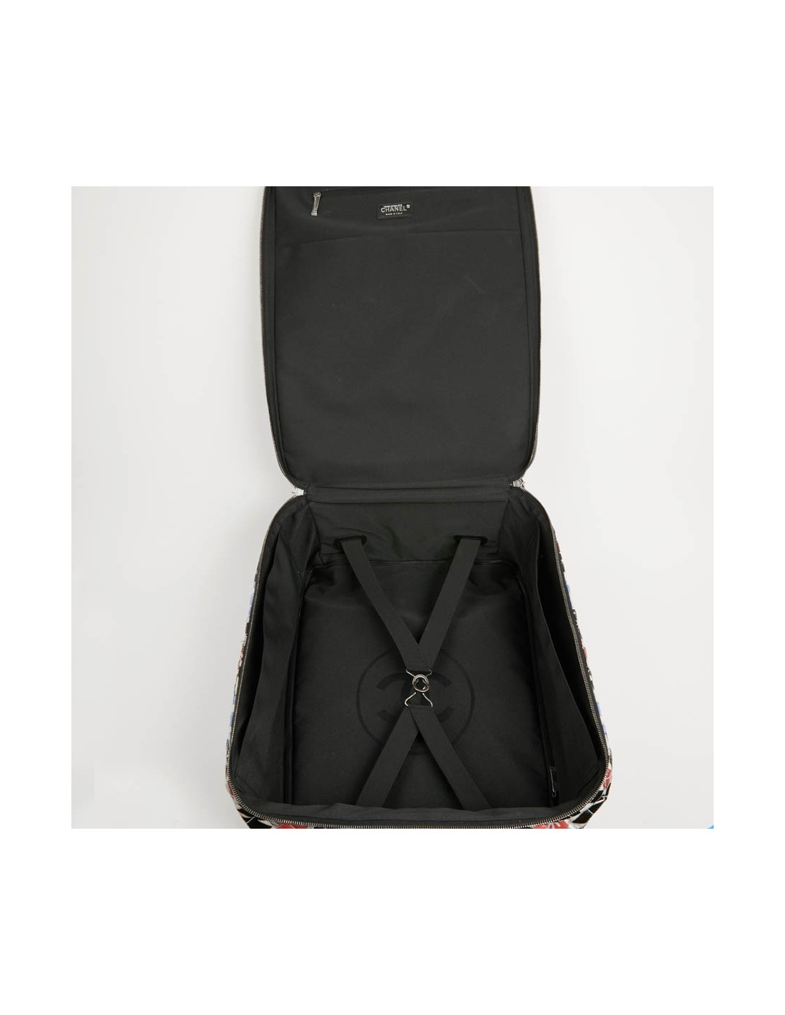 Bagage à main CHANEL en PVC verni multicolore : blanc, noir, rouge, bleu et vert. La bijouterie est en métal ruthénium. Elle a son cadenas, clés et clefs, avec une doublure noire, une grande poche zippée. Il y a à l'extérieur une poche sous le rabat marqué Chanel. Les finitions sont en cuir de veau noir. Valise montée sur deux roulettes. Elle est gravée "31 rue Cambon Paris", ce qui signifie qu'elle a été exclusivement vendue rue Cambon, la Maison mère. Légère et pratique avec sa poignée télescopique, ce sac sera parfait lors de vos déplacements. Les motifs nous rappellent les mosaïques d'orient, un clin d'oeil à la Collection Paris-Dubaî dont le sac est issu.