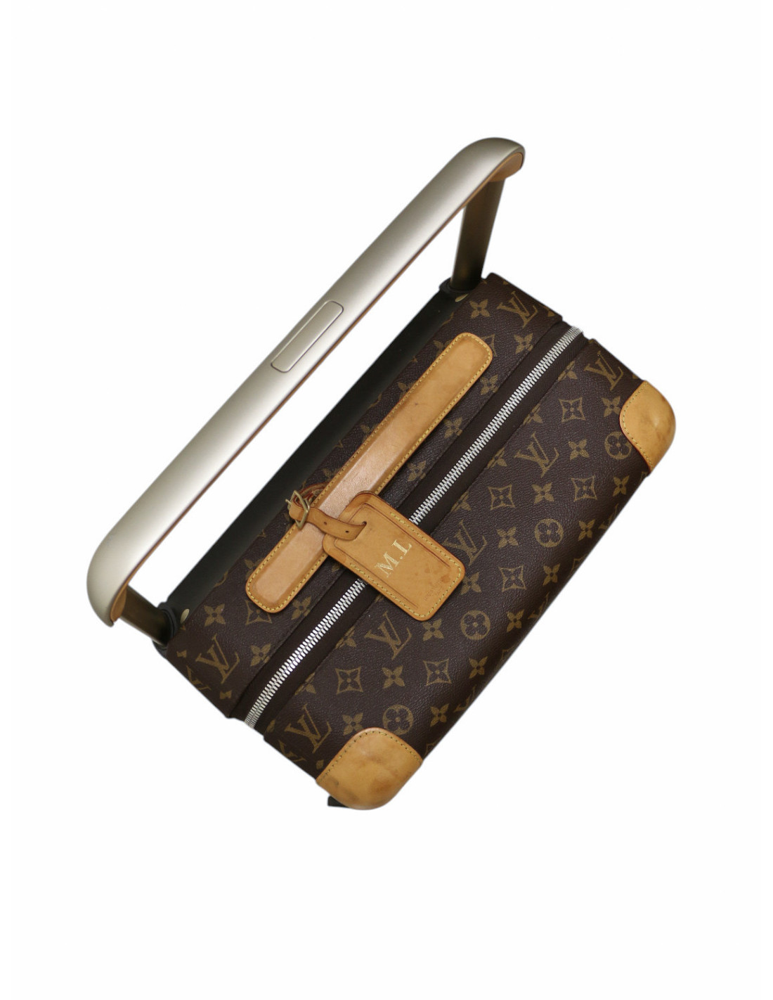 Détails : valise imaginée par Marc Newson, le designer le plus influent de son époque. Elle est en toile, ce qui la rend légère, et sa garniture est en cuir de vache. Ce modèle de valise est très maniable, elle a quatre roues. Elle se ferme par un cadenas homologué TSA. Patine sur le cuir. Le porte-nom présente les initiales M.L. mais il peut être remplacé chez Louis Vuitton.