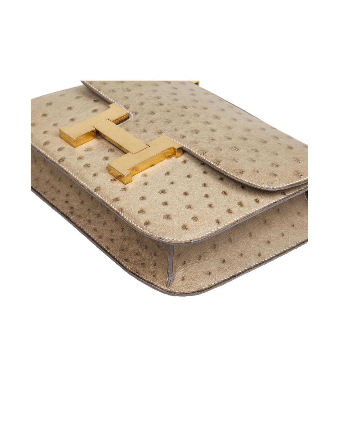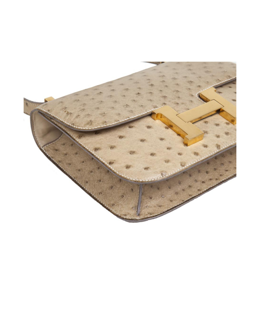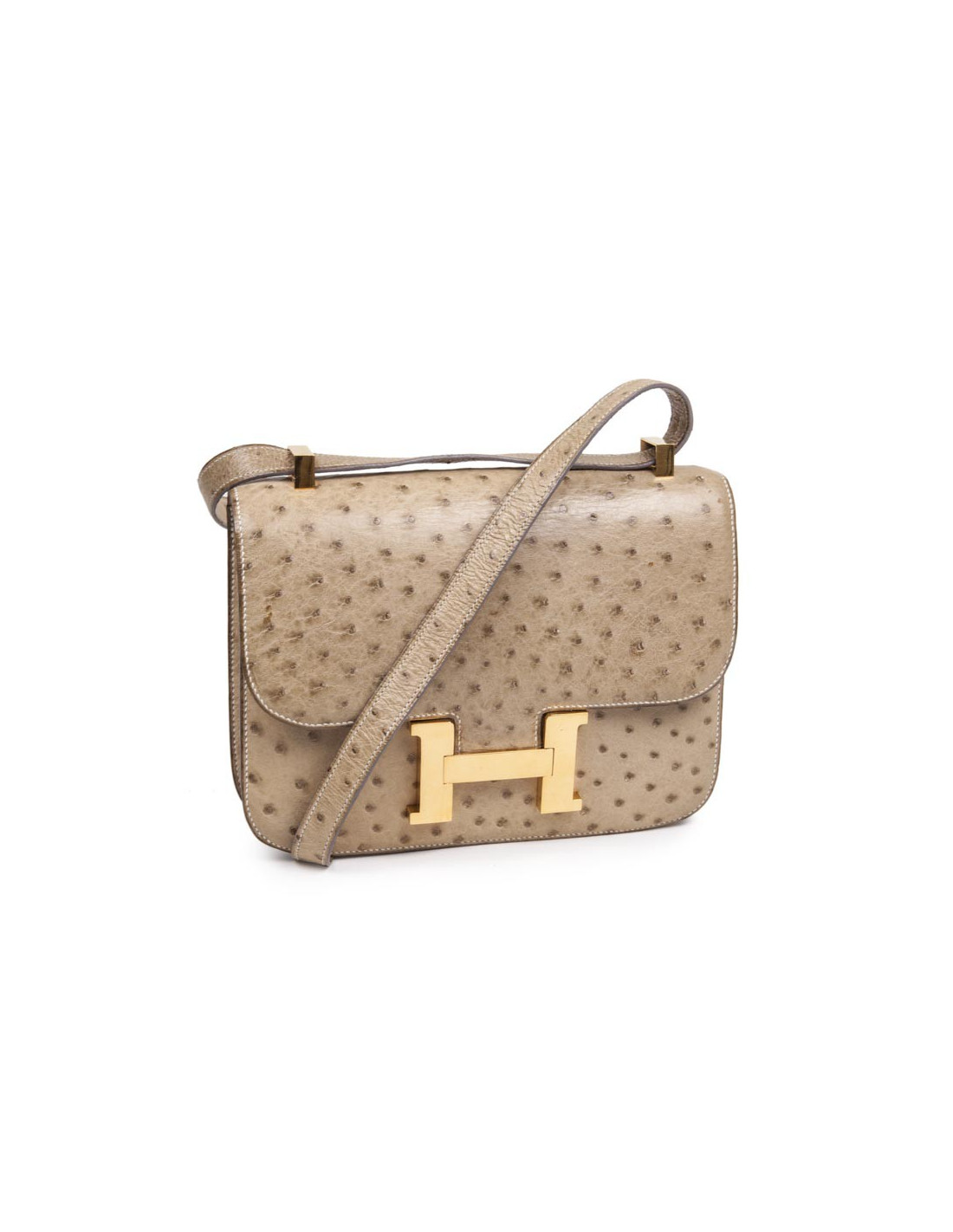 Sac "Constance" HERMES en cuir d'autruche de couleur sable. bijouterie plaquée or (micro rayures d'usage). rabat avec fermoir H, se porte à la main ou à l'épaule. Intérieur en cuir sable avec une poche zippée et une fente plaquée.
