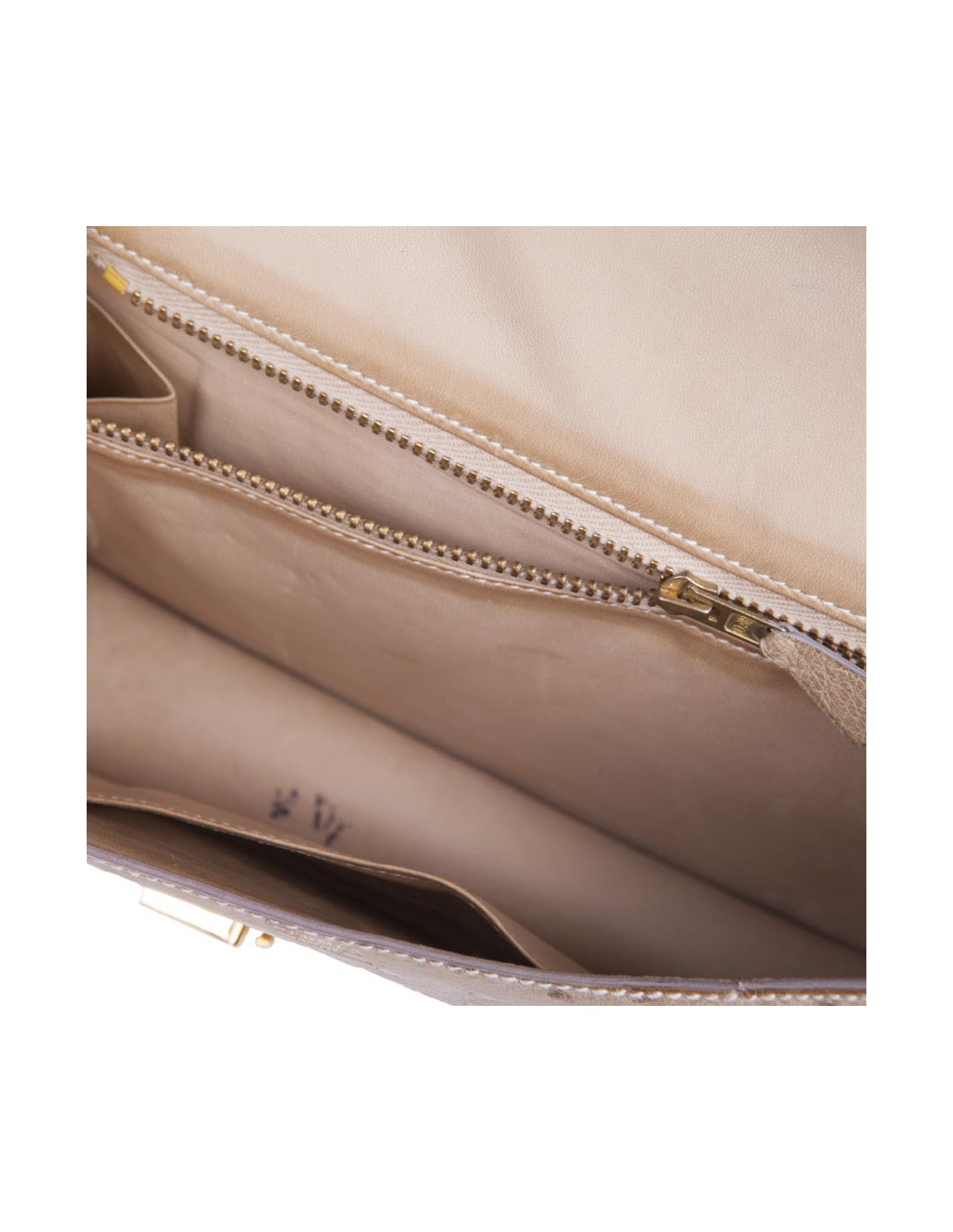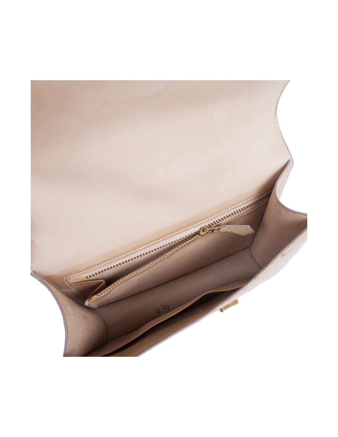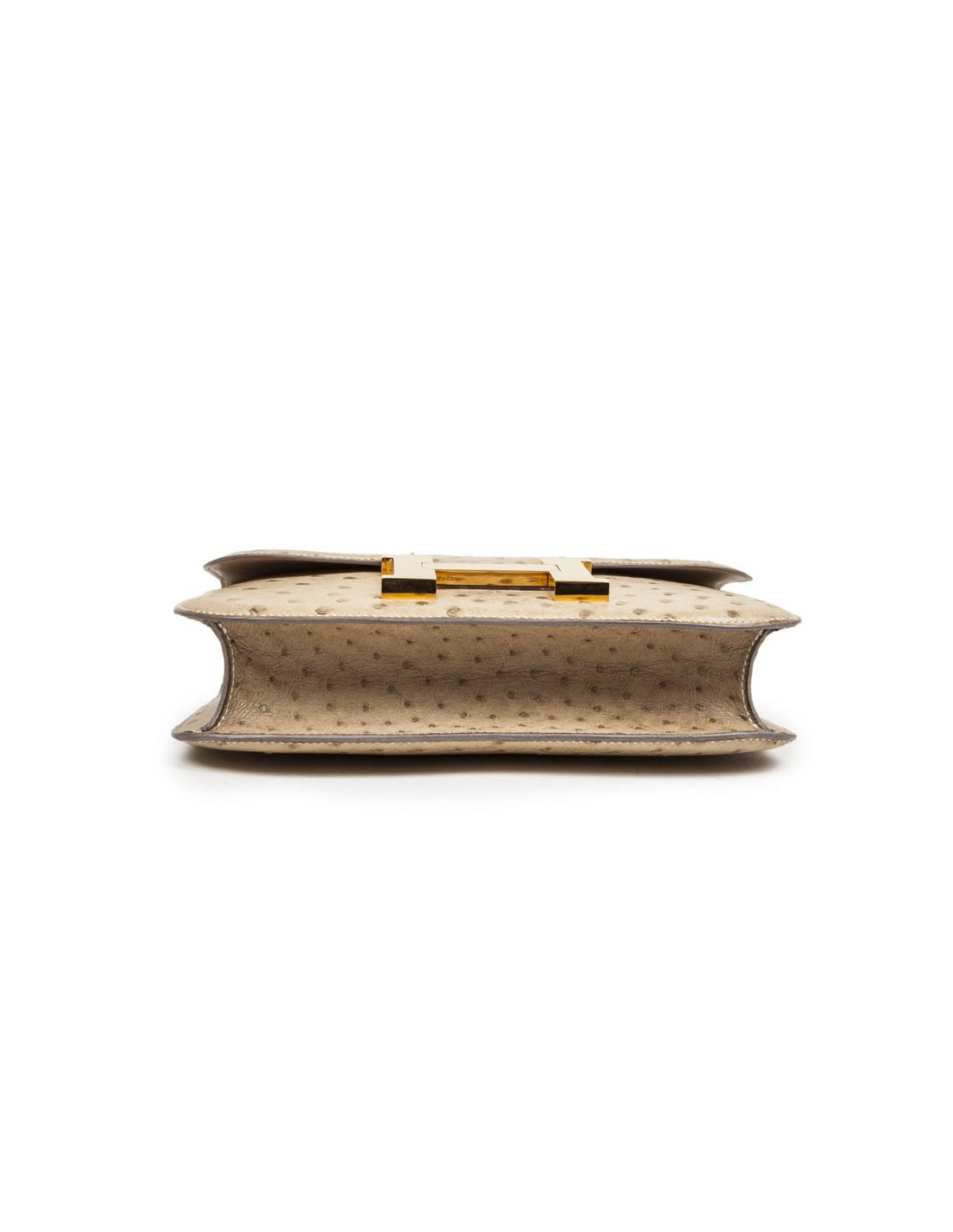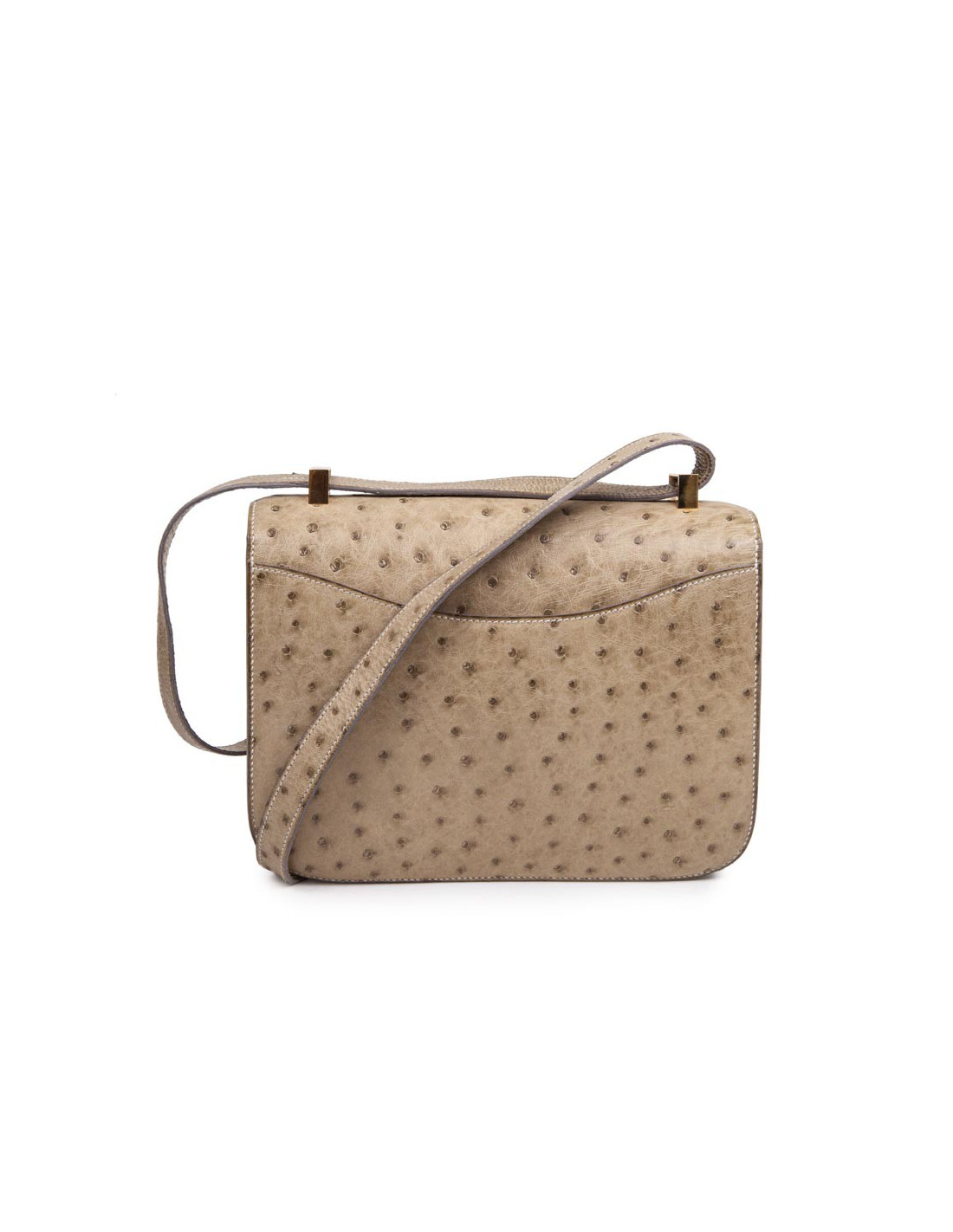 Sac "Constance" HERMES en cuir d'autruche de couleur sable. bijouterie plaquée or (micro rayures d'usage). rabat avec fermoir H, se porte à la main ou à l'épaule. Intérieur en cuir sable avec une poche zippée et une fente plaquée.