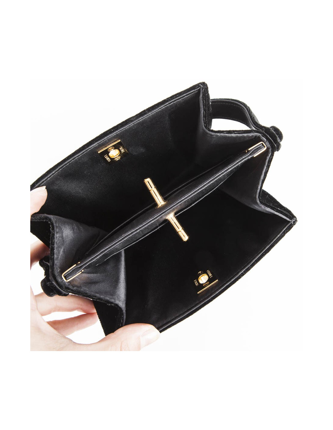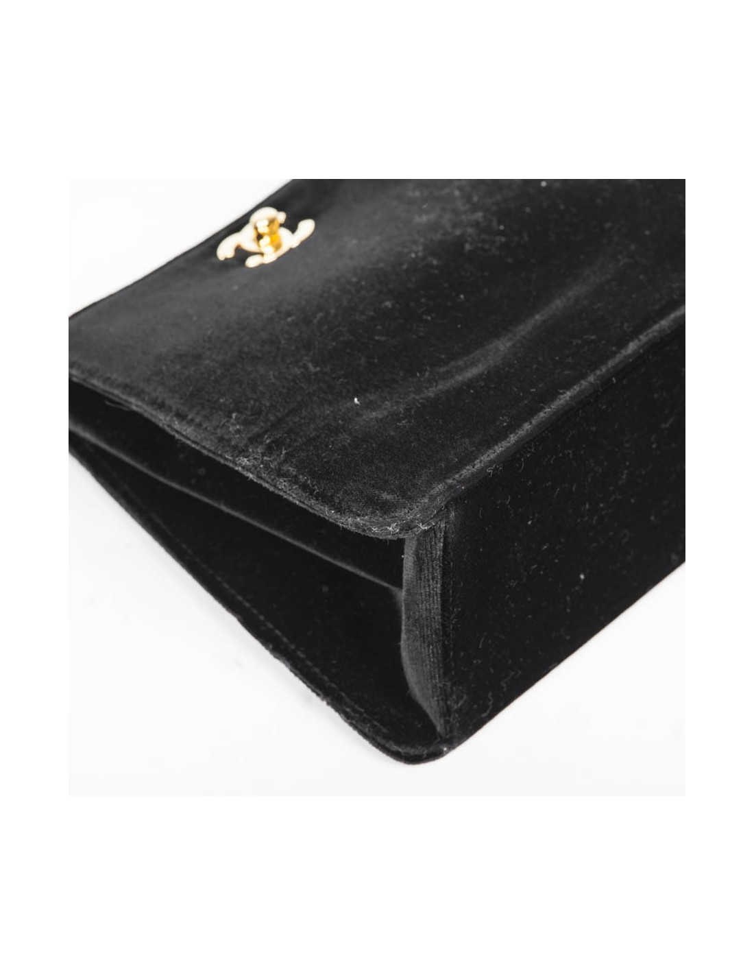 Petit sac du soir Chanel en velours de soie noir. Accastillage doré. Le sac est séparé en deux parties distinctes, fermées individuellement par un fermoir "CC".