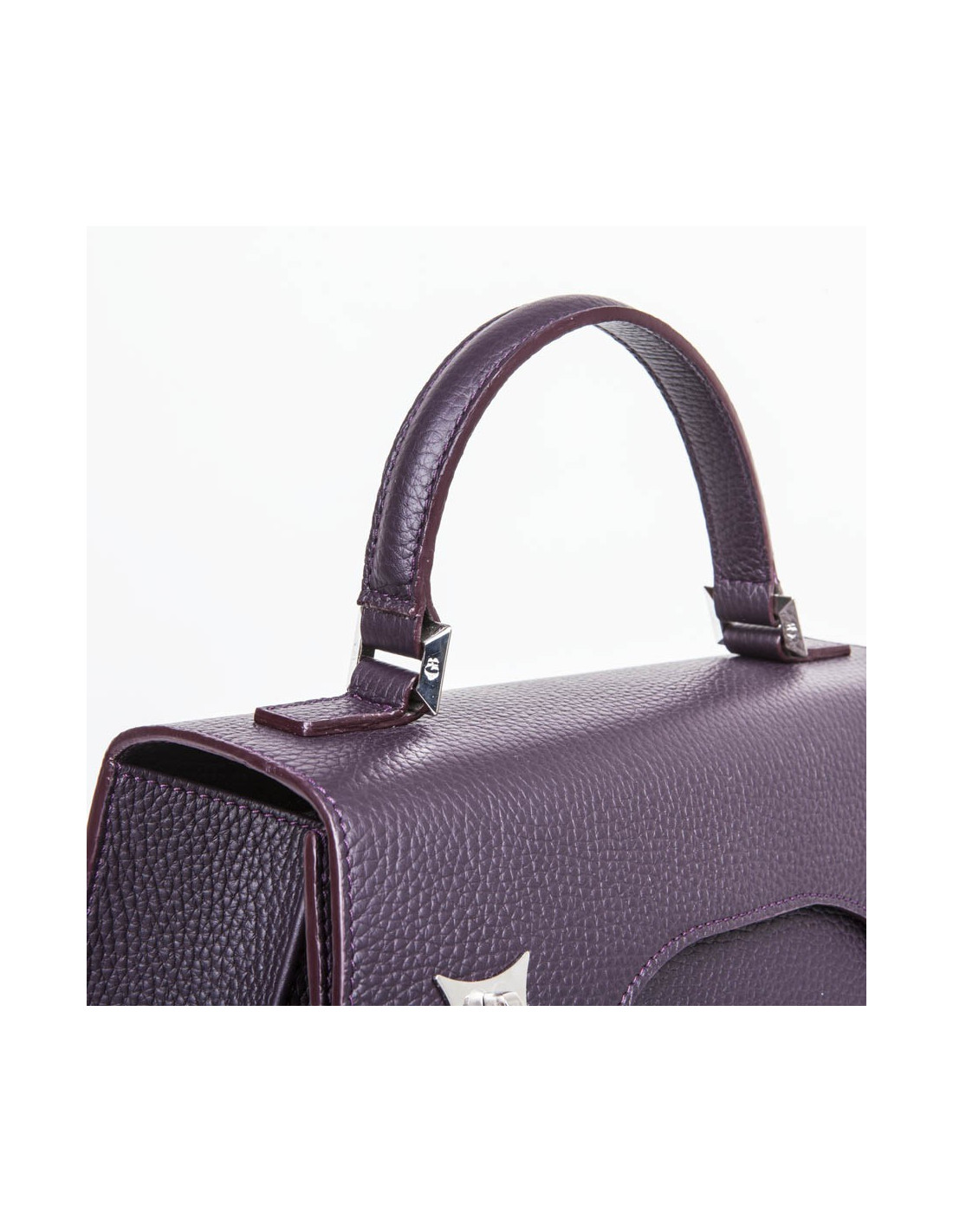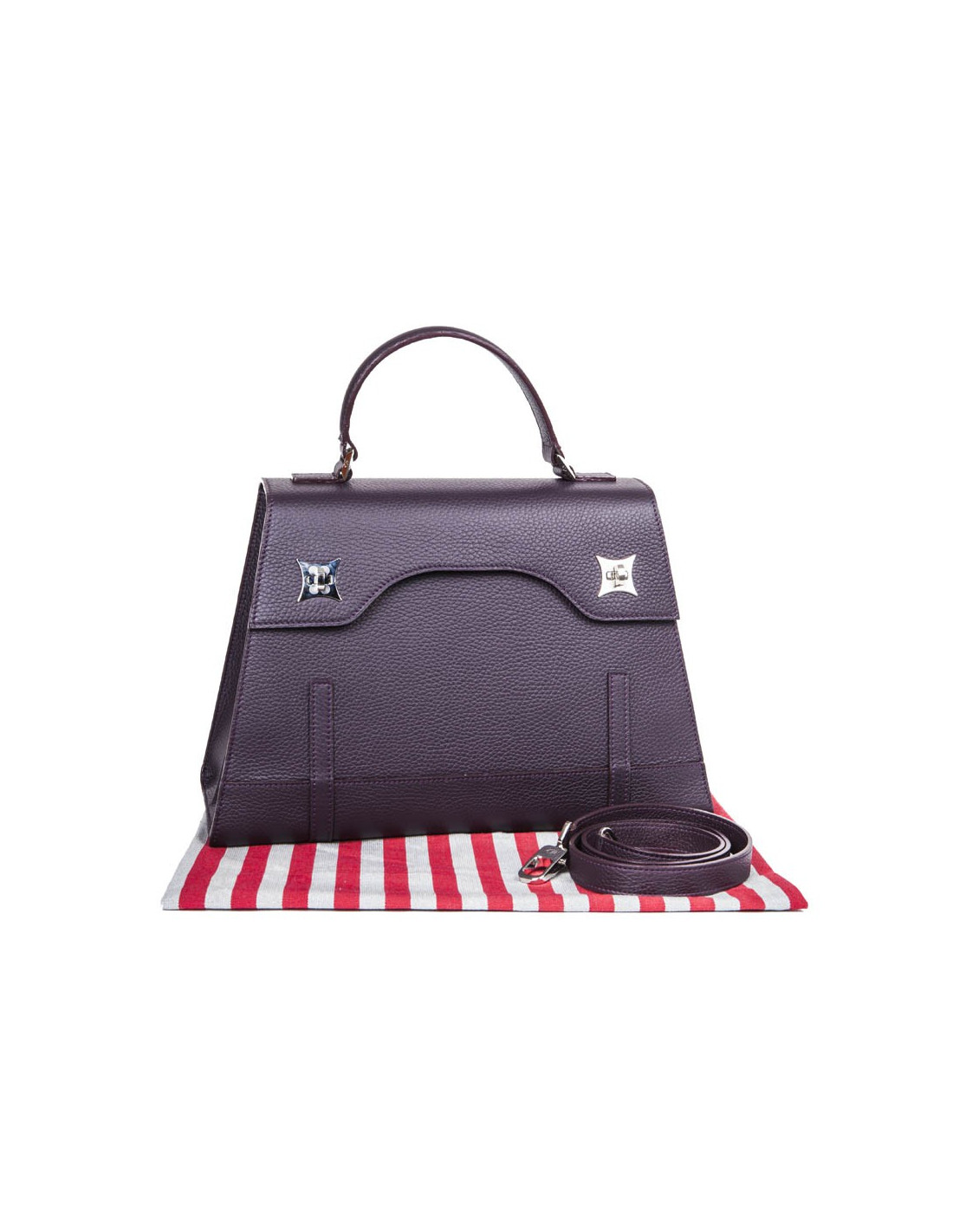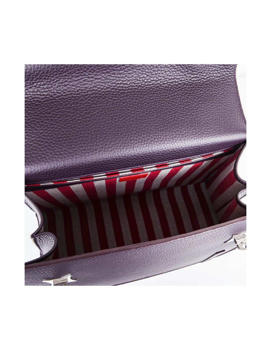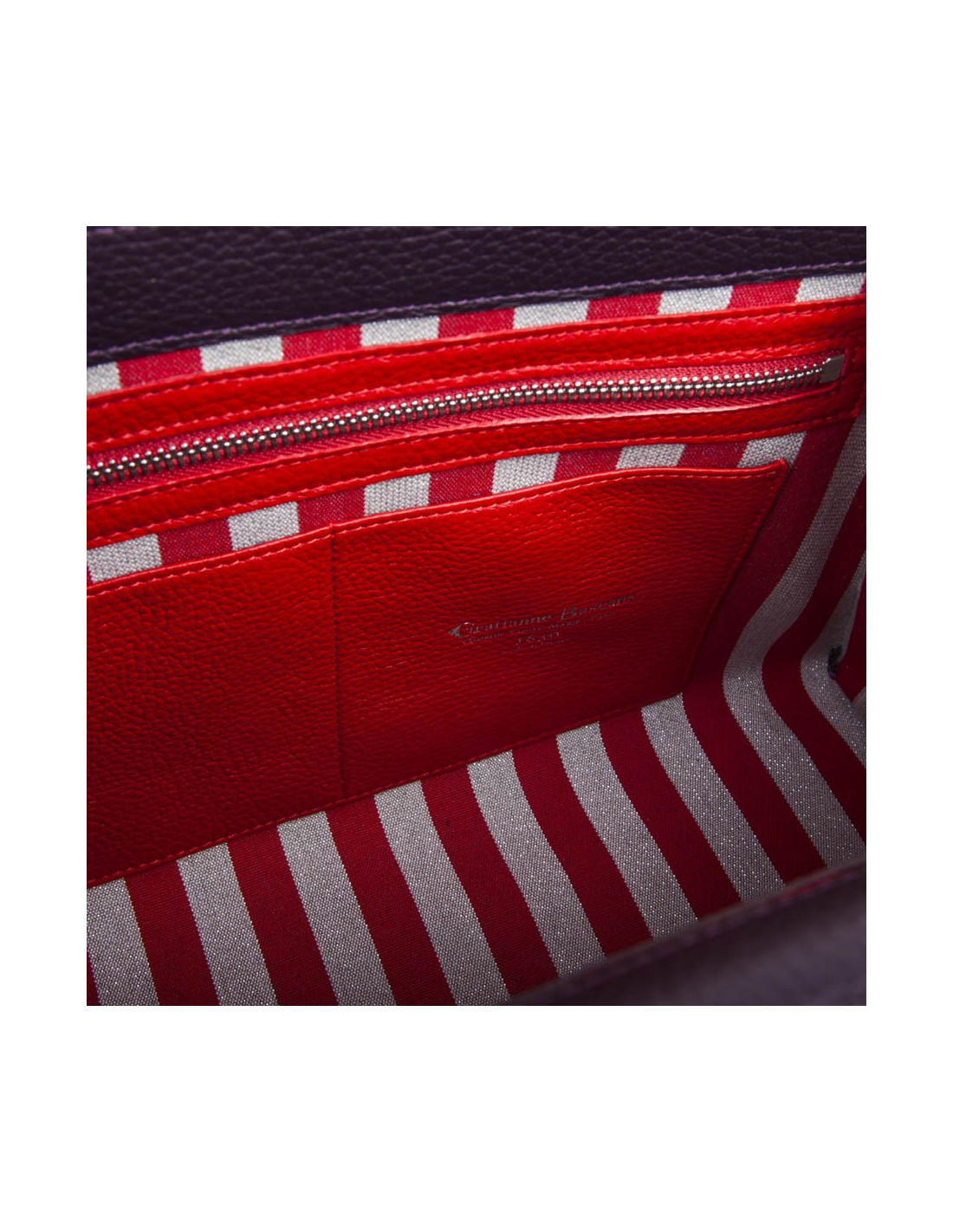 Sac 'Amandine' de la Maison Gratianne Bascans en cuir taurillon lagun. Pièces métalliques en laiton palladium brillant. Intérieur en toile Bayadère argent et rouge. Une poche intérieure zippée et trois poches ouvertes. Clous de fond pour protection du sac. Porté main ou à l'épaule à l'aide d'une bandoulière amovible. Etat neuf.