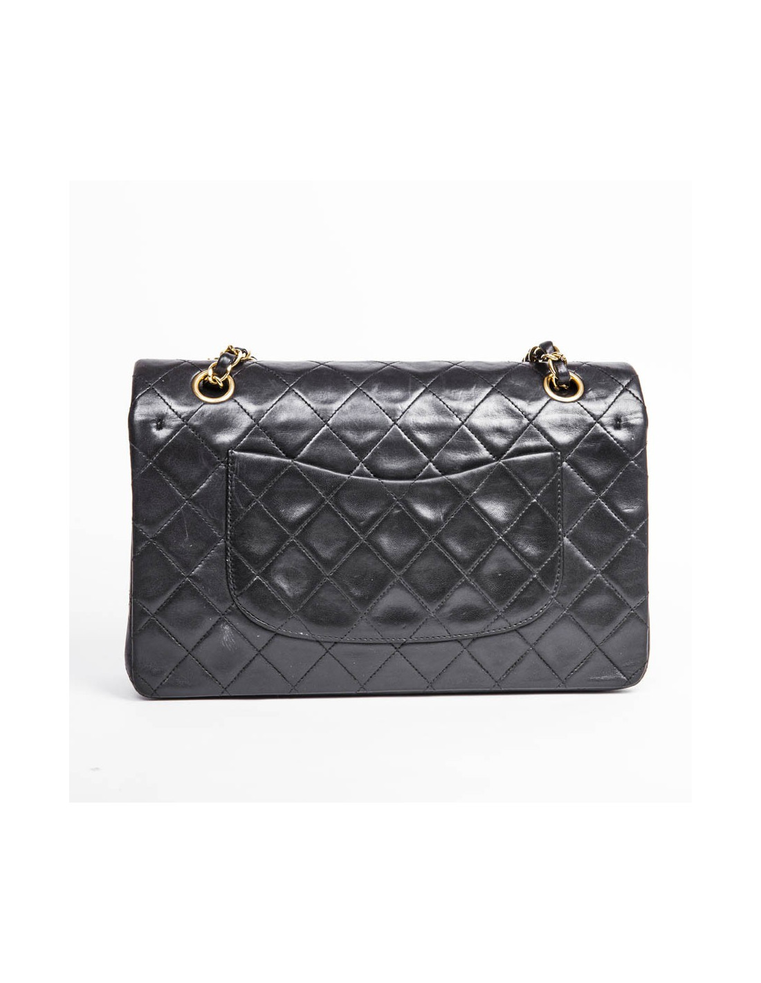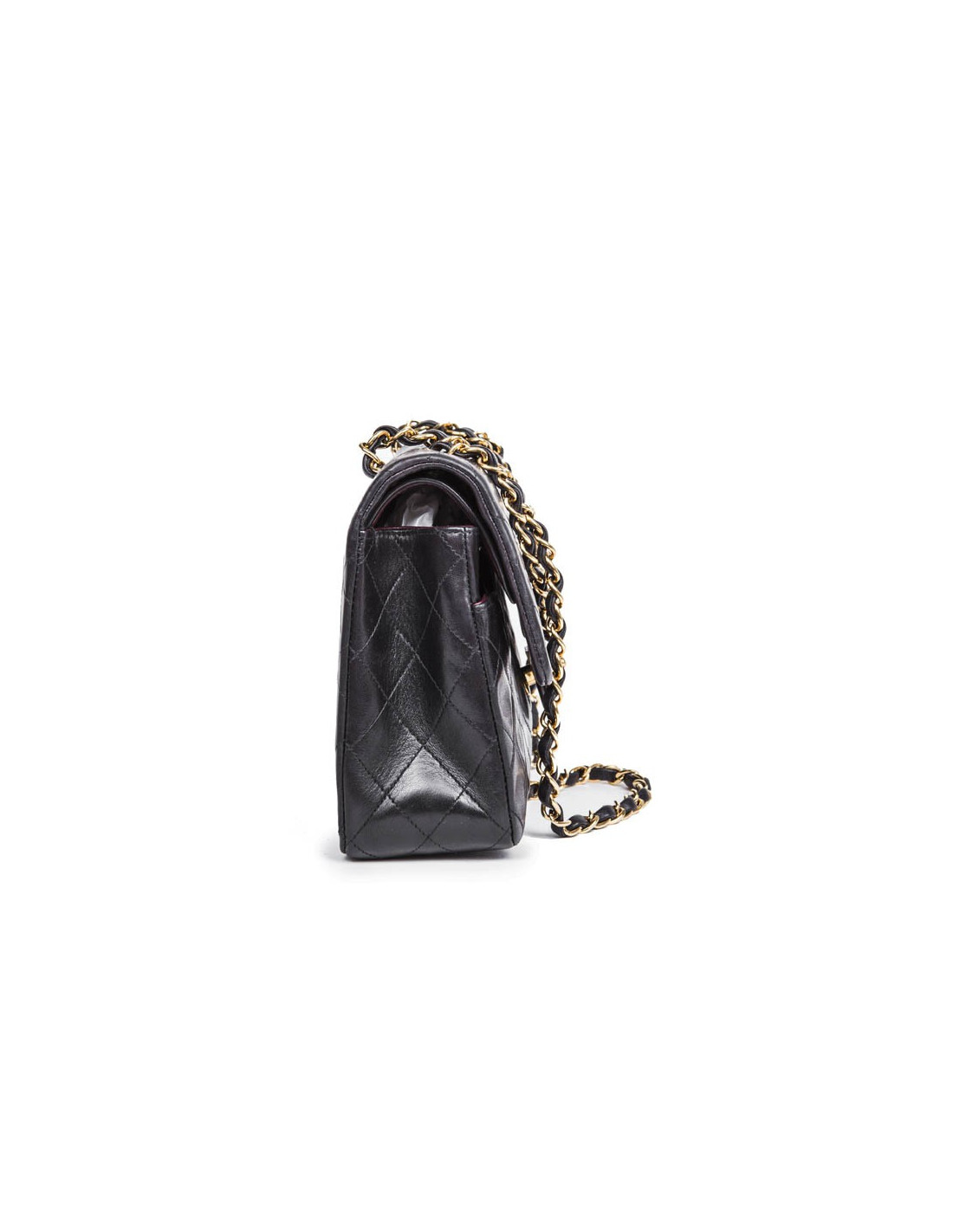 Sac Timeless Chanel en cuir d'agneau lisse matelassé noir. Bijouterie dorée. Double rabat. L'intérieur est en cuir bordeaux.