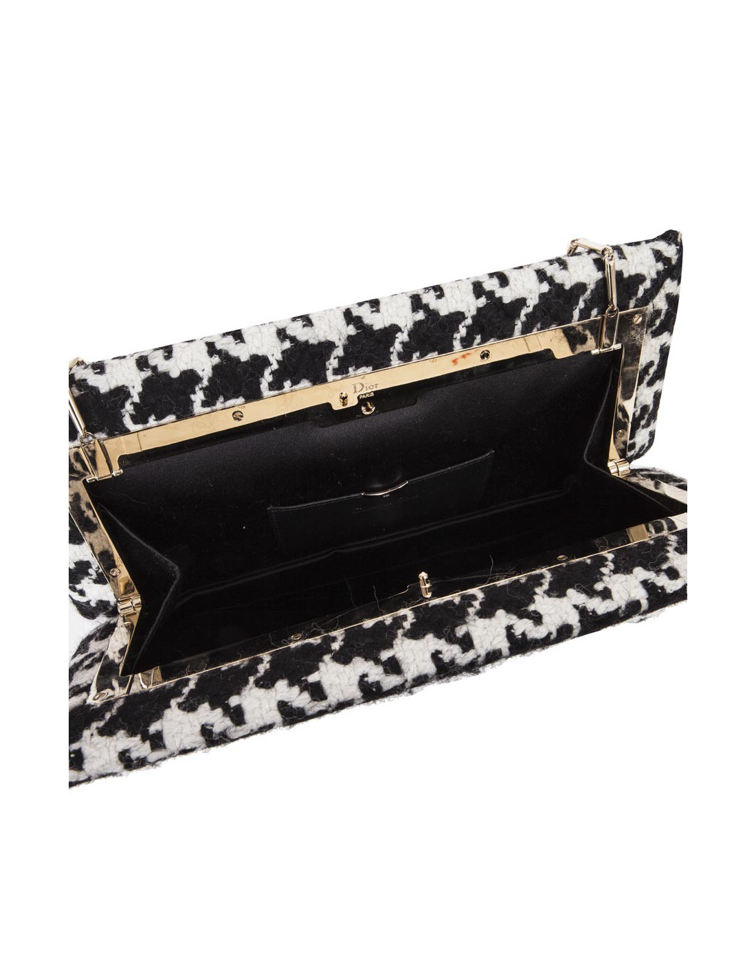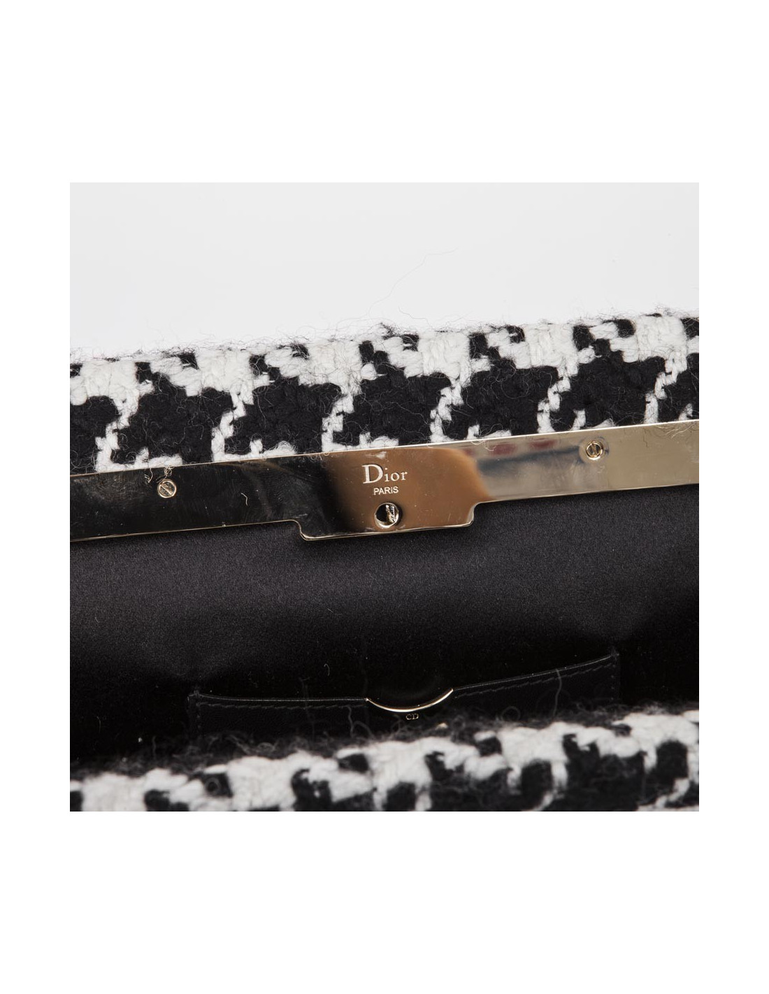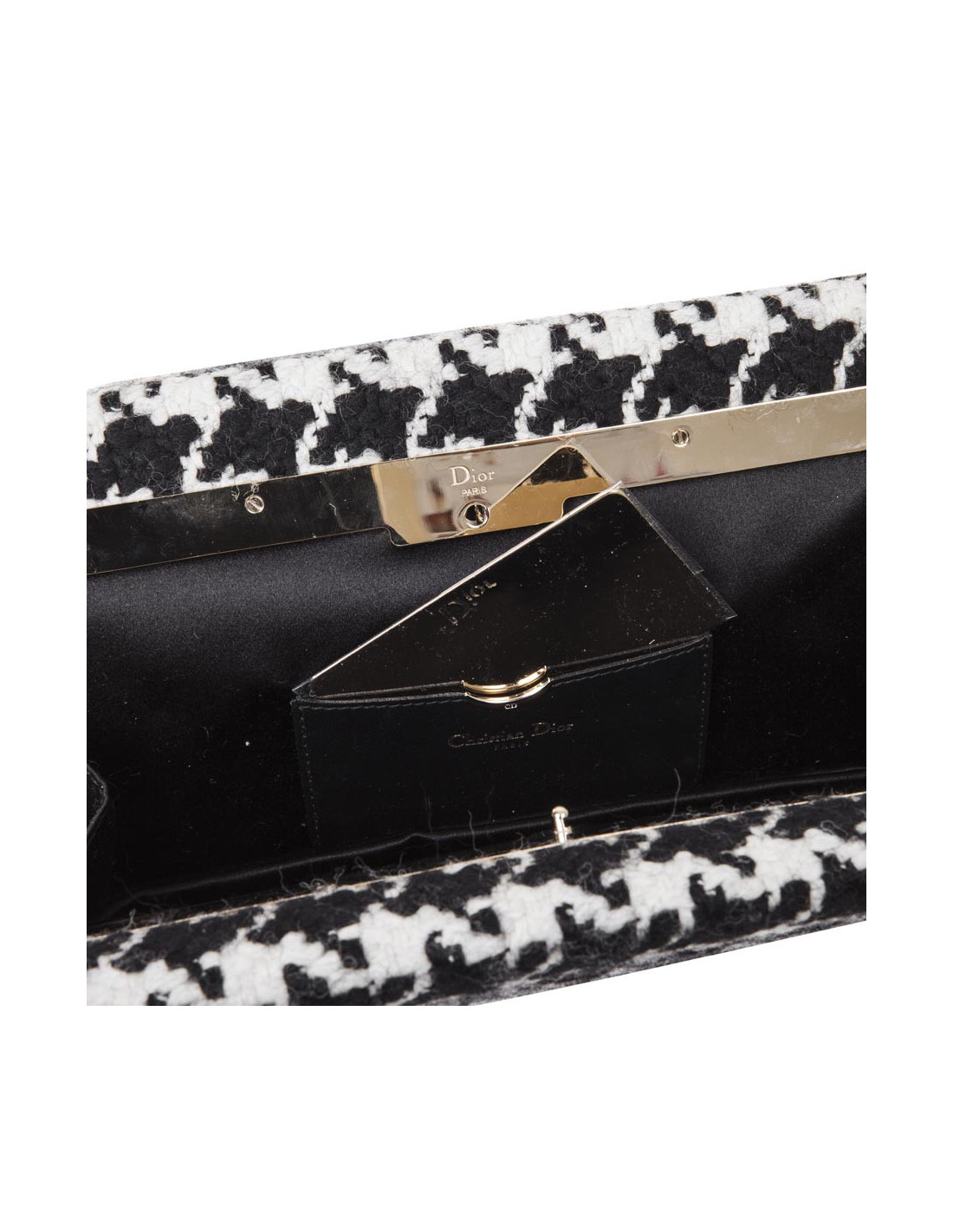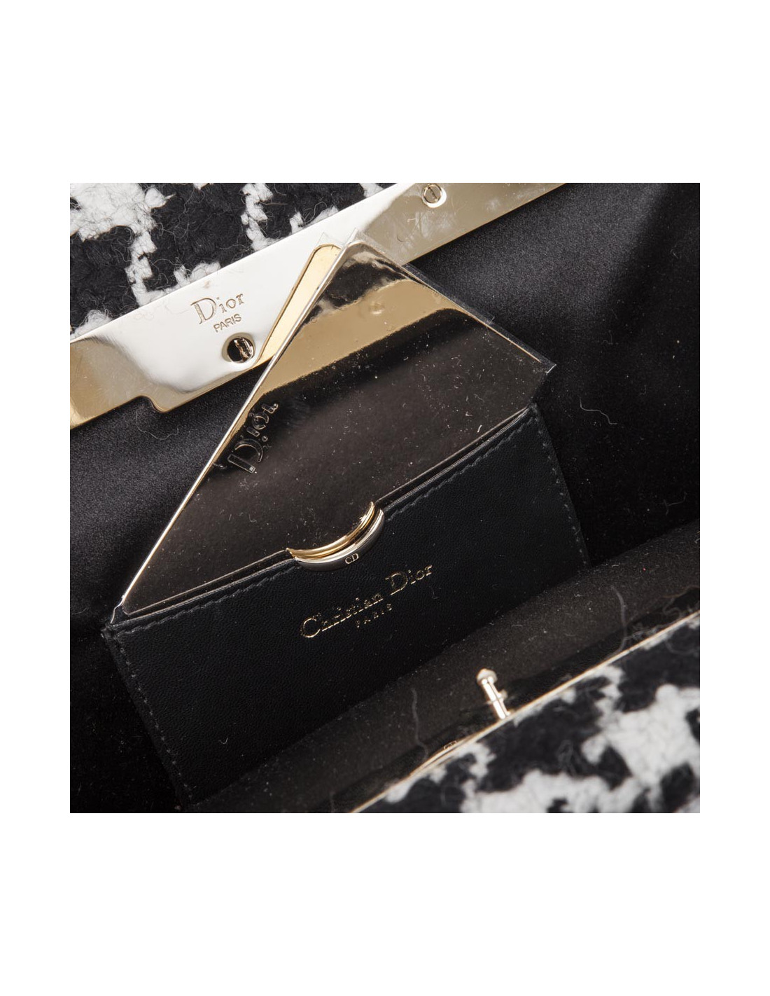 La pochette s'ouvre avec un système de poussoir sur le côté. L'intérieur est doublé de soie noire avec une fente dans laquelle se trouve un miroir avec une chaîne en métal articulée longue de 52 cm. Les initiales DIOR dorés sont gravées sur l'avant du sac.