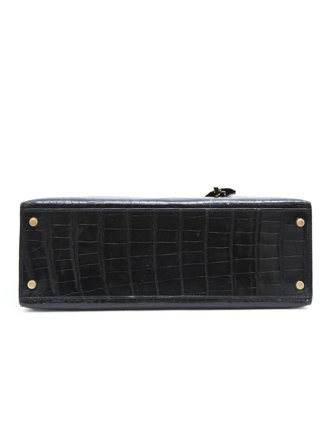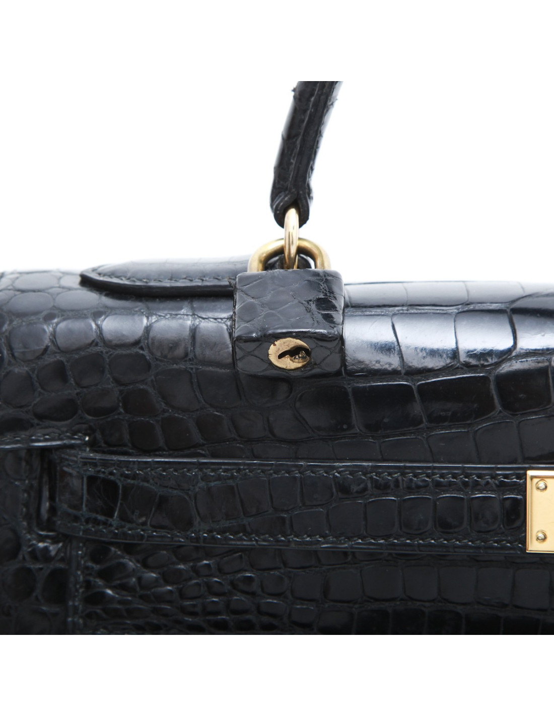 Vintage ! Sac "Kelly" taille 32 Hermès en cuir crocodile porosus noir (traces d'usage sur le cuir mais très peu visibles), avec clés, cadenas, tirette et clochette. Lettre G dans un rond (1977). Accastillage en métal doré (micro-rayures).