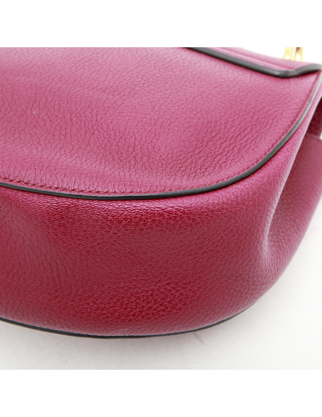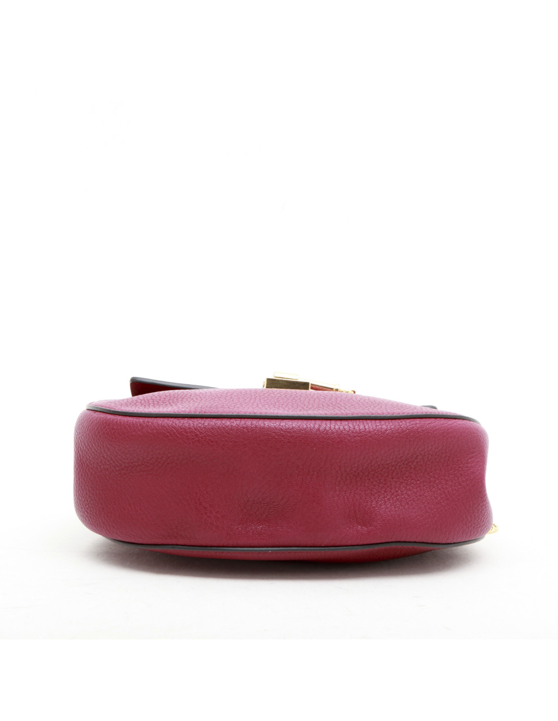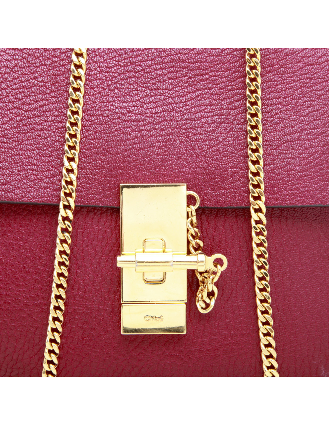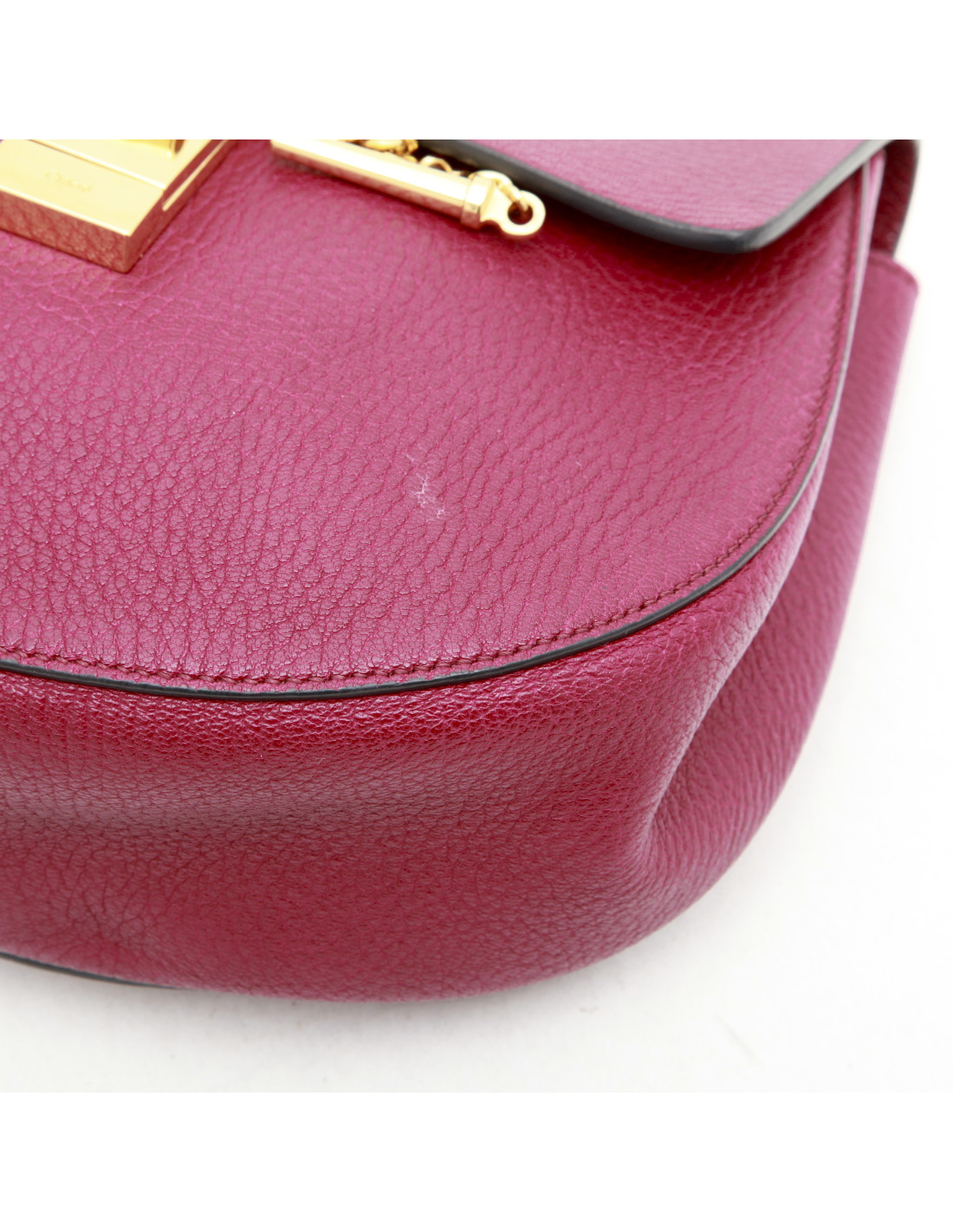 Sac à main Chloé, modèle Drew, couleur framboise, en cuir grainé. La chaine est dorée. L'intérieur est en suède beige. Il se prote à l'épaule ou crossover. 106 cm. Made in Italy. En très bon état.
