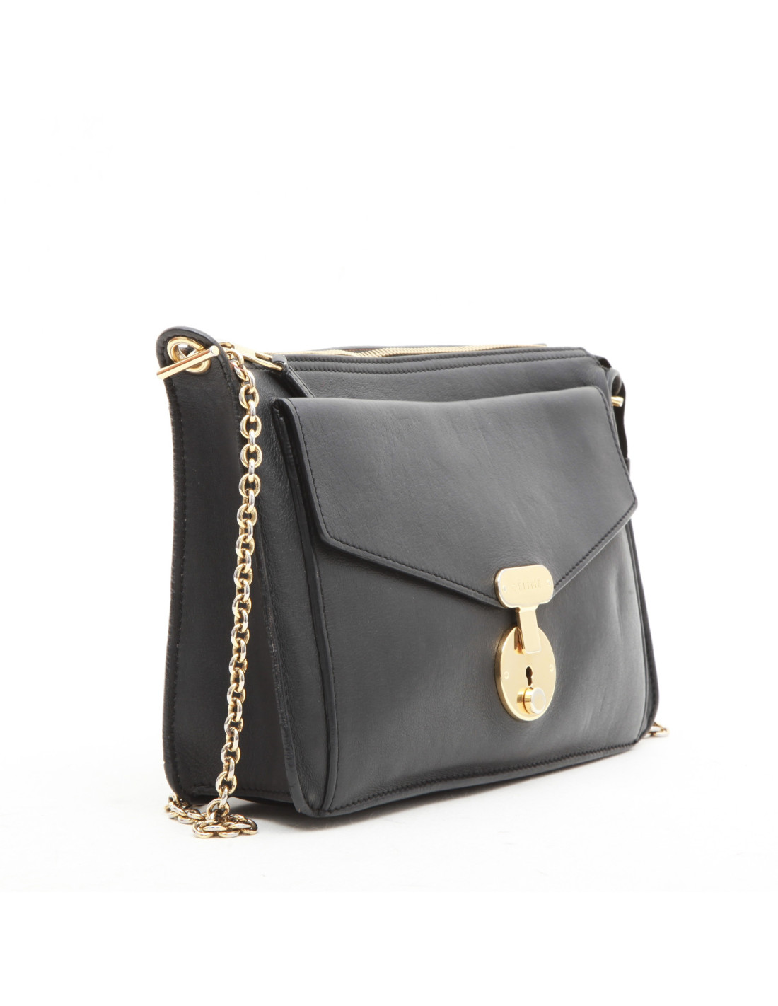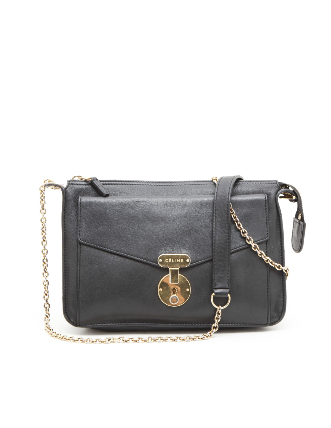 Sac pochette Céline, en cuir lisse gris foncé, avec une poche à l'avant ayant une serrure. Elle a la tirette, la clochette et la clé. Ferrures dorées.