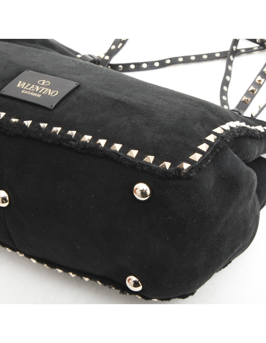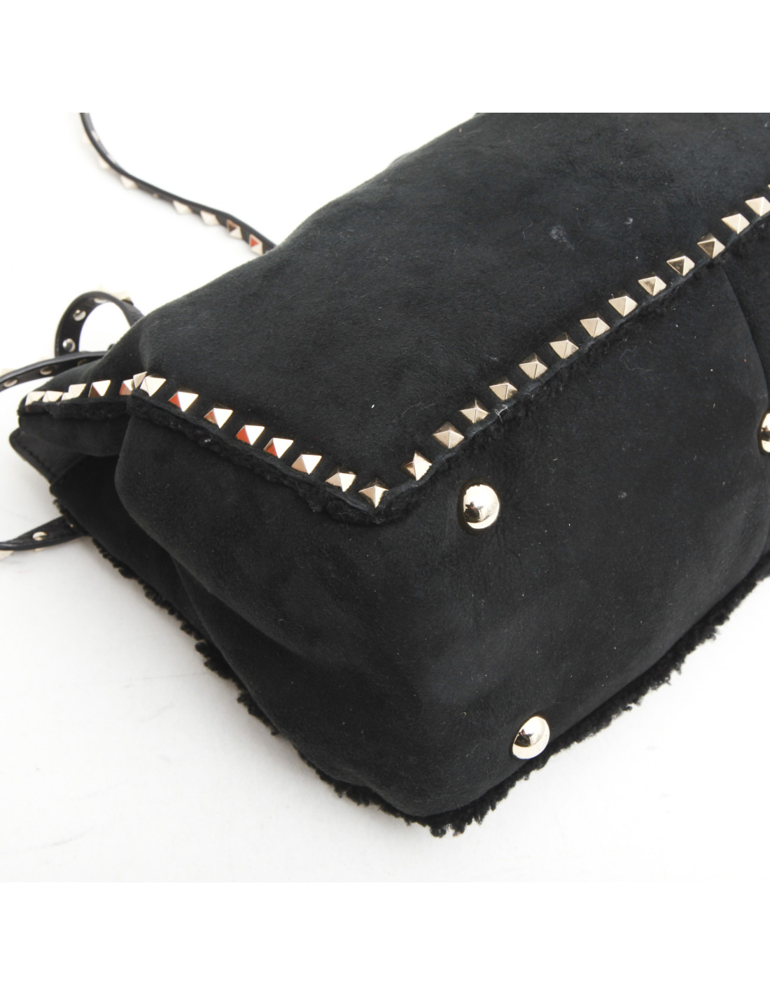 Sac Valentino Rockstuds peau retournée noir avec clous dorés, l’extérieur est donc en suede noir et l’intérieur est mouton noir avec une poche zippée et deux fentes. Ce sac se porte aussi bien au bras qu’ à l'épaule ou encore en crossover.