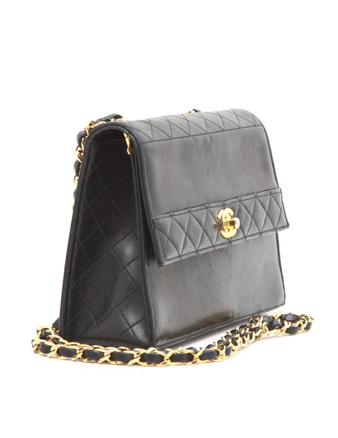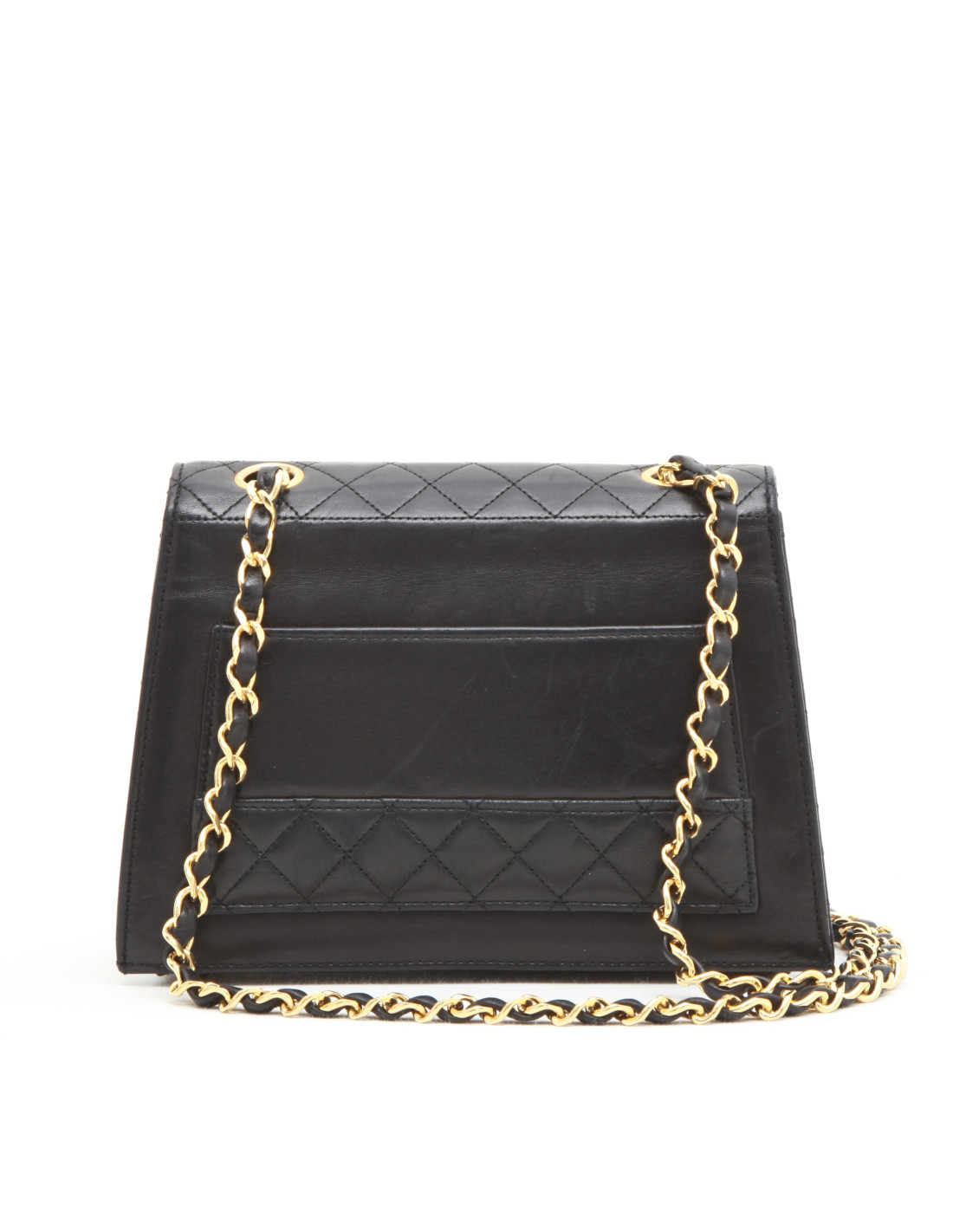 Ravissant sac Chanel Vintage, en cuir d'agneau lisse noir et matelassé par endroits. Un petit porte monnaie est dans la poche fermé par un bouton pression.