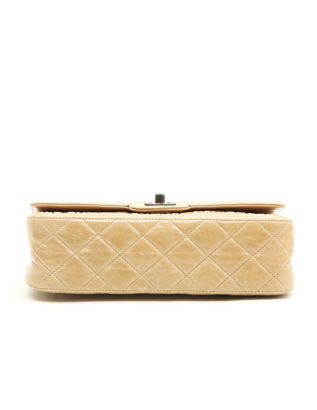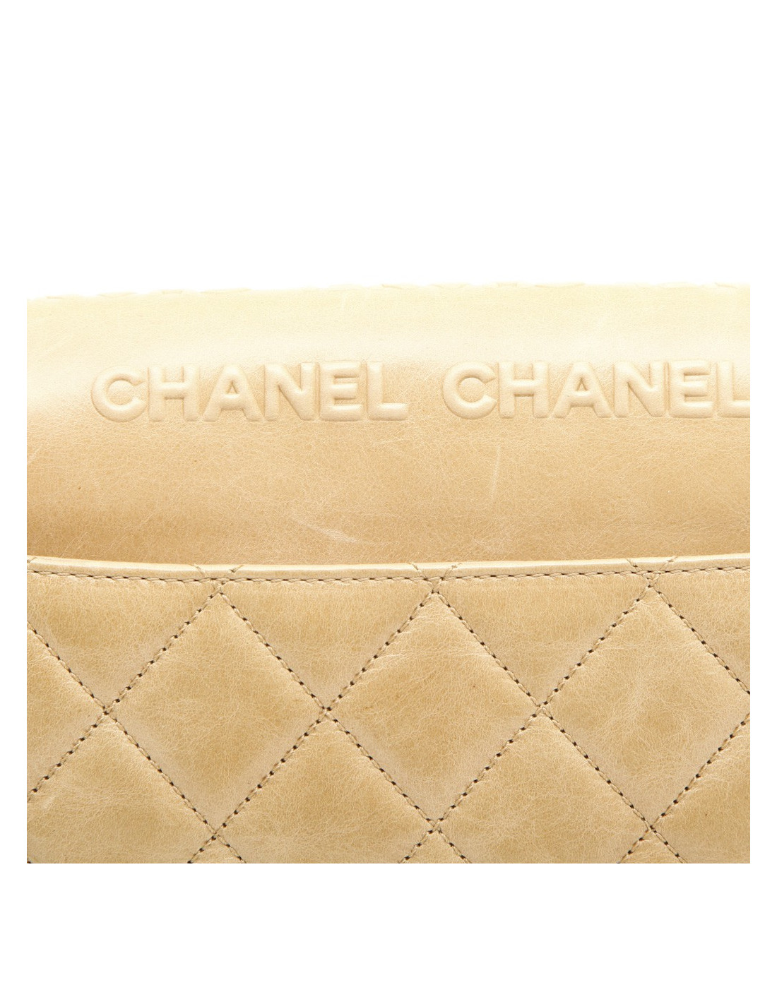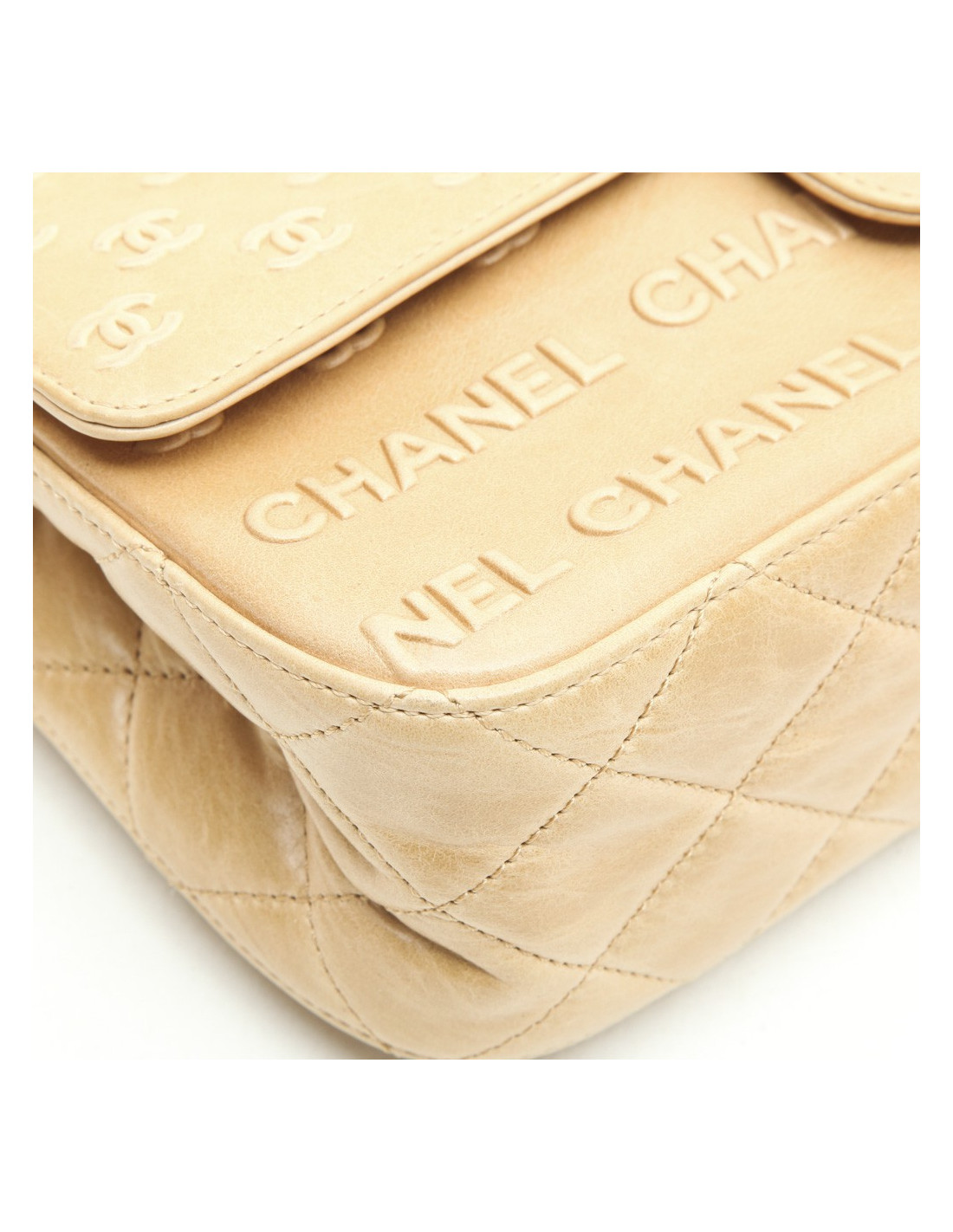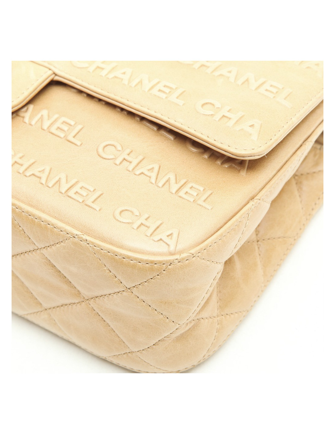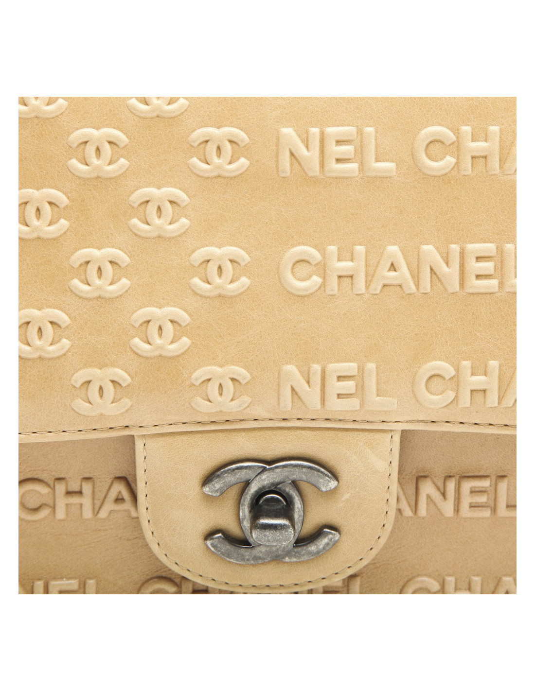 Sac 'Timeless' Chanel en cuir d'agneau embossé 'CC' et 'CHANEL' beige. Bijouterie métal argent vieilli.