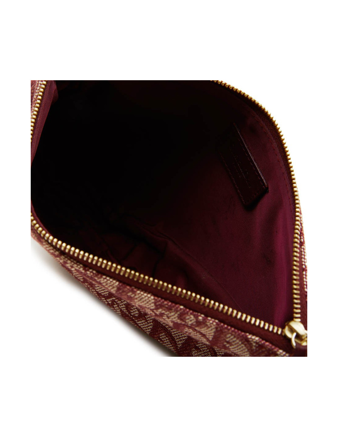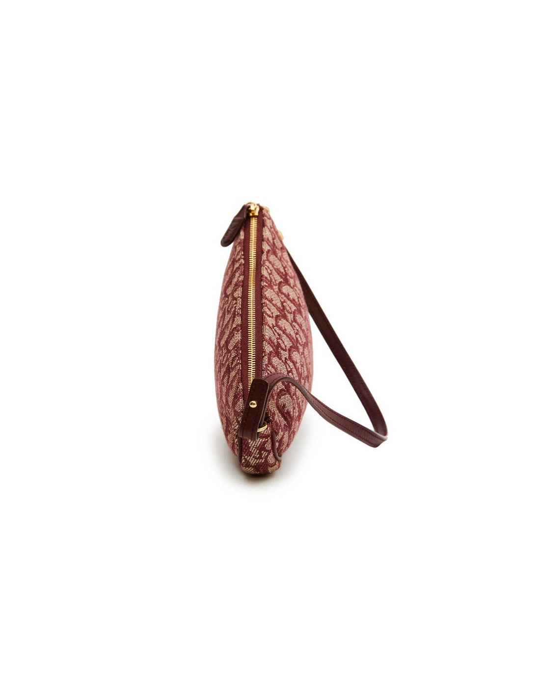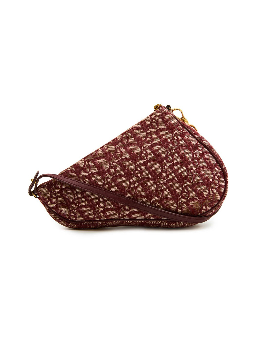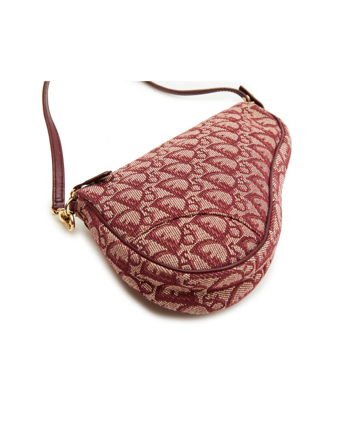 Sac "Selle" ou "Saddle" Christian Dior en toile monogram bordeaux. Fermeture à glissière. Se porte à la main. Bijouterie dorée. Made in Spain. Numéro de série : MC 0012 En très bon état.