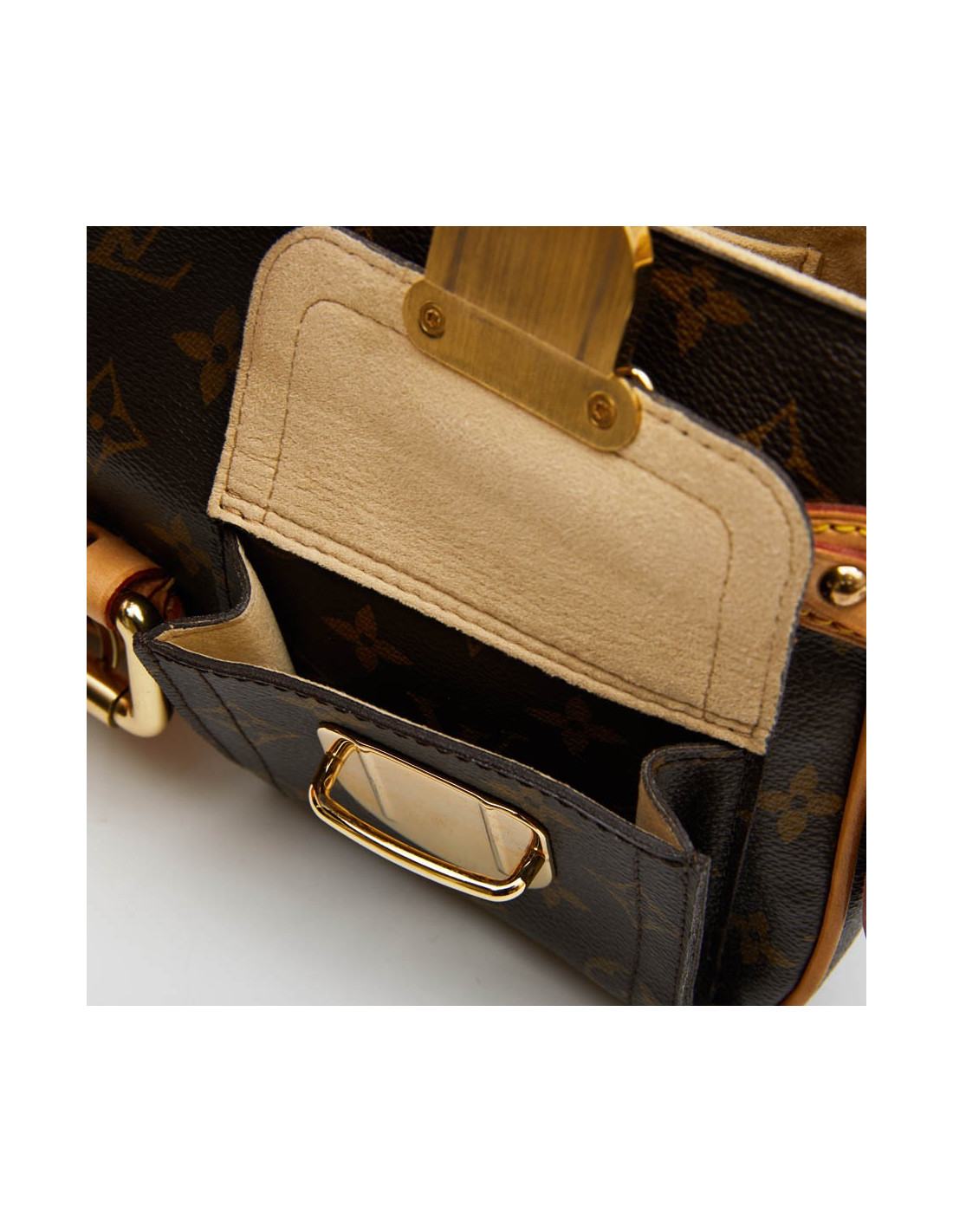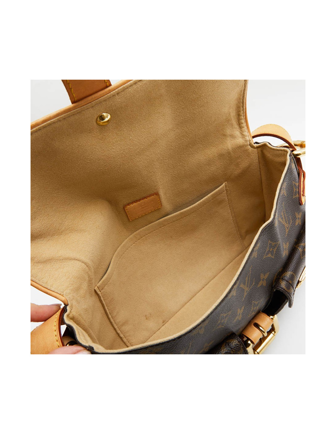 Ce sac de la Maison Louis Vuitton est en toile enduite Monogram marron. La bijouterie est en laiton doré. Les finitions sont en cuir de vache. Il est doublé en suède beige, une poche plaquée à l'intérieur. Il a deux poches à l'extérieur. Il est en très non état général. Légère patine des coins , de l'anse et micro rayures sur la bijouterie. Traces de stylo à l'intérieur du sac.