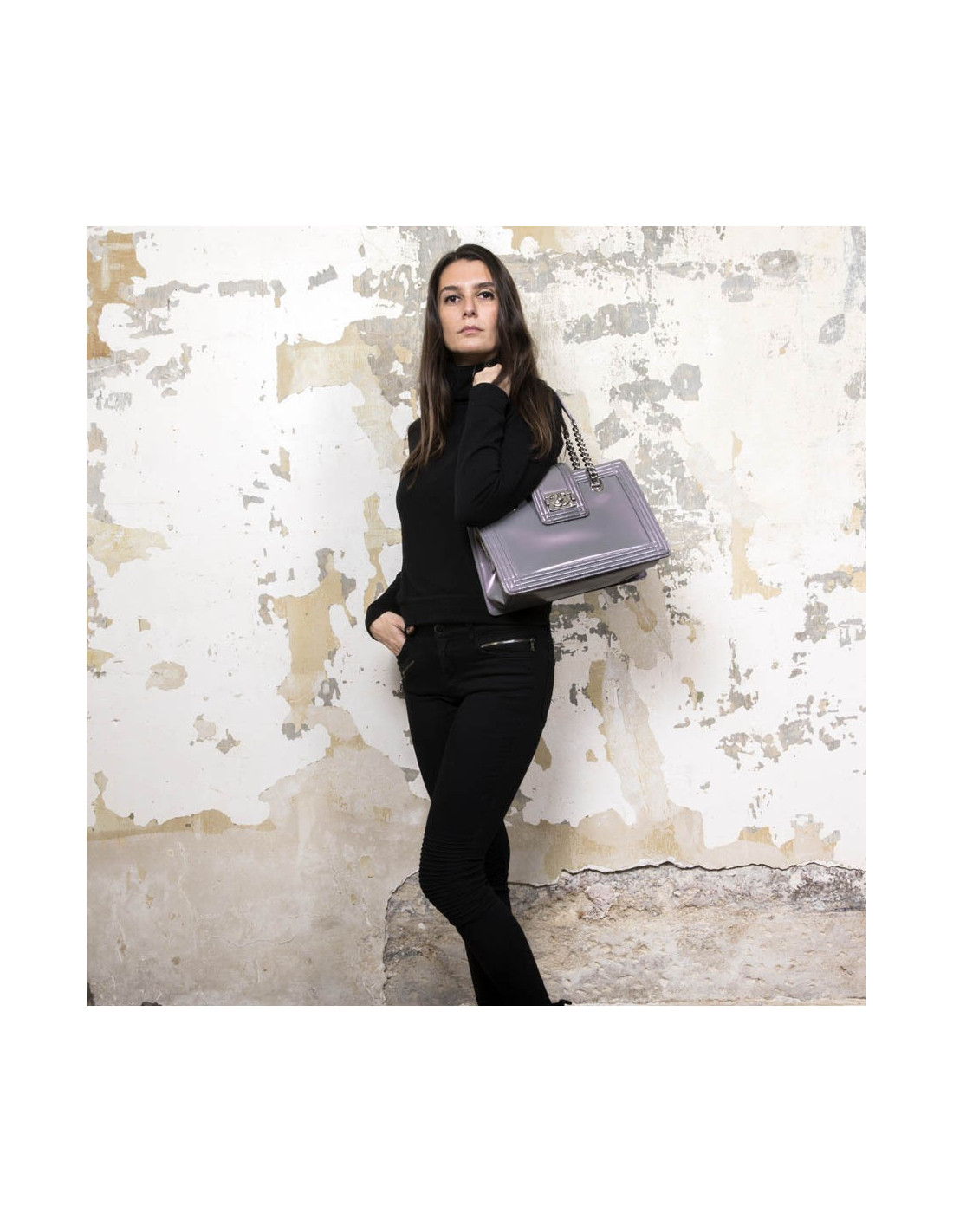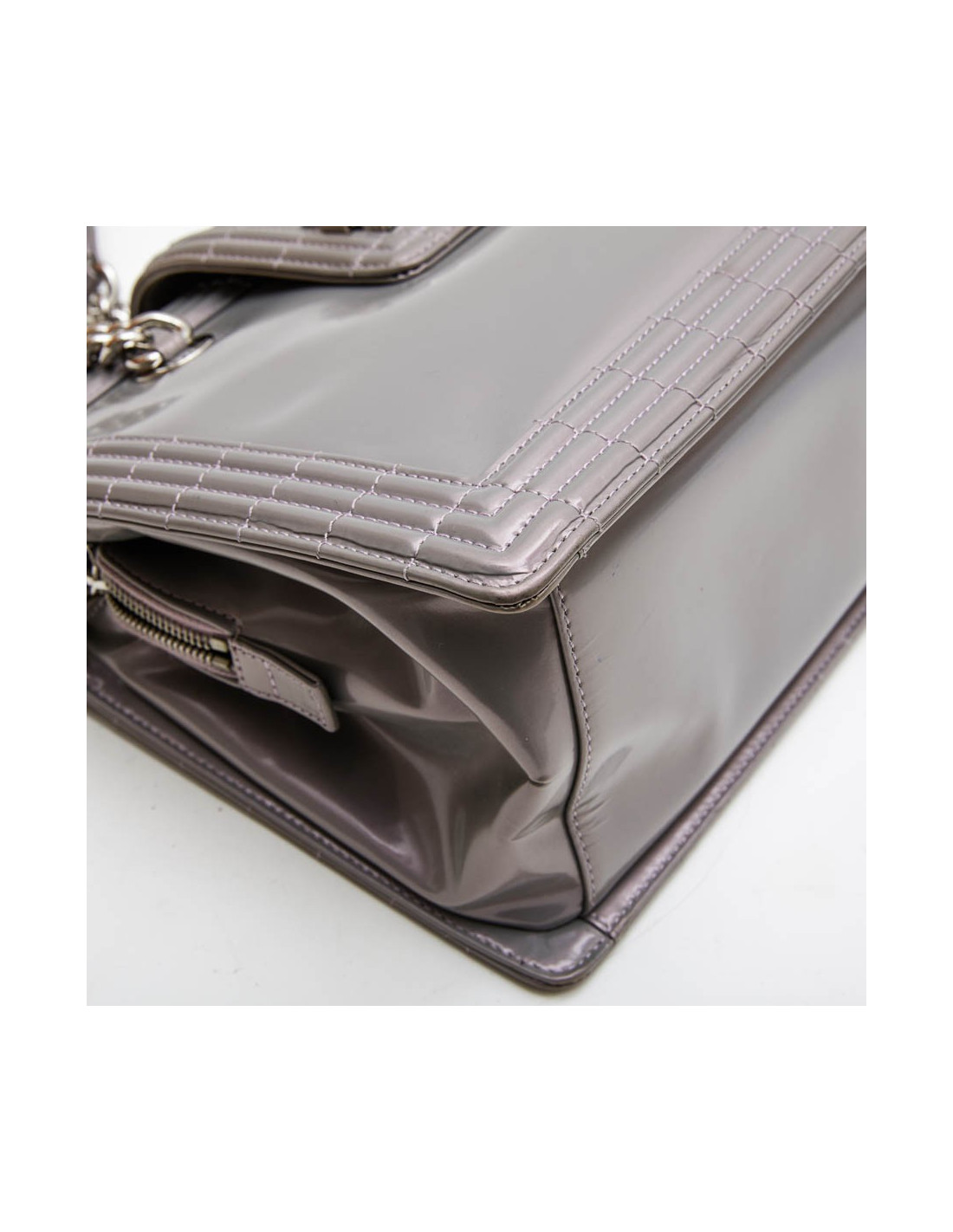 deteriore Sac "Boy" CHANEL cuir verni gris semi mat à reflets mauve