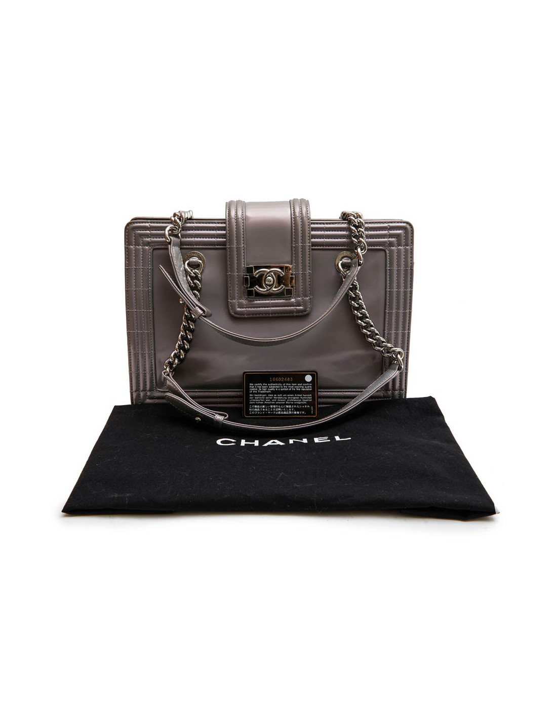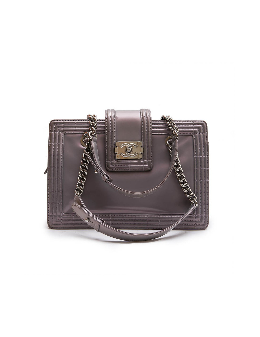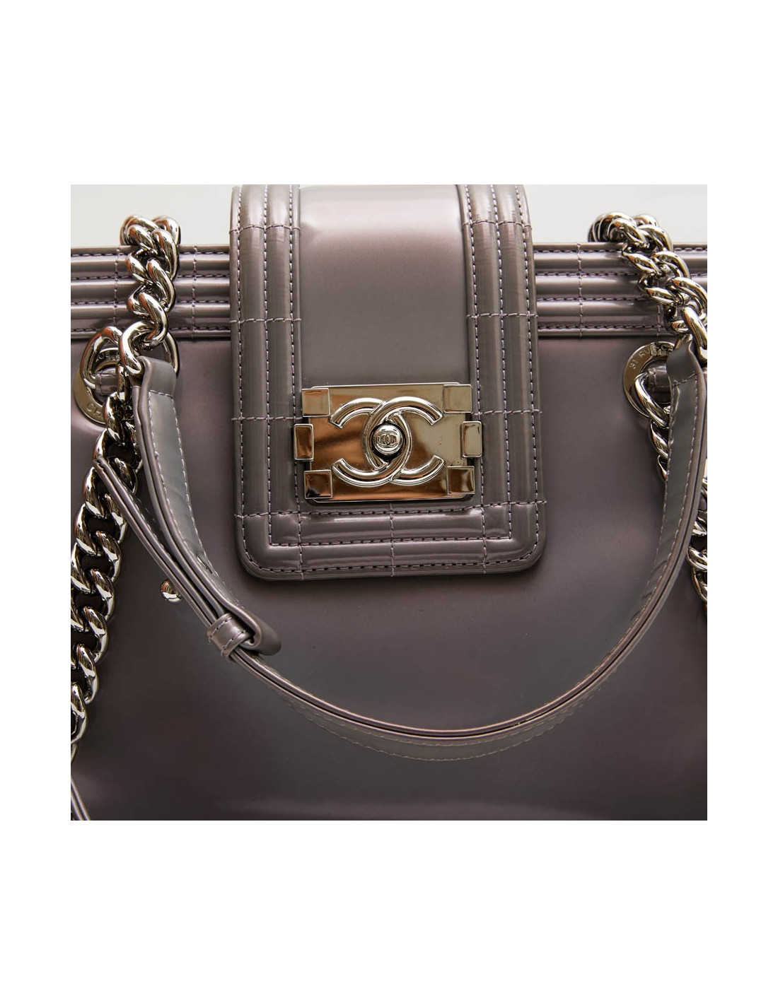 Sac cabas modèle "Boy" Chanel en cuir verni semi mat gris à reflets avec des nuances de mauve. Intérieur en toile gris. Trois compartiments dont un qui se ferme à l'aide d'une fermeture zippée ainsi qu'un poche zip. Porté main à l'aide de deux anses.
