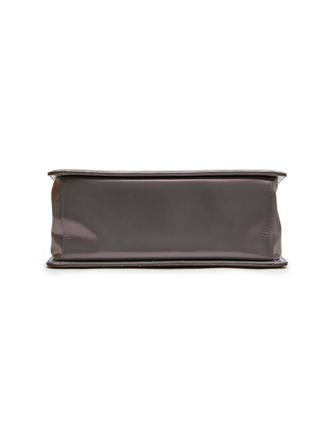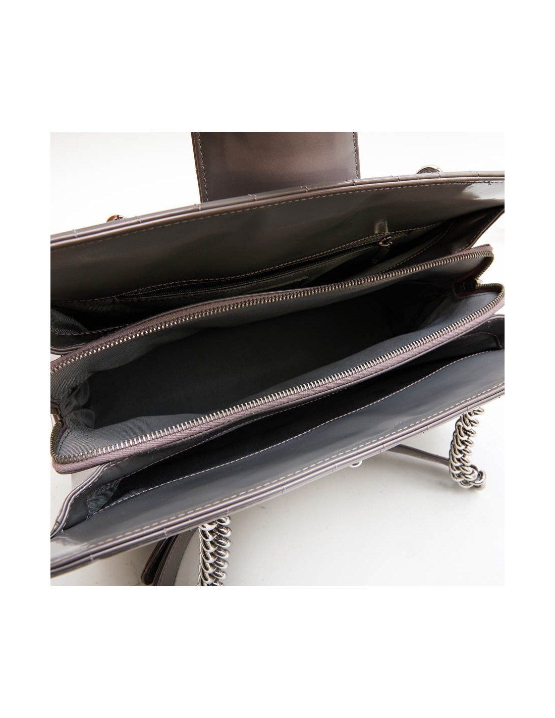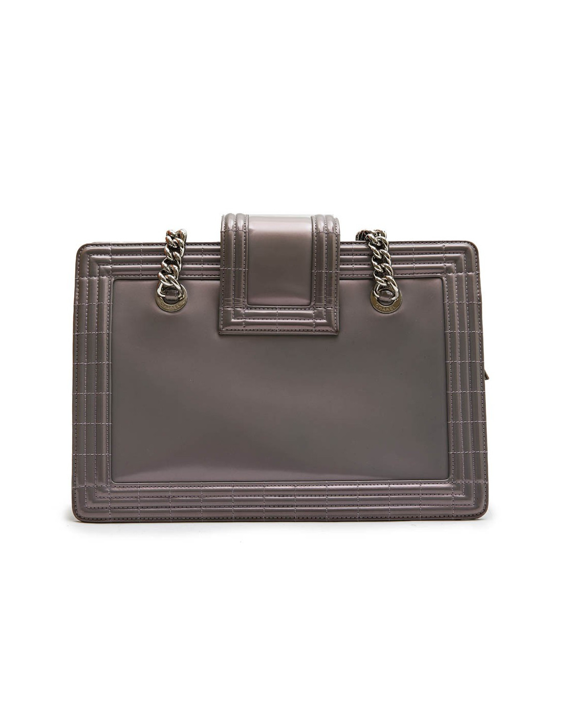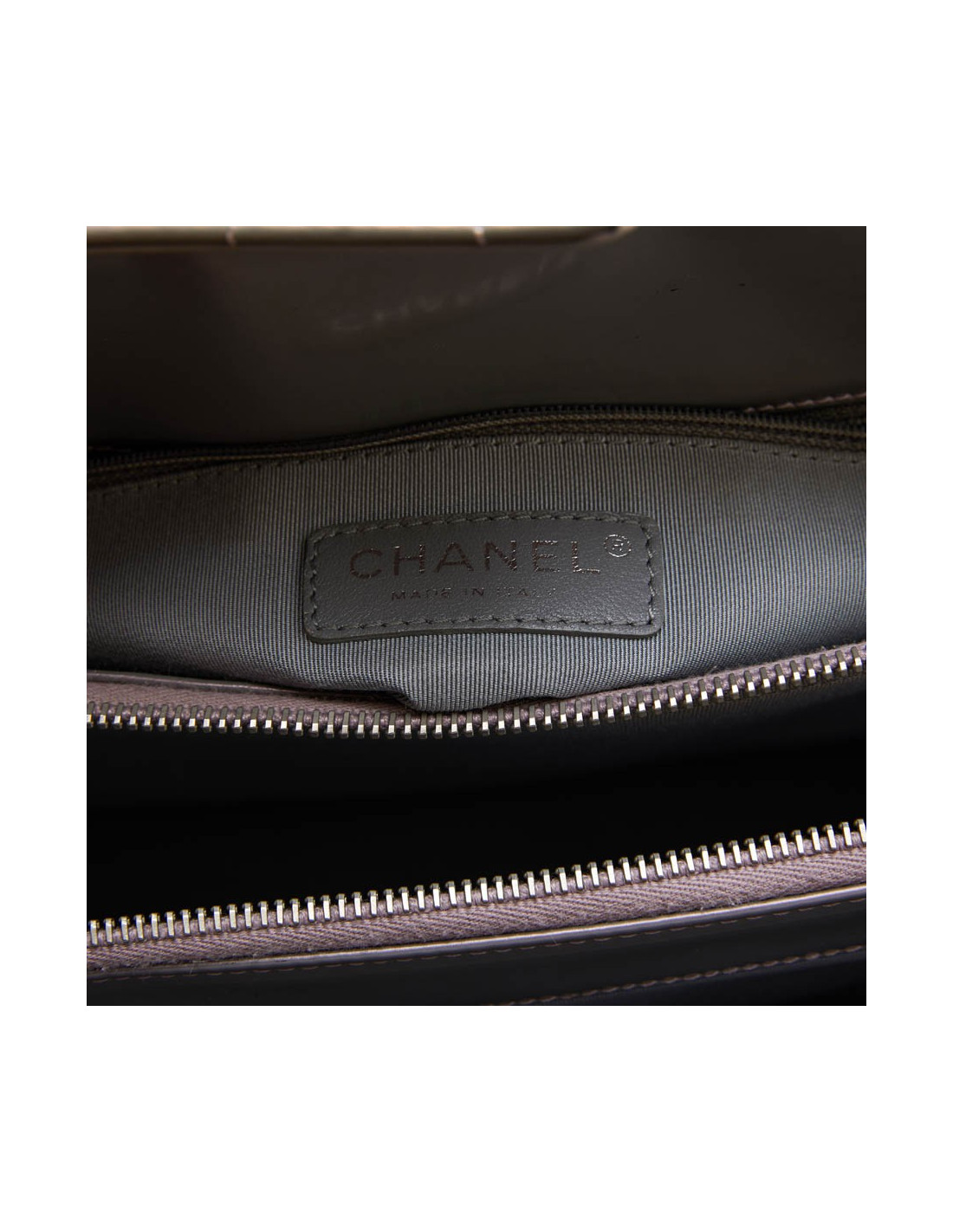 Sac cabas modèle "Boy" Chanel en cuir verni semi mat gris à reflets avec des nuances de mauve. Intérieur en toile gris. Trois compartiments dont un qui se ferme à l'aide d'une fermeture zippée ainsi qu'un poche zip. Porté main à l'aide de deux anses.