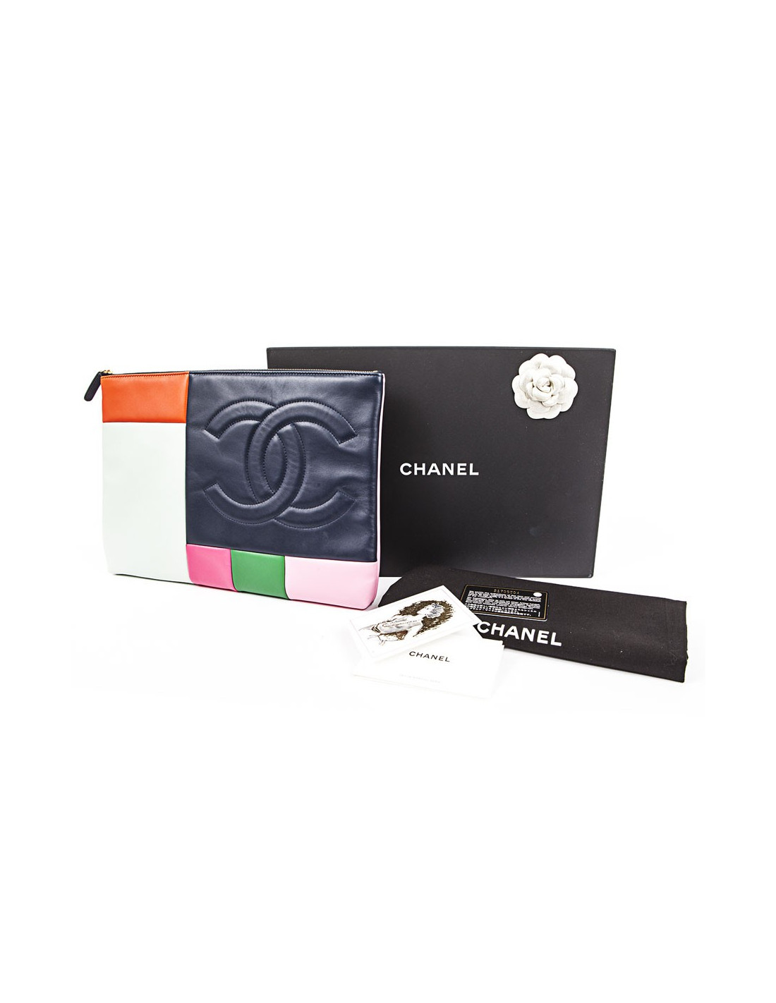 Pochette de la Maison Chanel en cuir d'agneau lisse multicolore. Fermeture zippée et dorée. L'intérieur est matelassé de couleur bleu. Hologramme: 217095... et sa carte d'authenticité.